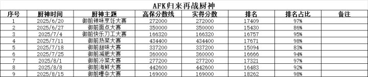 #厨神 AFK归来,再次征战厨神,尽量每次都做到刚好高保线,大致帮助了解御前高保人数及比例