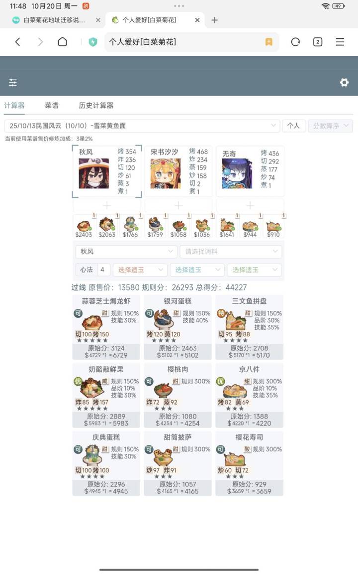 参考了p2这位的计算器,我的三个厨子全修炼,无心法盘(最后一个厨子也可以换没修炼的吕布,非常极限),仅供参考