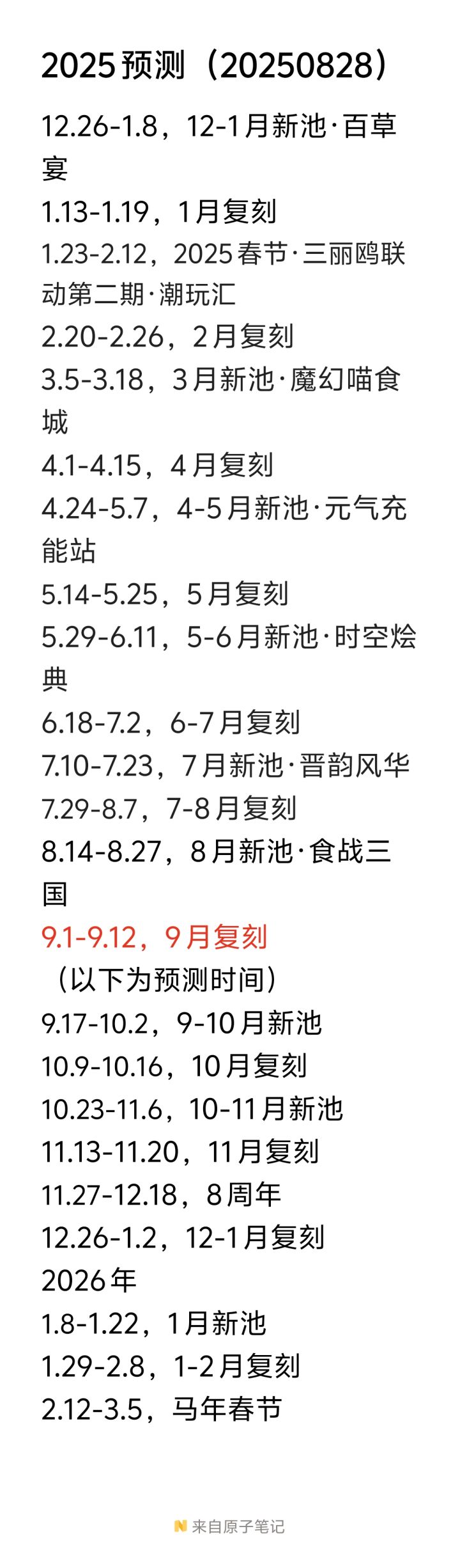 12.26-1.8,12-1月新池·百草宴1.13-1.19,1月复刻1.23-2.12,2025春节·三丽鸥联动第二期·潮玩汇2.20-2.26,2月复刻3.5-3.18,3月新池·魔幻喵食城4.1-4.15,4月复刻4.24-5.7,4-5月新池·元气充能站5.14-5.25,5月复刻5.29-6.11,5-6月新池·时空烩典6.18-7.2,6-7月复刻7.10-7.23