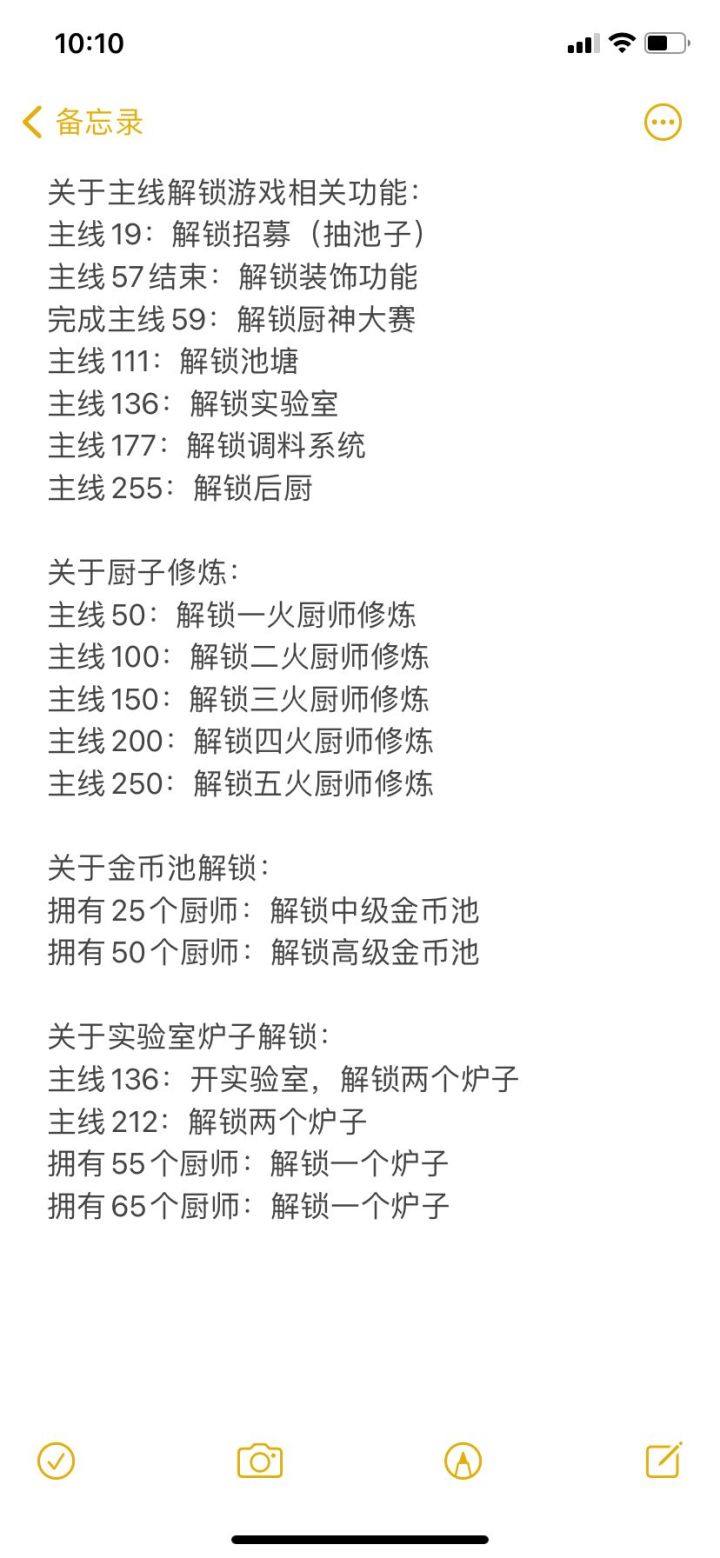 看了一下论坛置顶的攻略导航,其实各个角度的攻略基本都有了,那么就出一下一些容易被忽略的点吧,都是一句话的事【主楼不定时更新】目录A.开业B.采集C.实验室D.调料E.支线F.厨神G.修炼H.专精I.厨具J.其他先放个功能解锁的图供查阅吧A.【开业】0.爆炒所有任务都是【向上兼容】的。不论是主线,支线还是厨子的修炼任务,要求做二星以上的,2345星都可以,要求做优级以上