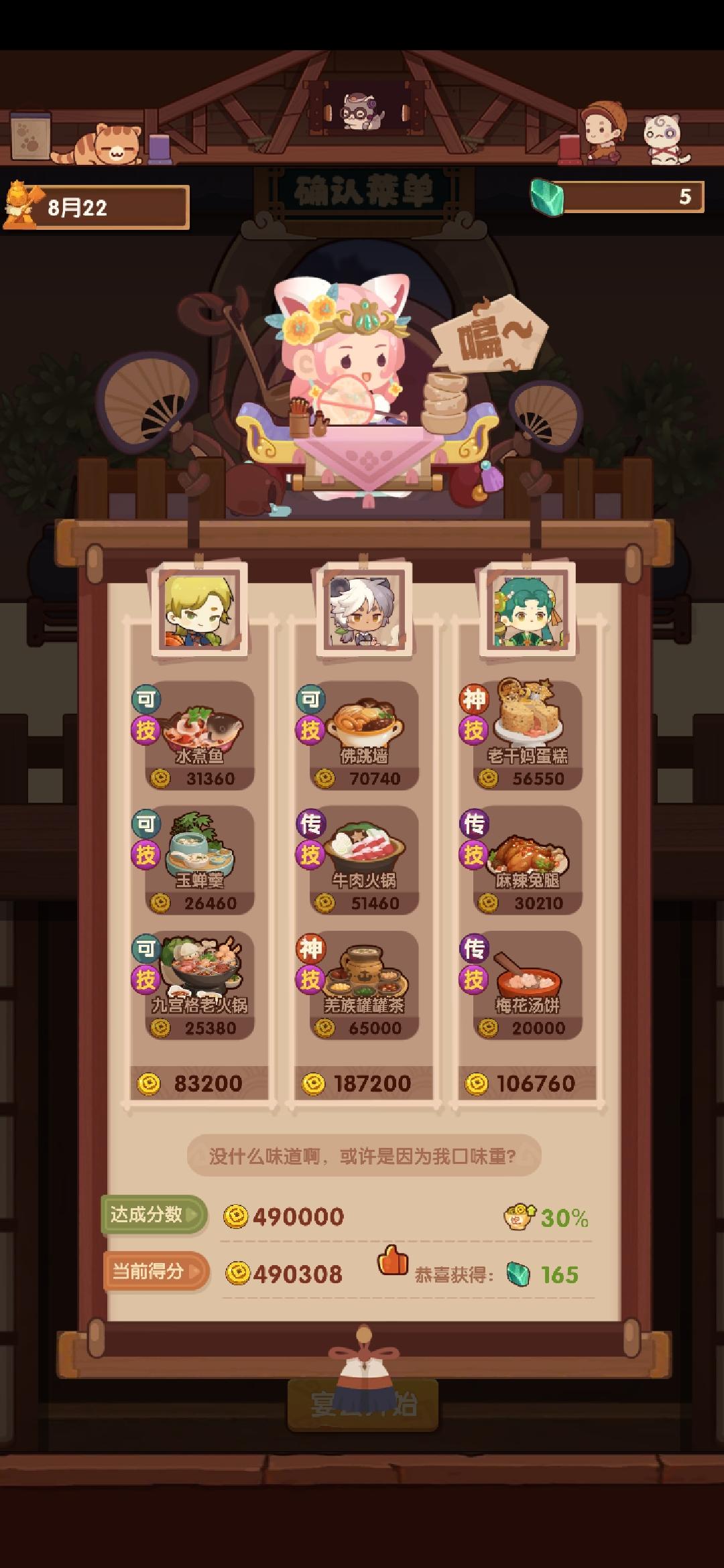 轮换关卡,乞丐版490000,两个5星厨师都只有2阶~😃