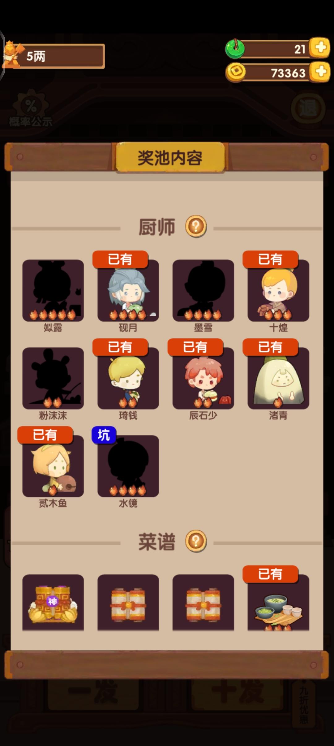 请问主题是获得所有的厨师就行,还是池子里包括菜谱之类的所有东西都得抽到才能获得?厨师里有一个坑总是抽不到,还能得到主题吗?谢谢各位大佬啦!
