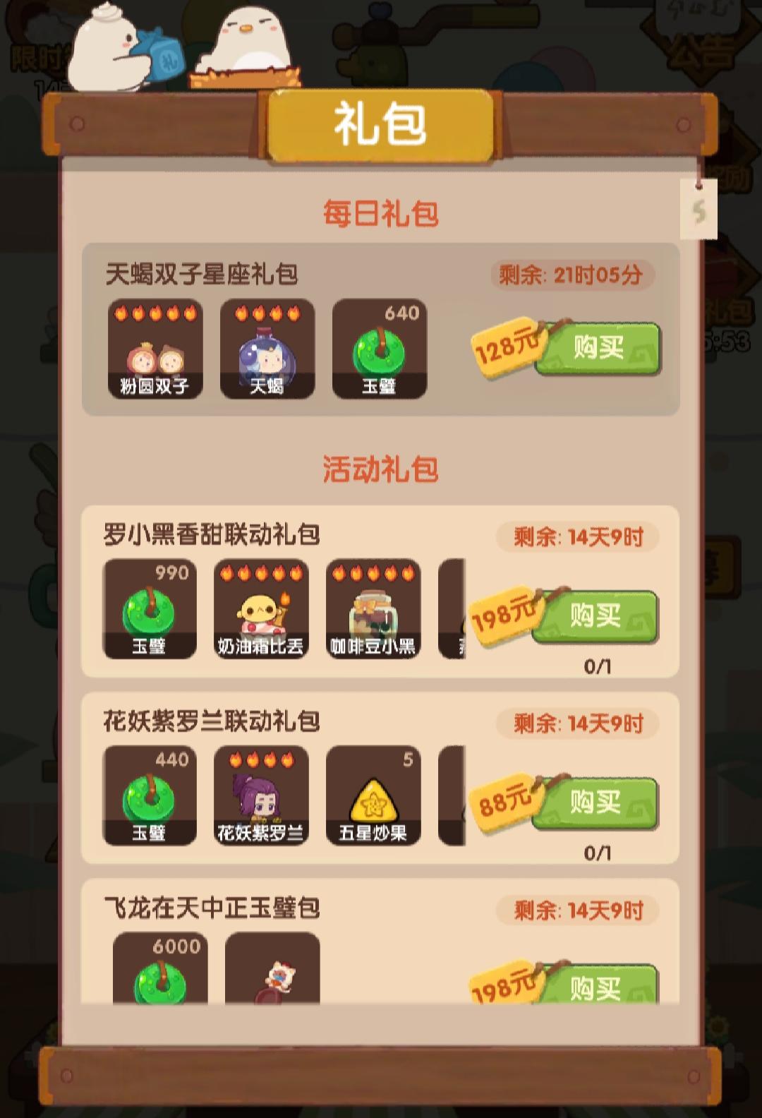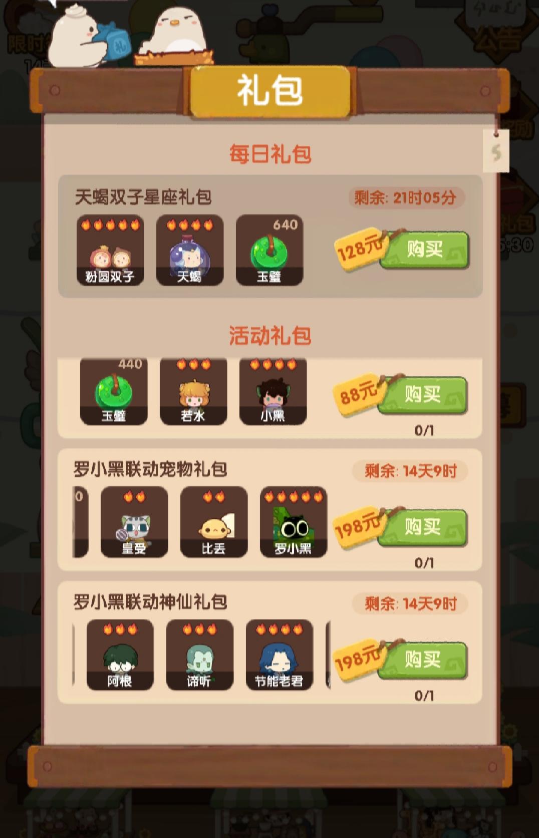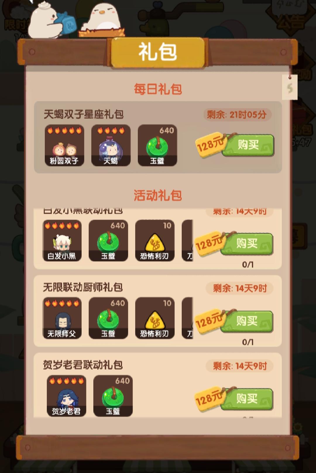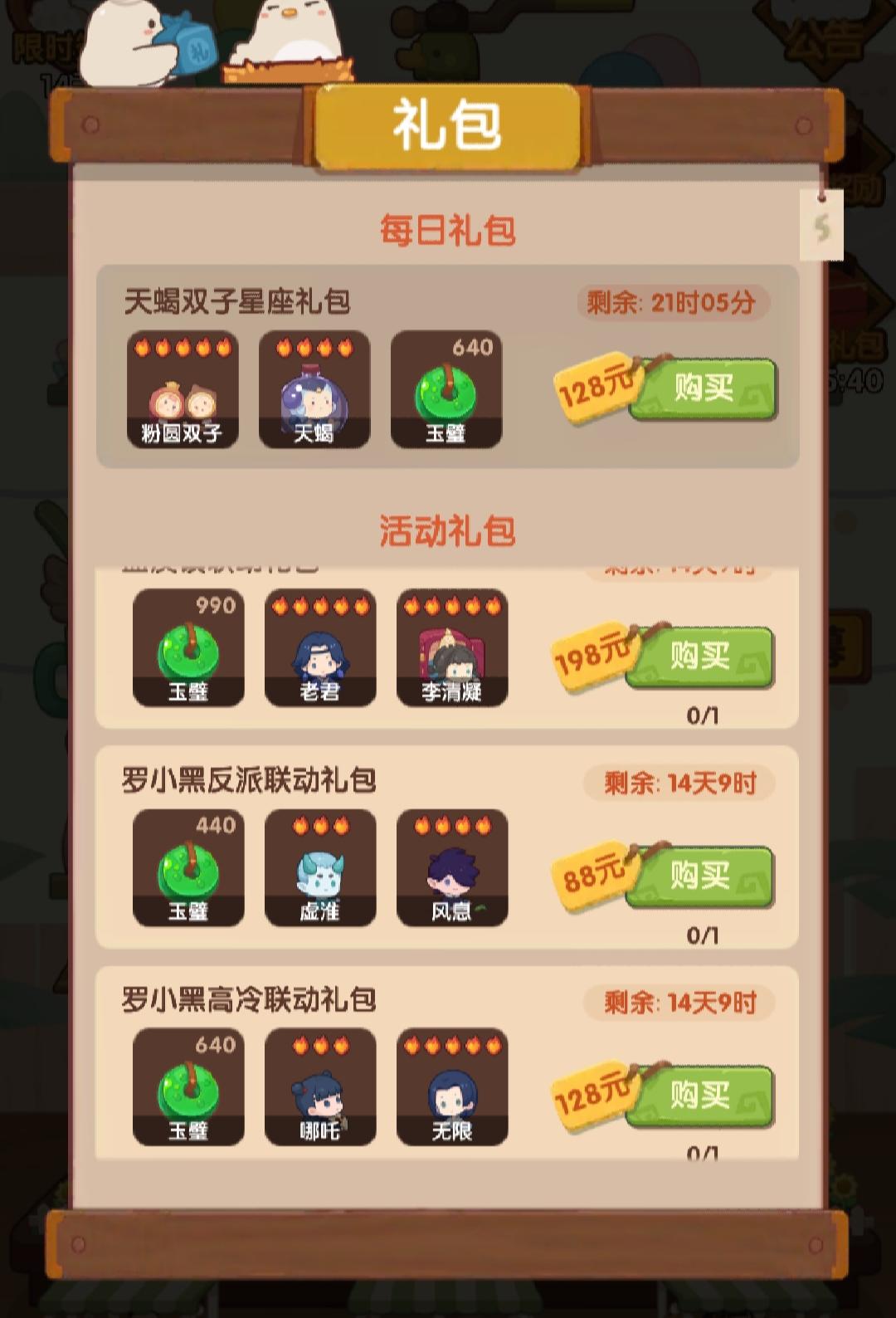我又来了!😊想问一下各位大佬,下面的联动礼包有哪些是值得买的,买的值的?(请在不用在意我的rmb的情况下说明,谢谢!)我看到好多人都有贺岁老君和白发小黑,不知道怎么样?