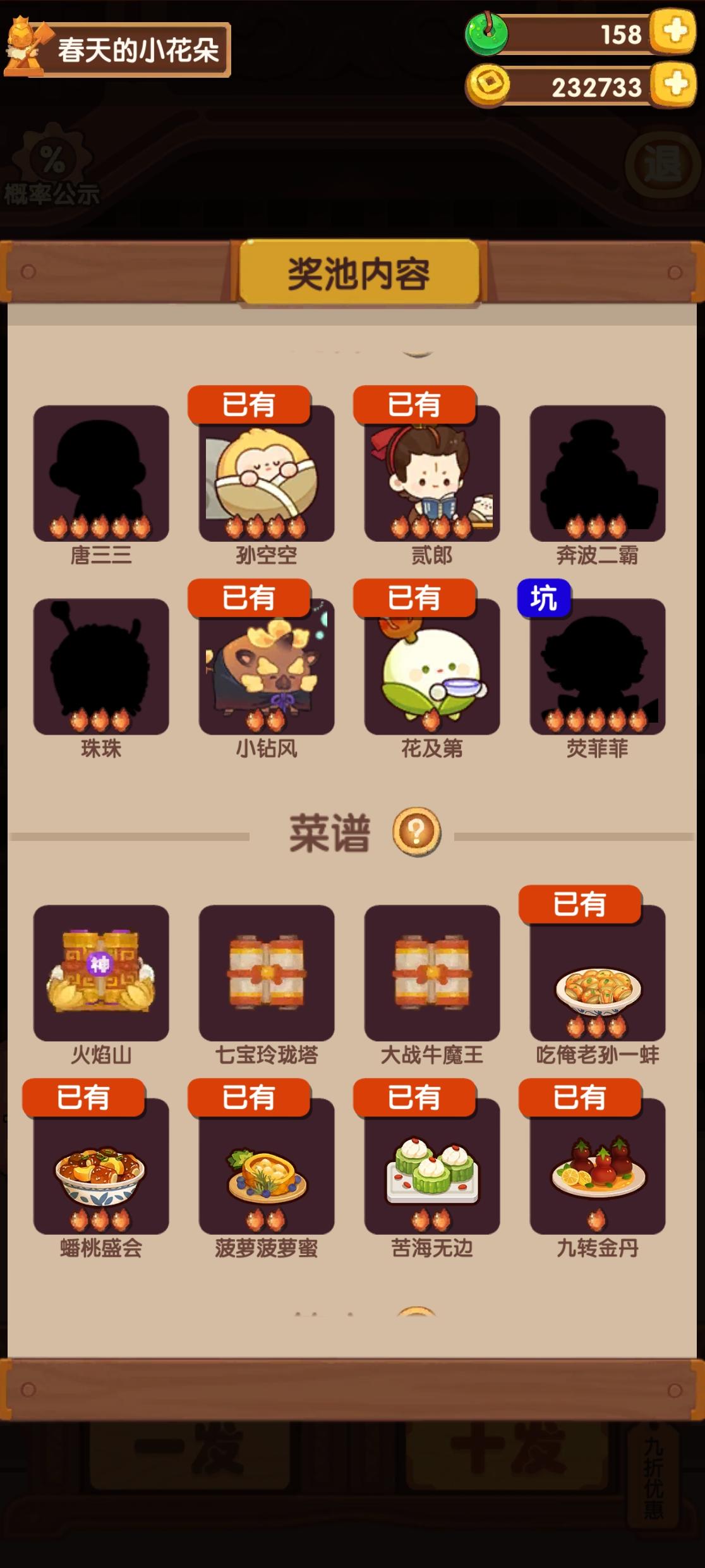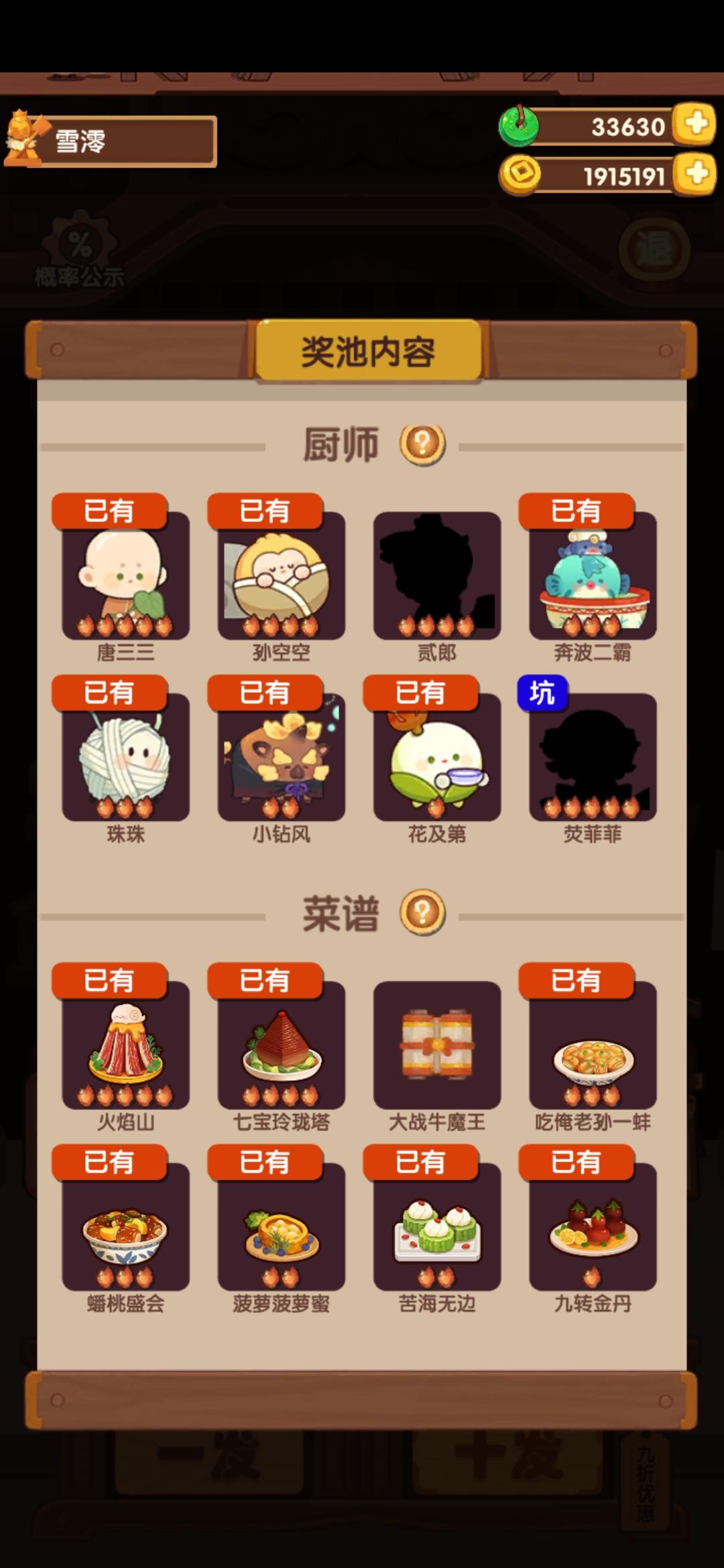 新池40发,98/114,厨师和菜谱各差一,二郎和大战牛魔王(坑和桌子先不管)在纠结补完情人节还是继续把这俩抽出来主要想要松鼠桂鱼,好缺恐怖利刃所以需不需要继续抽二郎和大战牛魔王?