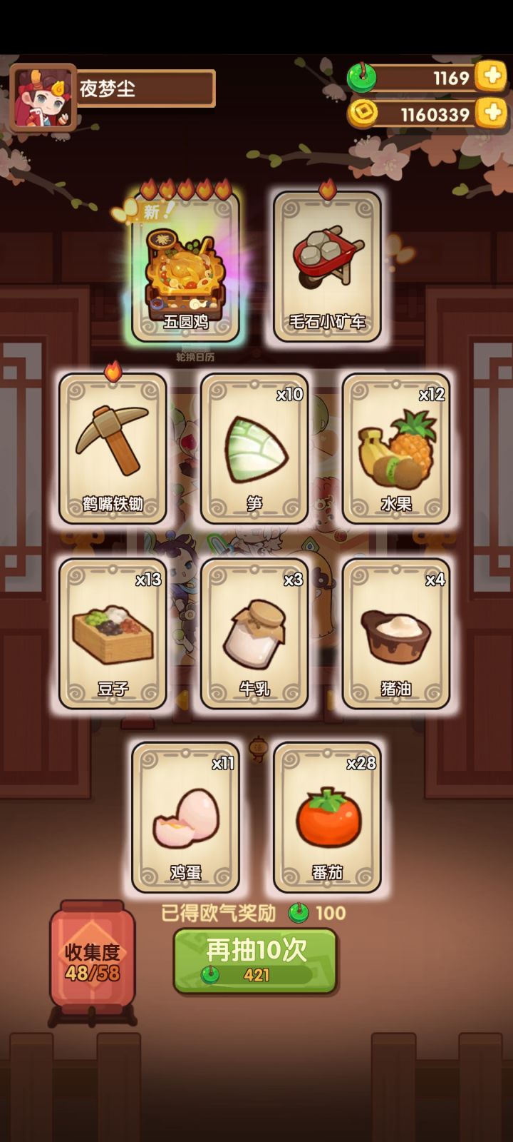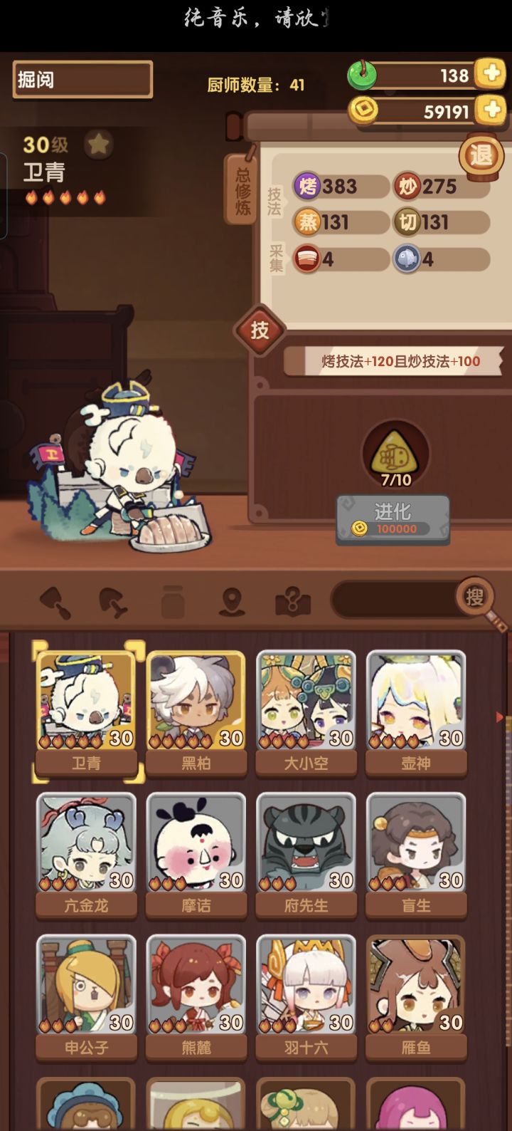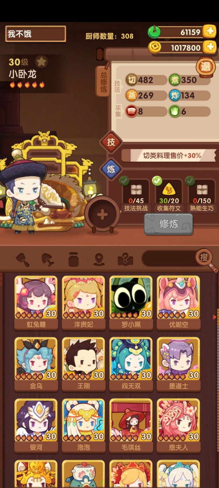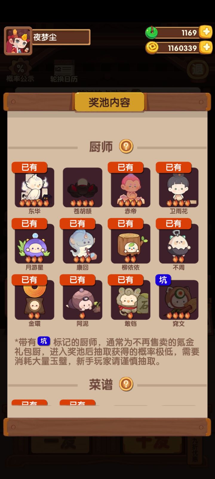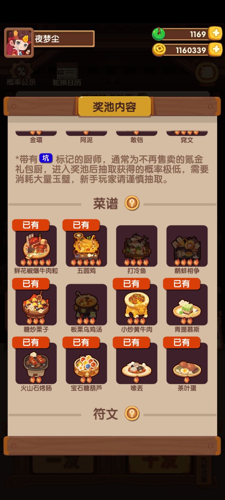 主线进度212,很缺铜符文,也没有太多+100点技法的厨具高级池现在的进度是15/35现在厨师做菜在刷限时任务的苦料理,等做完了应该会用卫青刷钱,这是我唯一一个能修炼的五火厨子我现在没有多少金币,不知道抽新手还是高级