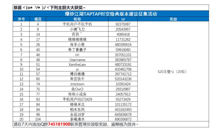 恭喜主厨获奖,请在7天内添加Q群745181908联系管理员领取奖励,逾期视为放弃主厨们大家好!为了更好地倾听各位主厨的声音,进一步优化游戏,我们特此征集您对【时空烩典】版本的真诚评论与意见。如果您对游戏有其他的优化与调整建议可在本帖下方回复,我们会认真的阅读并考虑大家的所有建议!活动时间:即日起-6月15日回复格式:分类:(玩法、功能、活动等)具体建议:活动奖励:活动结束后随