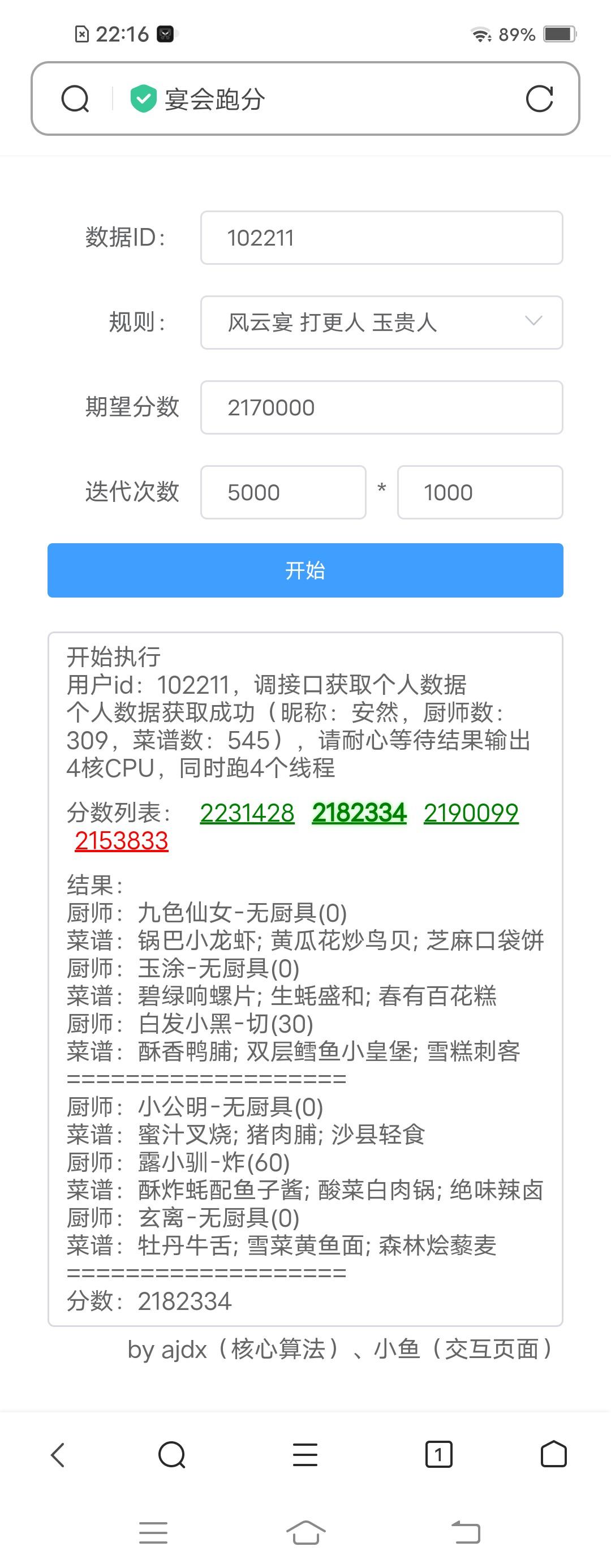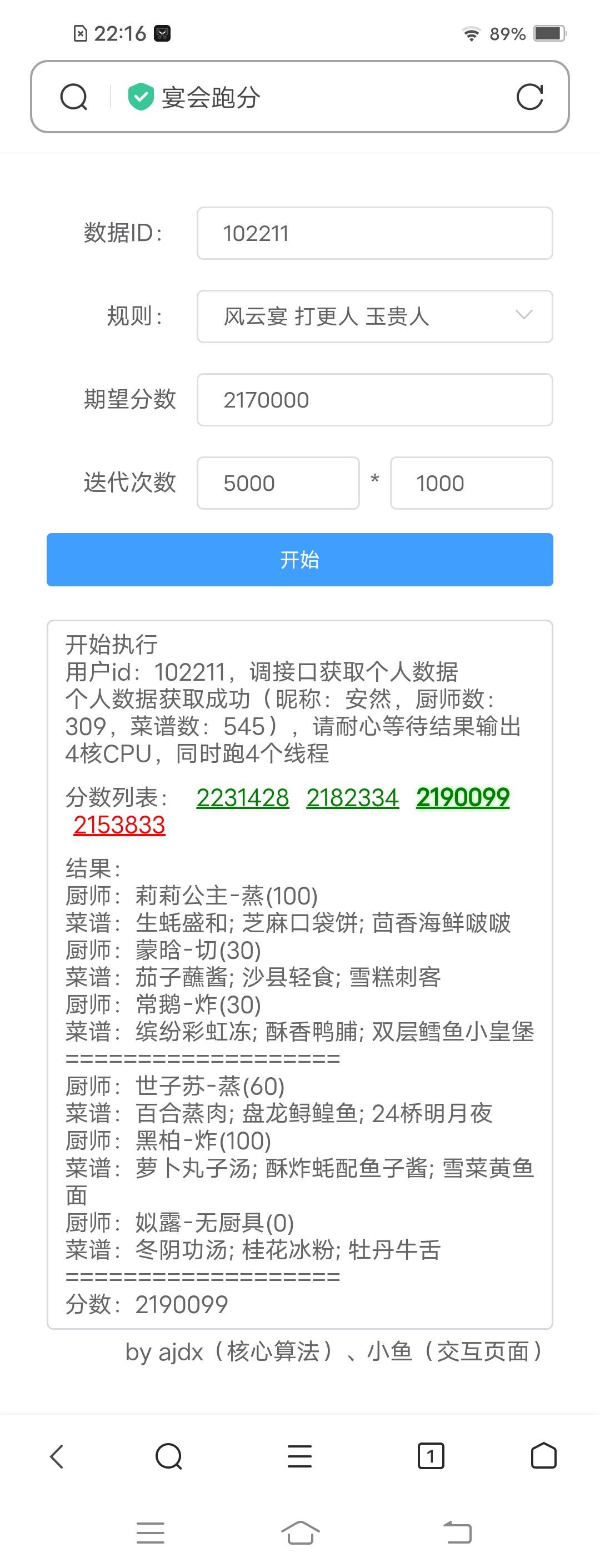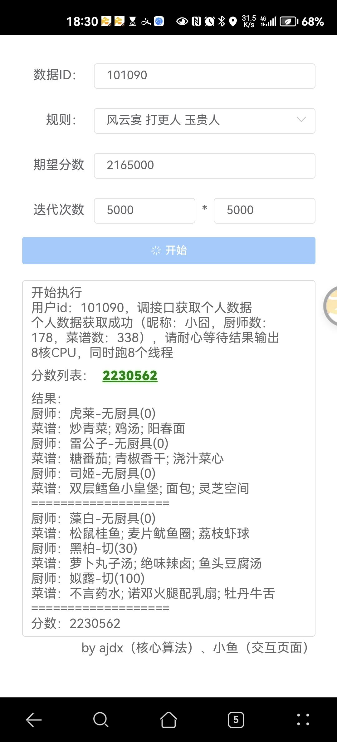 该说不说,这网页版也很流弊了!还帮我算了厨具加成!也就是我好多菜没专精,而且这一轮里最顶分的烛光晚餐、年夜饭还有蒸汽海鲜之类的大菜没有,不然应该也能过三百万+的那个档