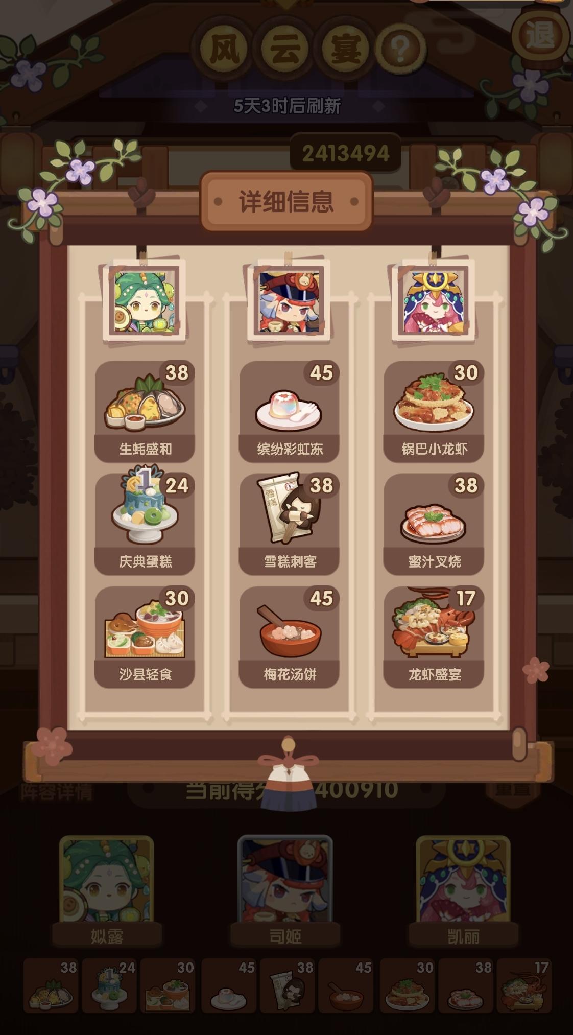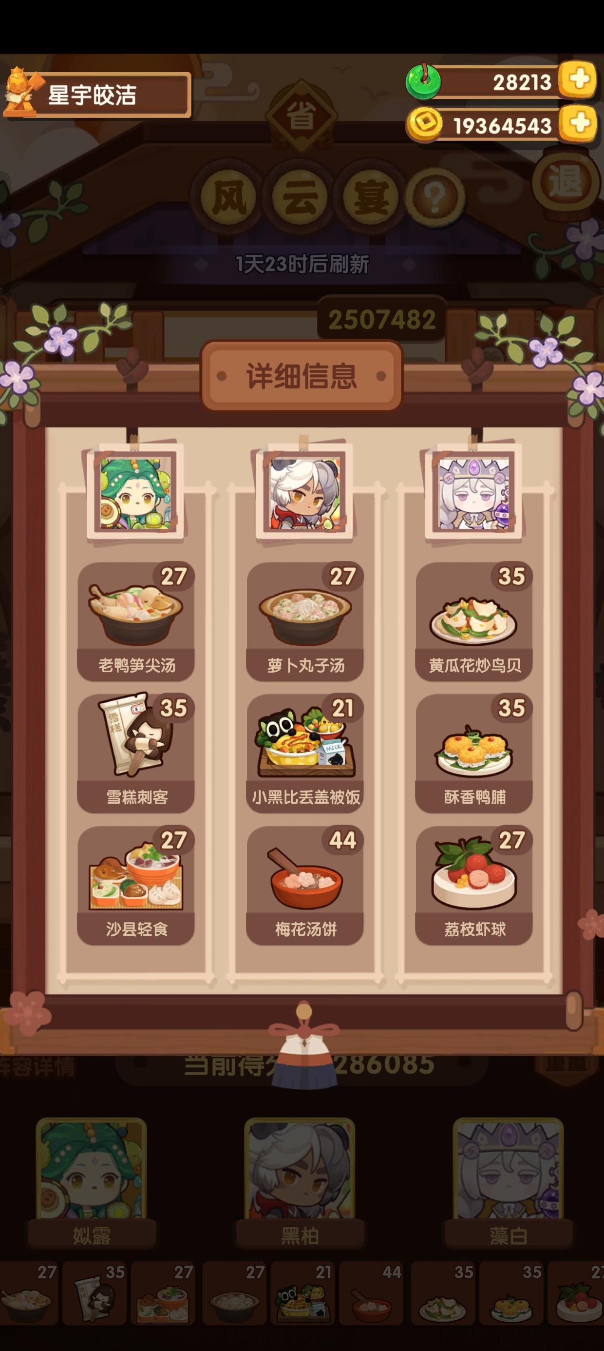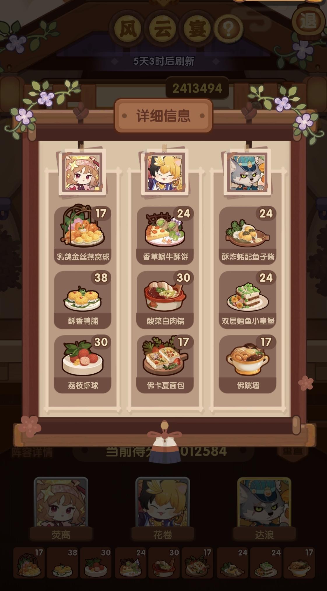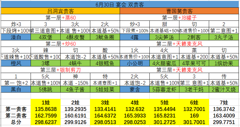 也是被逼没招了,碧池卡我腊味,只能另辟蹊径,年夜饭没有厨具硬凑,目前二火厨具,还能抗抗,宴会分是一期比一期高,让我们纯0氪怎么办,难道要动用珍藏的三火厨具么。话说回本作业,由于专精比较高,但是售价加成不高,份数上限也一般,不过厨具个人认为已经在二火范围内可以了,如果用厨具补分还需要上更好的厨具,这里小公明,蒙晗是纯售价厨具,藻白,橙风,黑白是补数值型厨具,而4露的罐子如果没上的玩家可以换纯售价能
