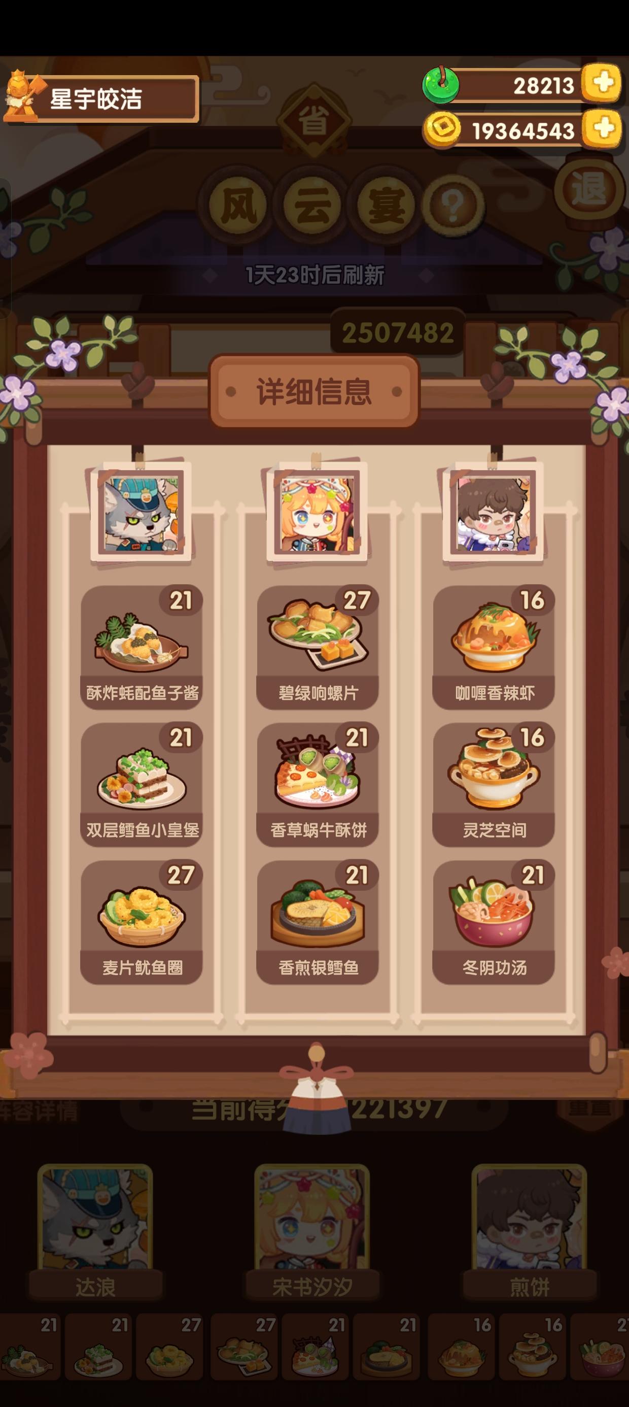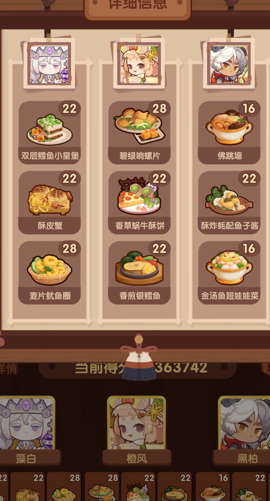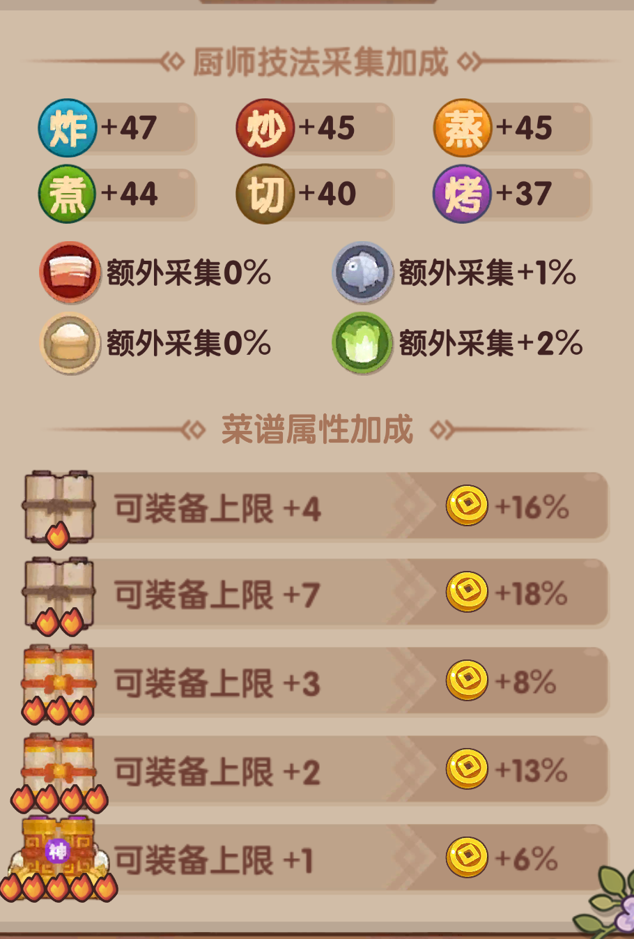 按顺序12,真的是随便凑的,厨具黑柏金斩骨刀,其他基本都因为之前的风云宴上了2火加售价菜谱,达浪藻白一无所有,姒露宇宙牌收音机,宋书千里收音机,煎饼不愿者上双钩杆,感觉硬凑最高档可能也行,但是要碎好多厨具,还是算了吧,就这样吧,第四档很满足了