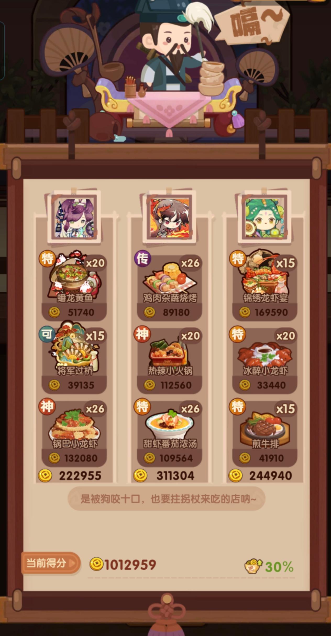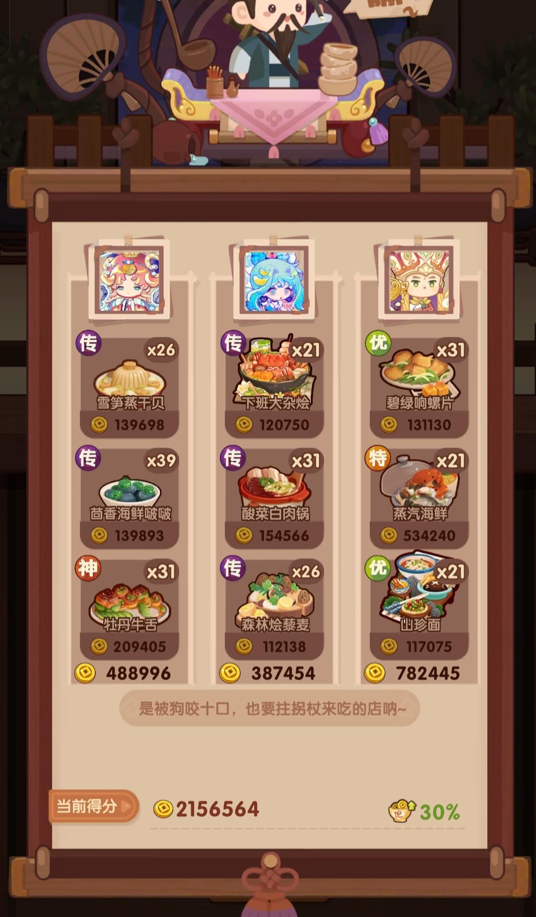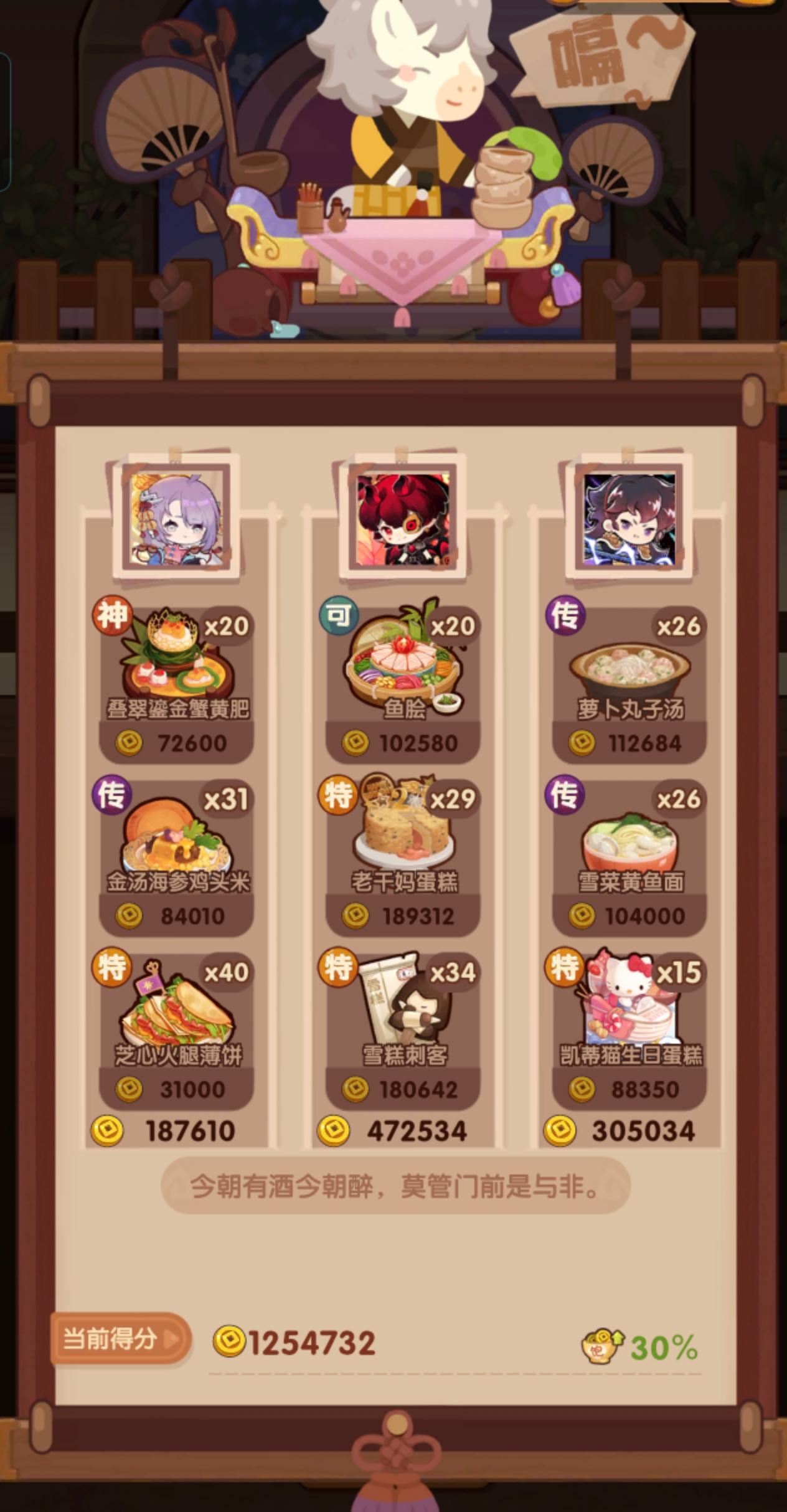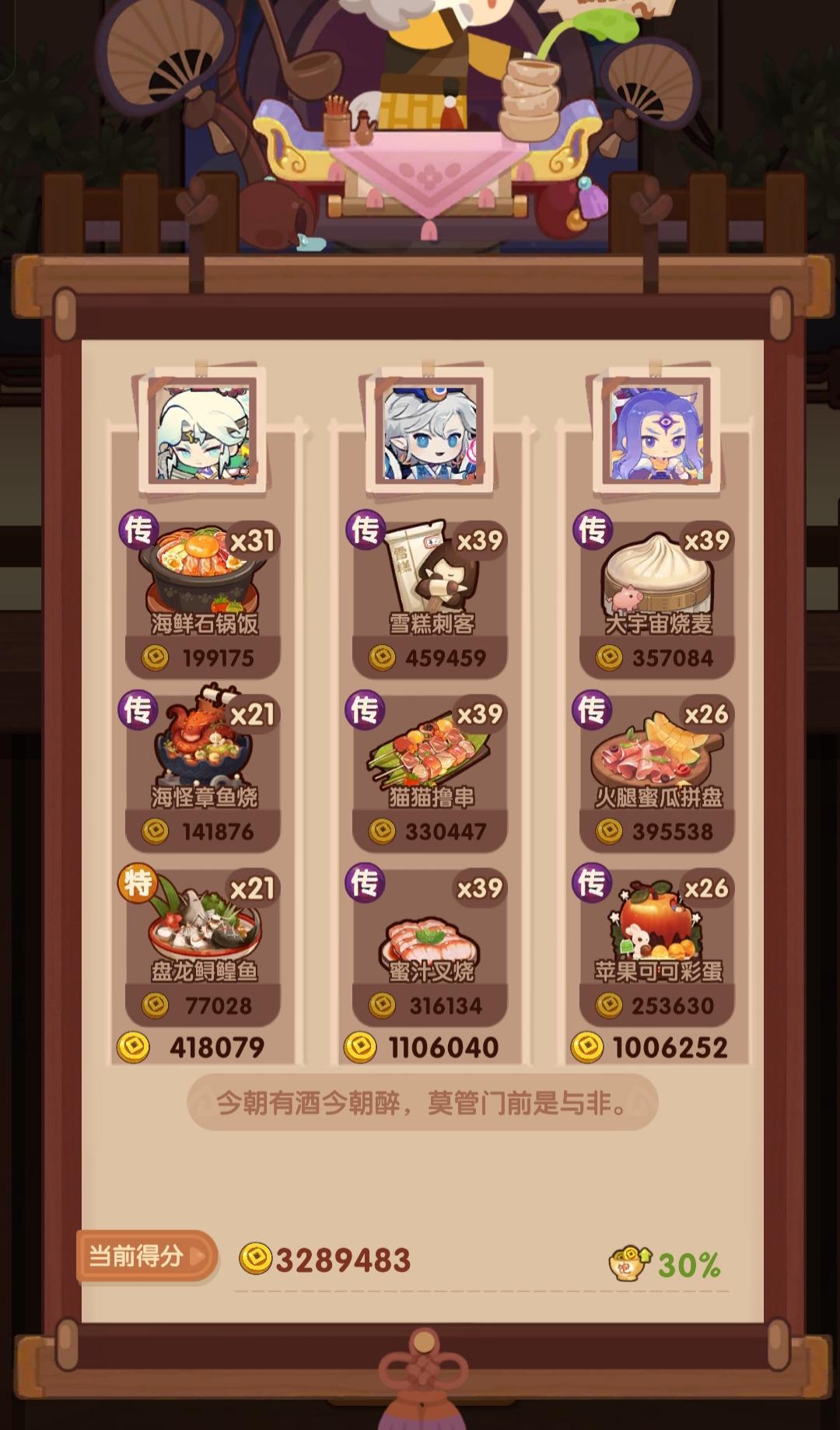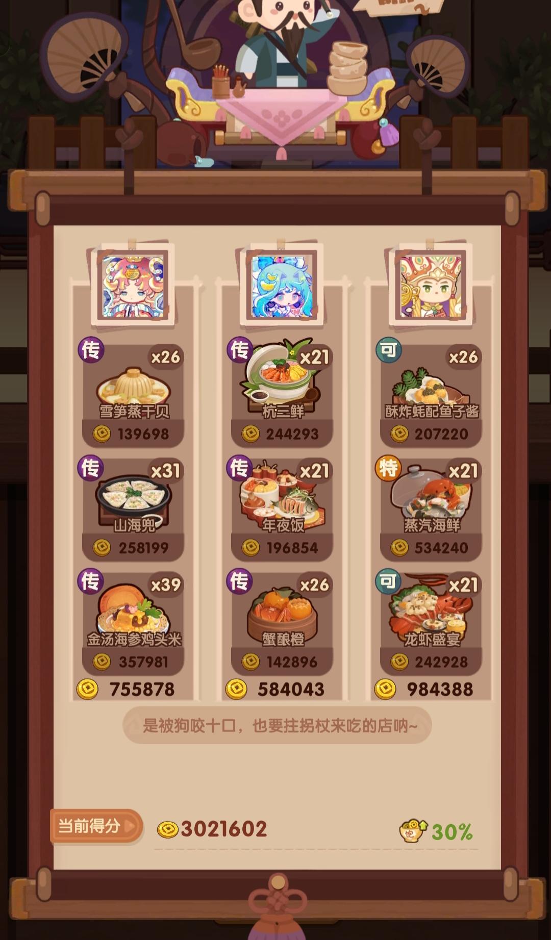 萌新第82天进军州级风云宴。郡级的小鸟胃韩湘子已过,加之上周的志怪新池抽到了一些高价菜和好用的厨子,于是在上周点了晋级(这满档分数也跨越太大了)。本帖用来思路记录,一方面是为了以后拿到更强力的菜厨时方便自查、调整配置,另一方面也是抛砖引玉希望能给同阶段小伙伴提供一些思路。菜厨现况:食战三国、星轨密文、志怪食录、鸥in派对除坑,归途列车
