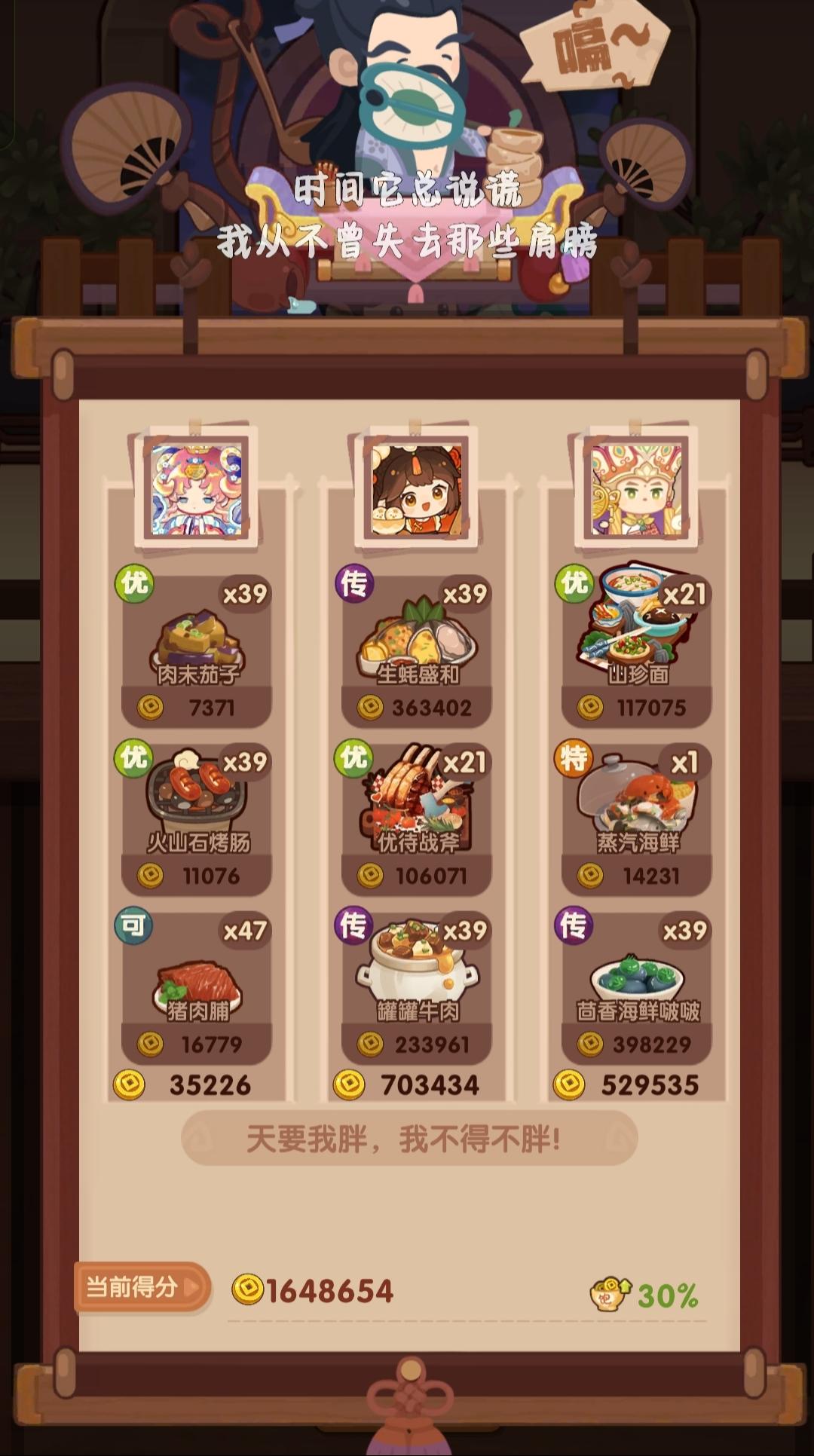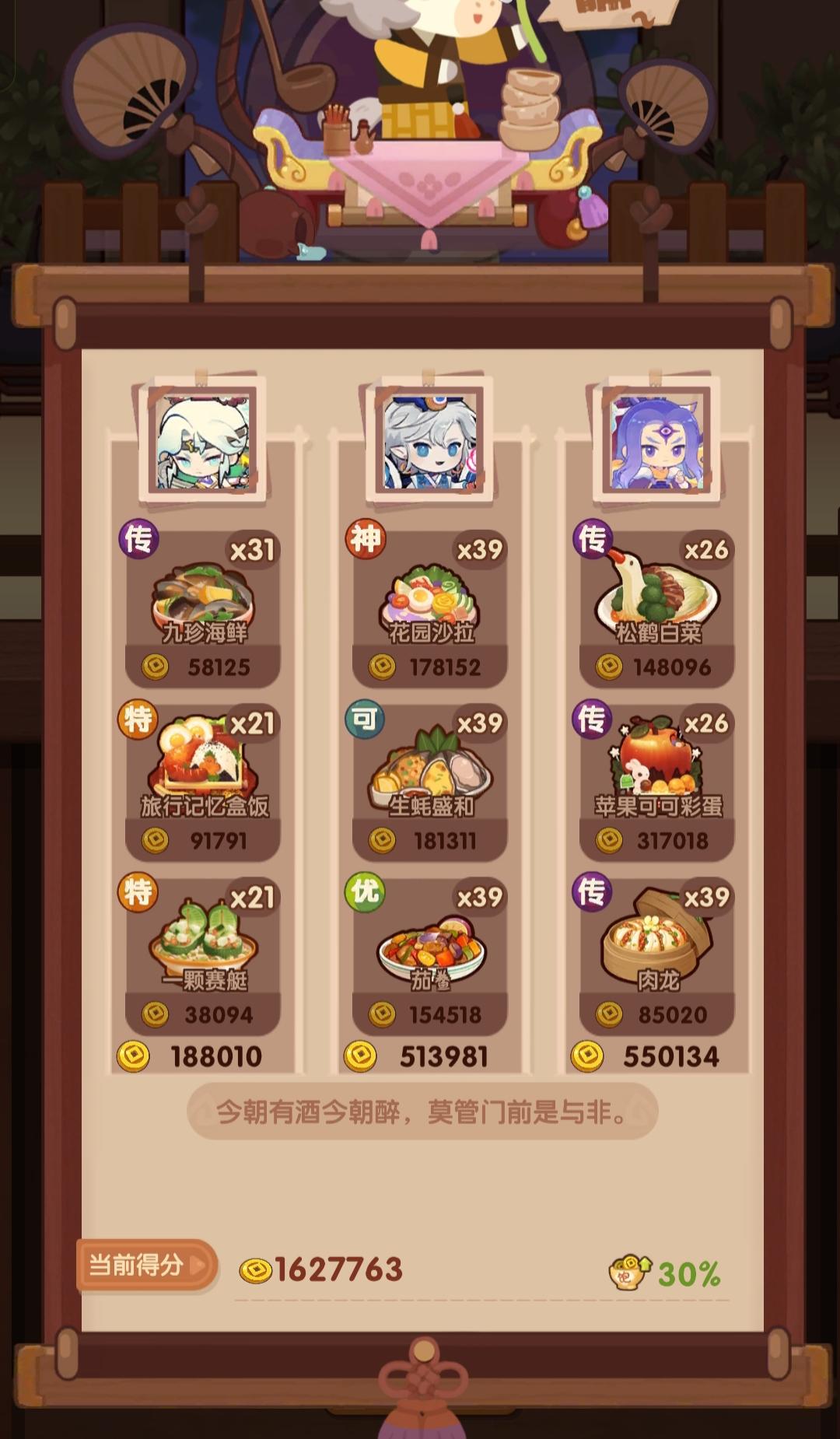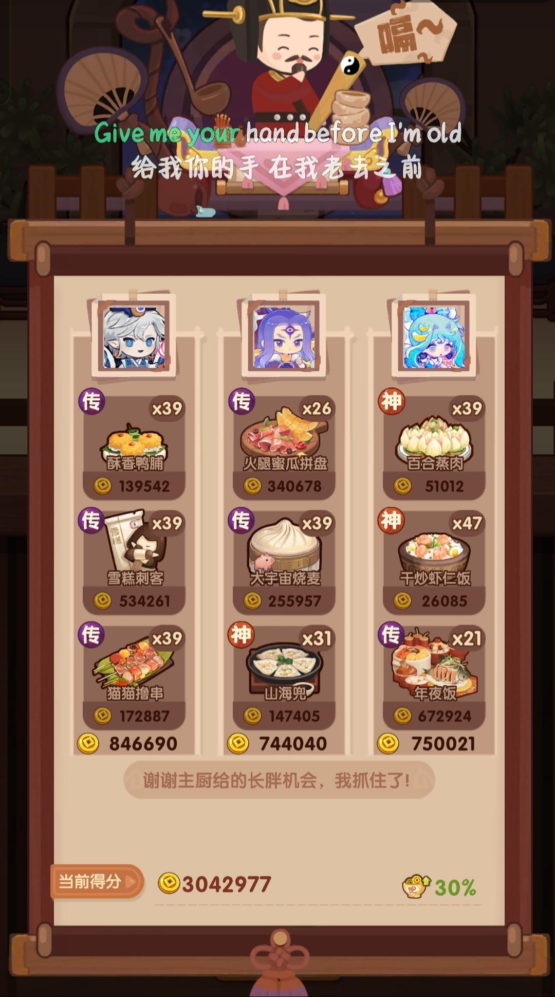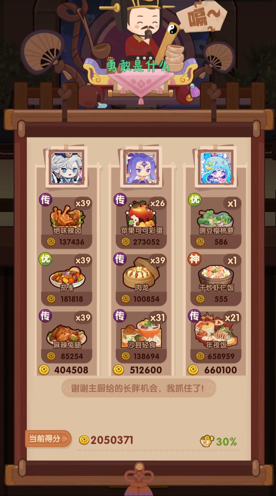 萌新第82天进军州级风云宴。郡级的小鸟胃韩湘子已过,加之上周的志怪新池抽到了一些高价菜和好用的厨子,于是在上周点了晋级(这满档分数也跨越太大了)。本帖用来思路记录,一方面是为了以后拿到更强力的菜厨时方便自查、调整配置,另一方面也是抛砖引玉希望能给同阶段小伙伴提供一些思路。菜厨现况:食战三国、星轨密文、志怪食录、鸥in派对除坑,归途列车