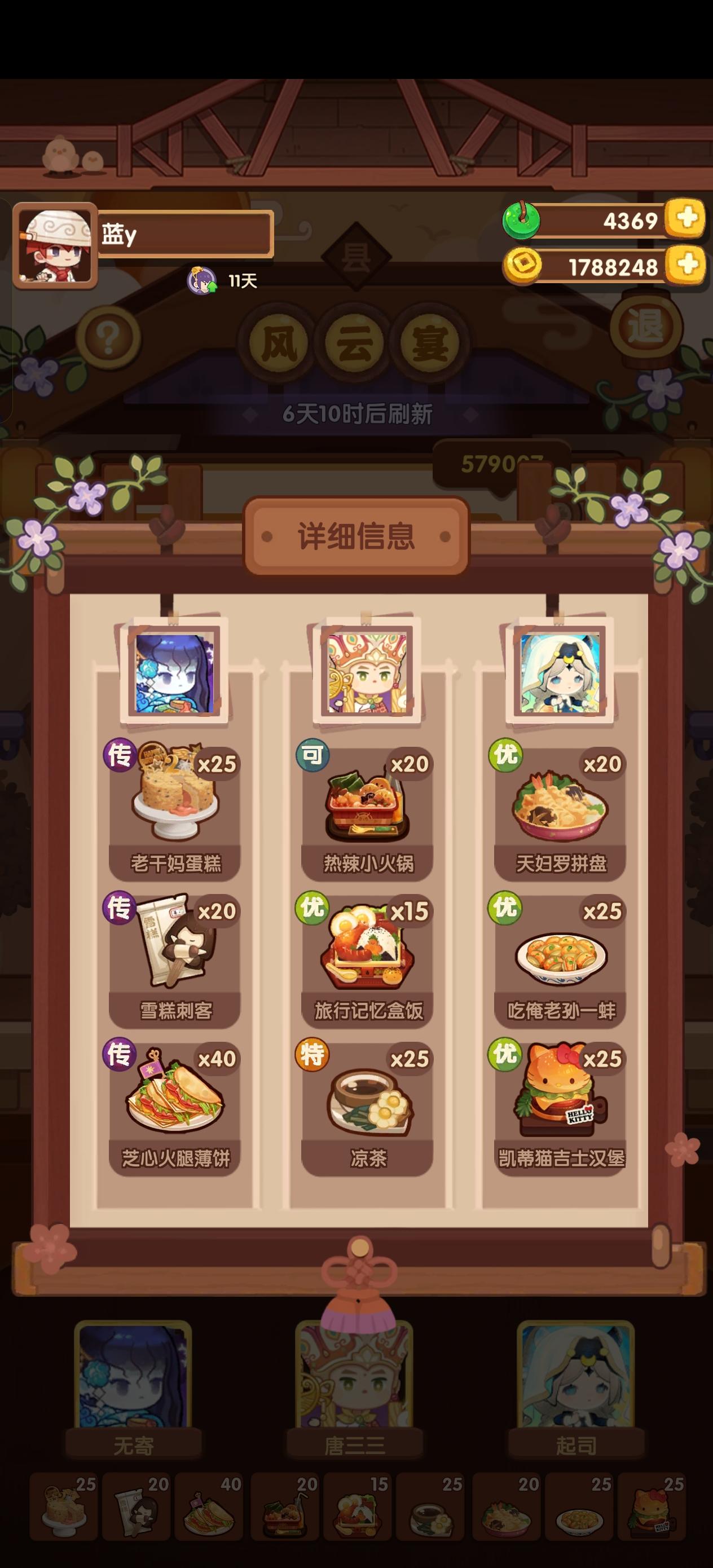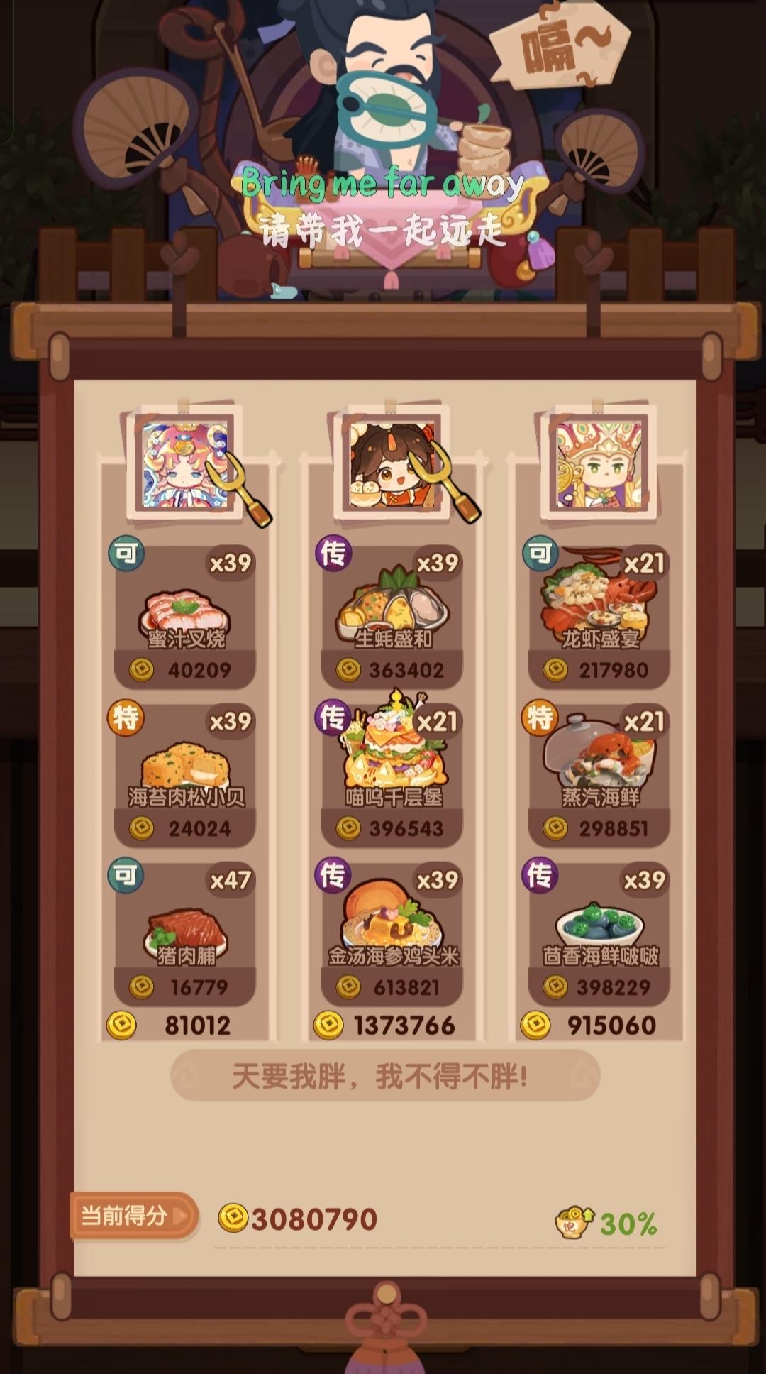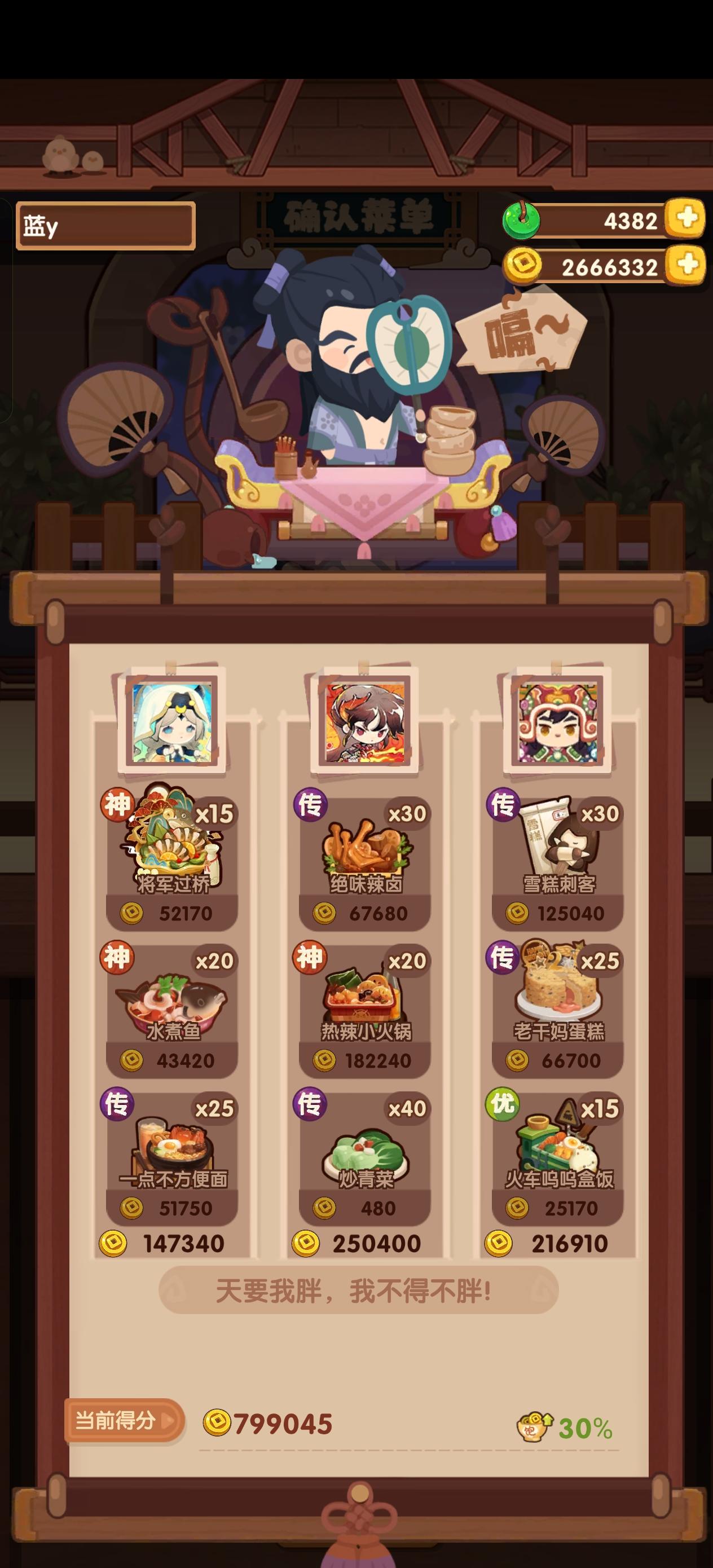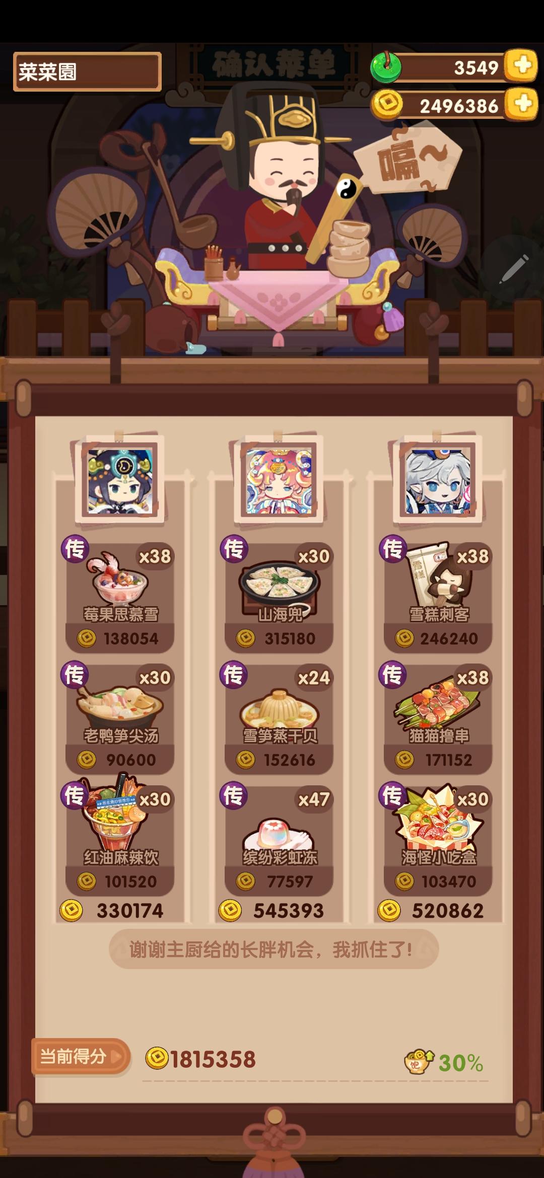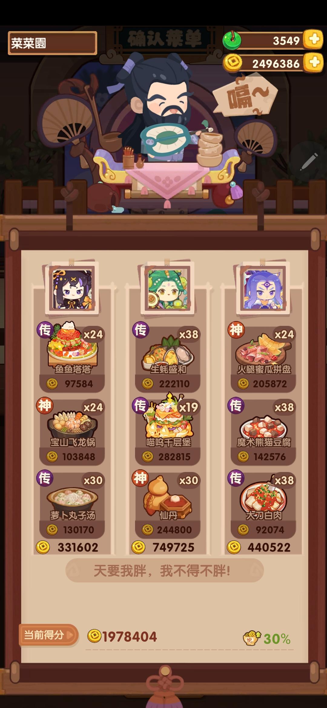 萌新第82天进军州级风云宴。郡级的小鸟胃韩湘子已过,加之上周的志怪新池抽到了一些高价菜和好用的厨子,于是在上周点了晋级(这满档分数也跨越太大了)。本帖用来思路记录,一方面是为了以后拿到更强力的菜厨时方便自查、调整配置,另一方面也是抛砖引玉希望能给同阶段小伙伴提供一些思路。菜厨现况:食战三国、星轨密文、志怪食录、鸥in派对除坑,归途列车