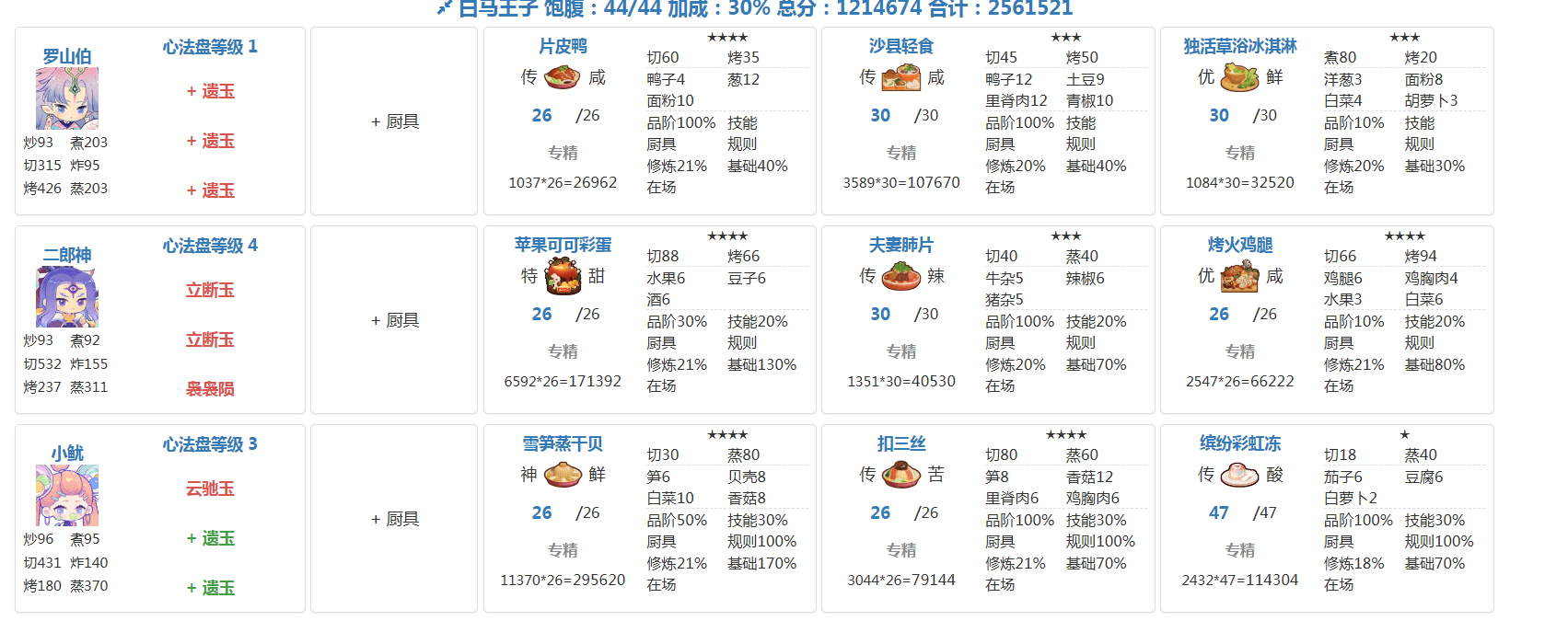 分享一下宴会常用厨师的厨具,仅供参考此外,尤伶装的答案镜,姒露霸姬捣药罐10.19更新补充:乐乐妹装甜品架可以替换小卧龙(基修高也可以做烤切,蜜瓜拼盘,雪糕刺客和沙县)8.12更新炎罗佩戴碧玉烟斗茶勺(烤售价+40%,烤-200),成为低🔥菜战神11.30更新樊声厨具及菜谱(煮切双技法)见16楼12.29更新猛然发现二郎神是蒸切一哥,四火厨师开心法盘也方便,详情见17楼12.2