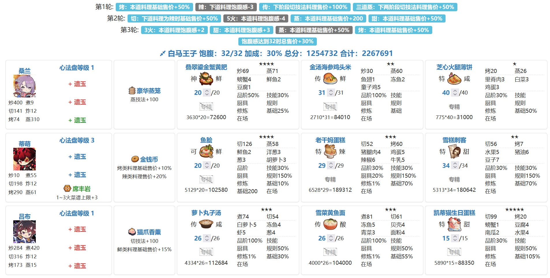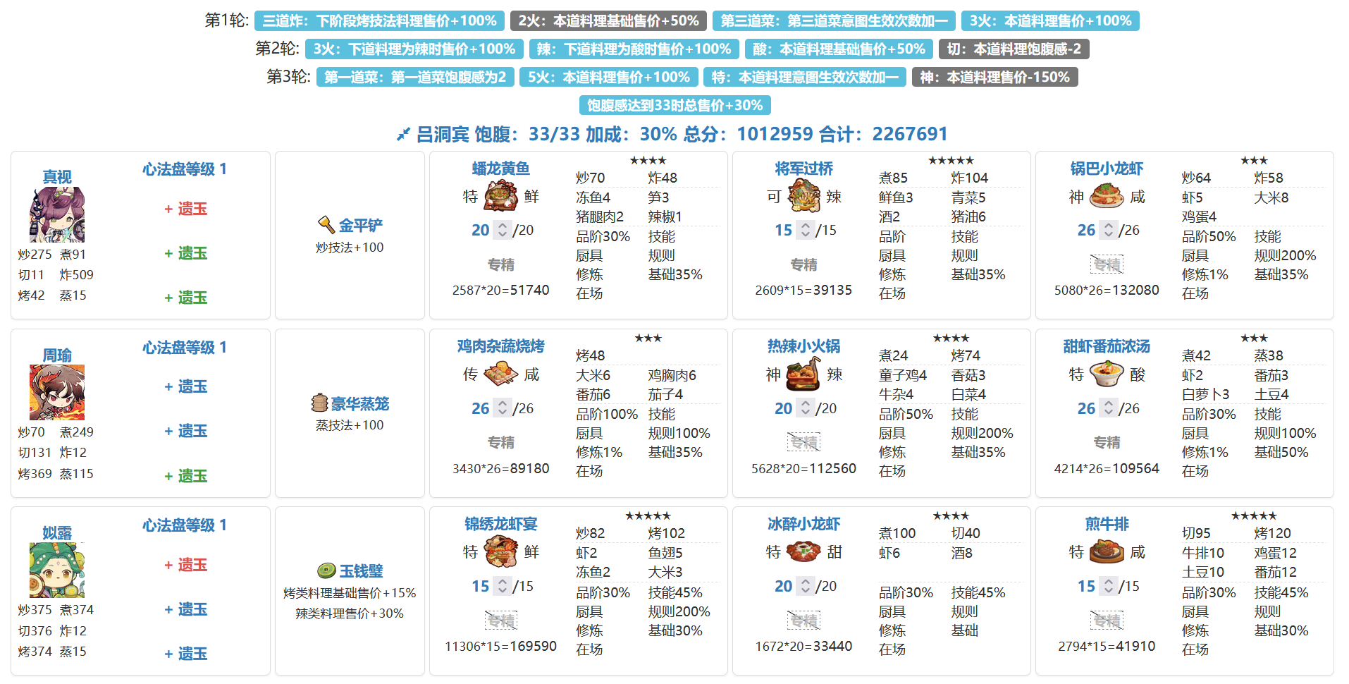满档宴会思路记录,方便自查;同时抛砖引玉,能给其他相似进度小伙伴有启发最好!吕洞宾:1. 第一个得分点也是破题点在于第二轮的酸系菜的售价和基础售价意图的叠加。目前我有的能做到高品级的酸系高价菜只有雪菜黄鱼面[煮切]和甜虾番茄浓汤[蒸煮]。但考虑到第一轮的基础售价加成buff没有[切],所以选择甜虾番茄浓汤。而近期池子里最好用的蒸煮厨便是新池的仇影[+豪