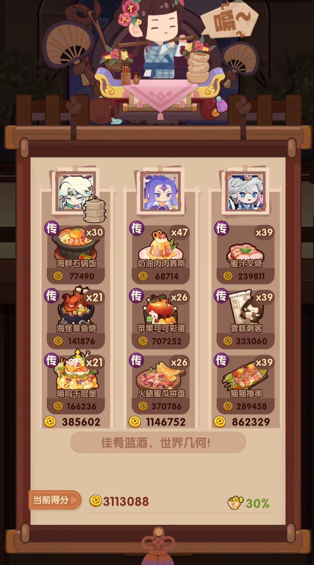 🧱前排提醒满档分数线2980000曹国舅可实现无遗玉单人满档🦞厨师优化 李莱花 下位🔥艾琳/阿狸🌵菜谱优化 香煎银鳕鱼 下位🔥冬阴功汤 BBQ烧烤 下位🔥情人巧克力/鬼火烤鱼 酥炸鱼子酱 下位🔥飞山宝龙锅/鱼里有圆 蒸汽海鲜 下位🔥盘龙鲟鳇鱼/海怪章鱼烧 龙虾盛宴 下位🔥青柠捞饭/山珍面 生蚝盛和 下位🔥酥香鸭脯