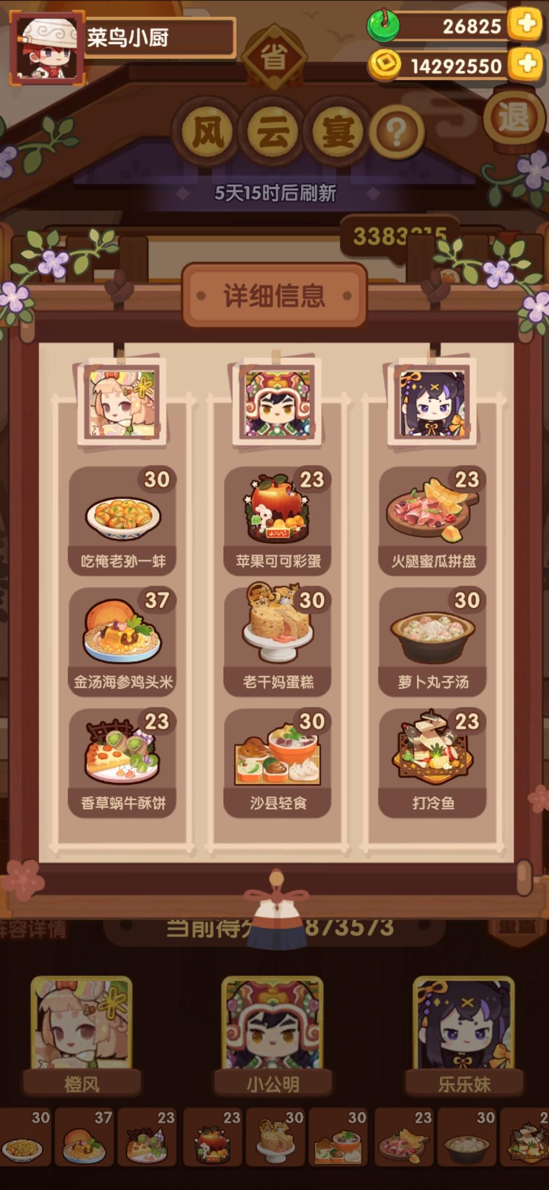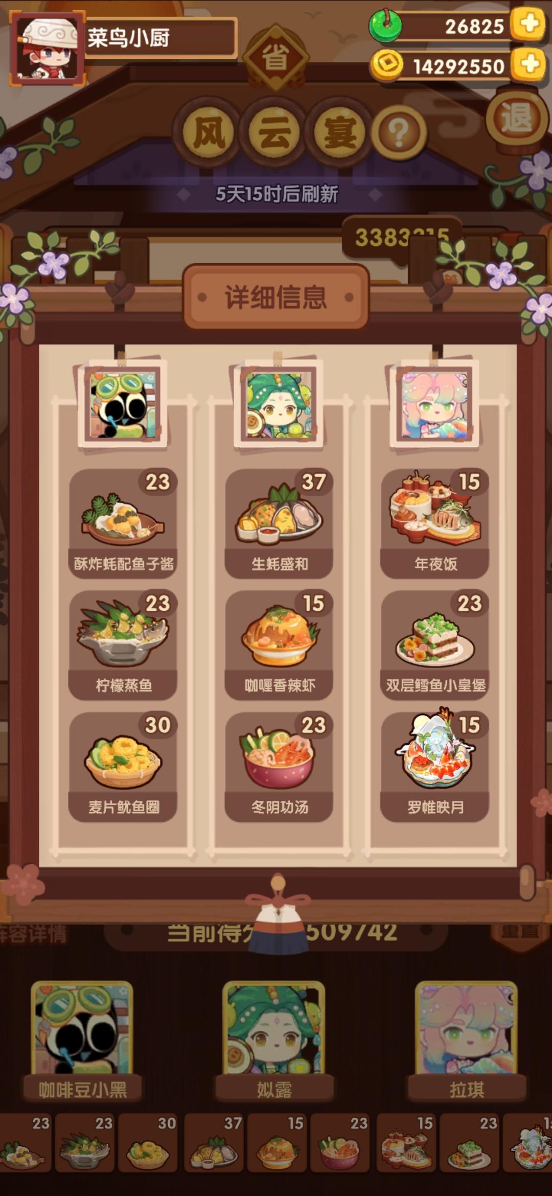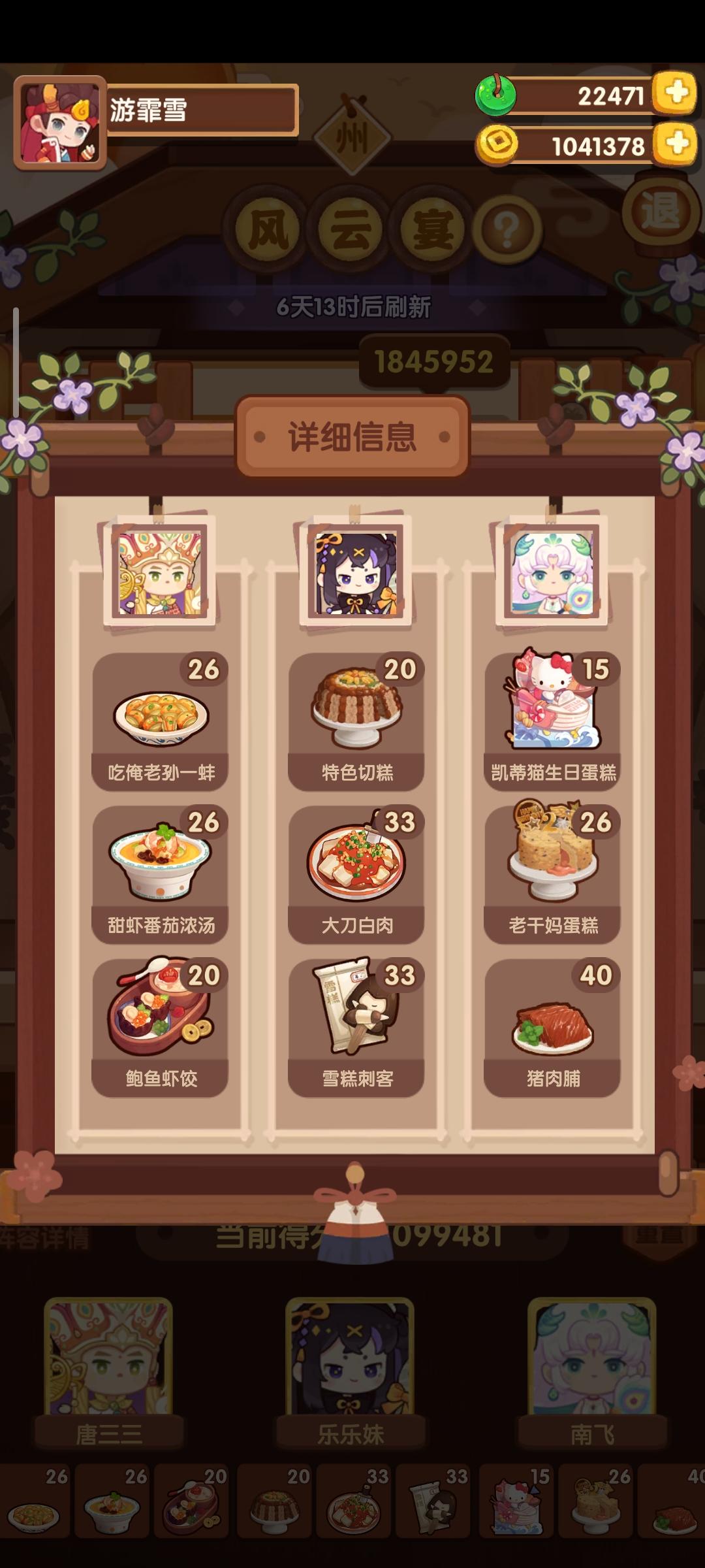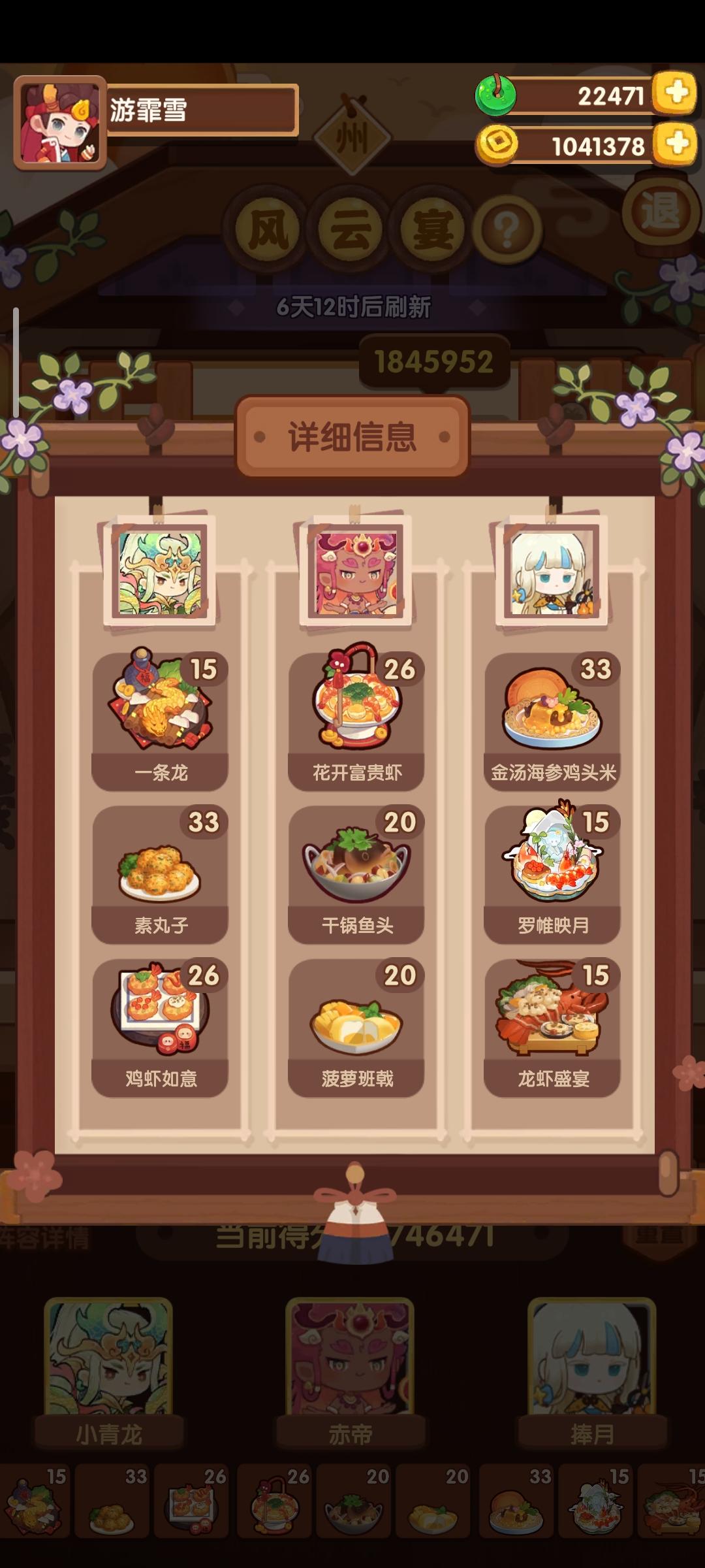 国际惯例的全员无厨具、无遗玉,修炼偏高,具体数值在下方,东西在评论区里。乐乐妹、洛花、橙风有修炼。全菜谱无专精,五火菜谱上限17适用,上限17总分3448894,上限18总分3471382。【替代方案】*预警:考虑到每个人的修炼进度不同,要用替代的最好是去计算器那看一眼有无影响再决定是否使用*菜谱:没有苹果可可彩蛋可以找任意甜口味四火菜谱,例子太多不在这列了。没有三文鱼茶泡饭可以找水