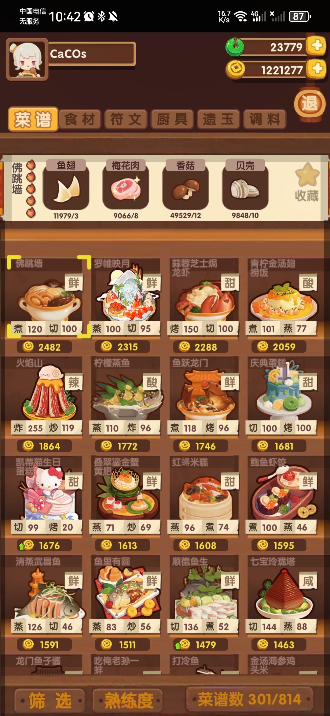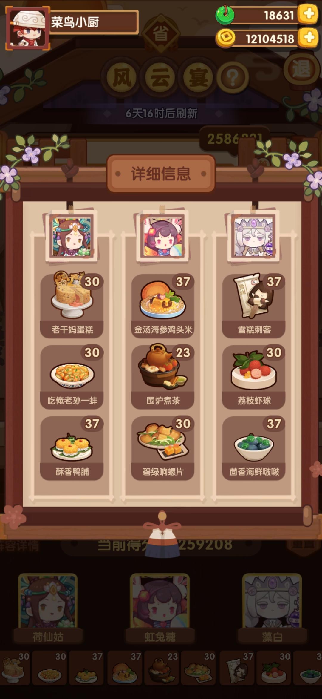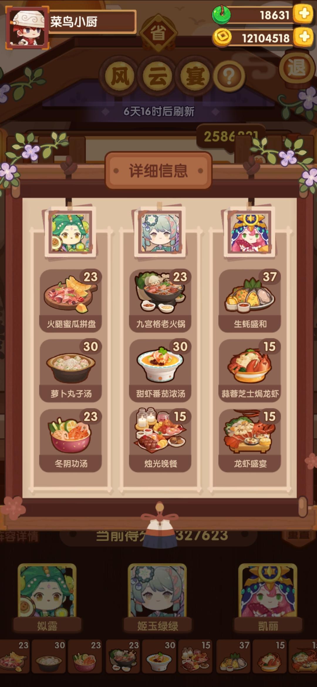 国际惯例的全员无厨具、无遗玉,修炼偏高,具体数值在下方,东西在评论区里。无寄、拉琪、乐乐妹、小卧龙有修炼,气仙人有修炼但不影响结果。全菜谱无专精,五火菜谱上限17适用,上限17总分3340612,上限18总分3367353。【替代方案】*预警:考虑到每个人的修炼进度不同,要用替代的最好是去计算器那看一眼有无影响再决定是否使用*菜谱:没有幽灵咖喱的可以找任意四火炒技法菜谱,能做的就行,例