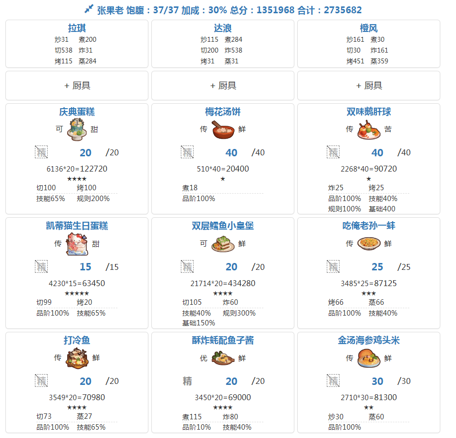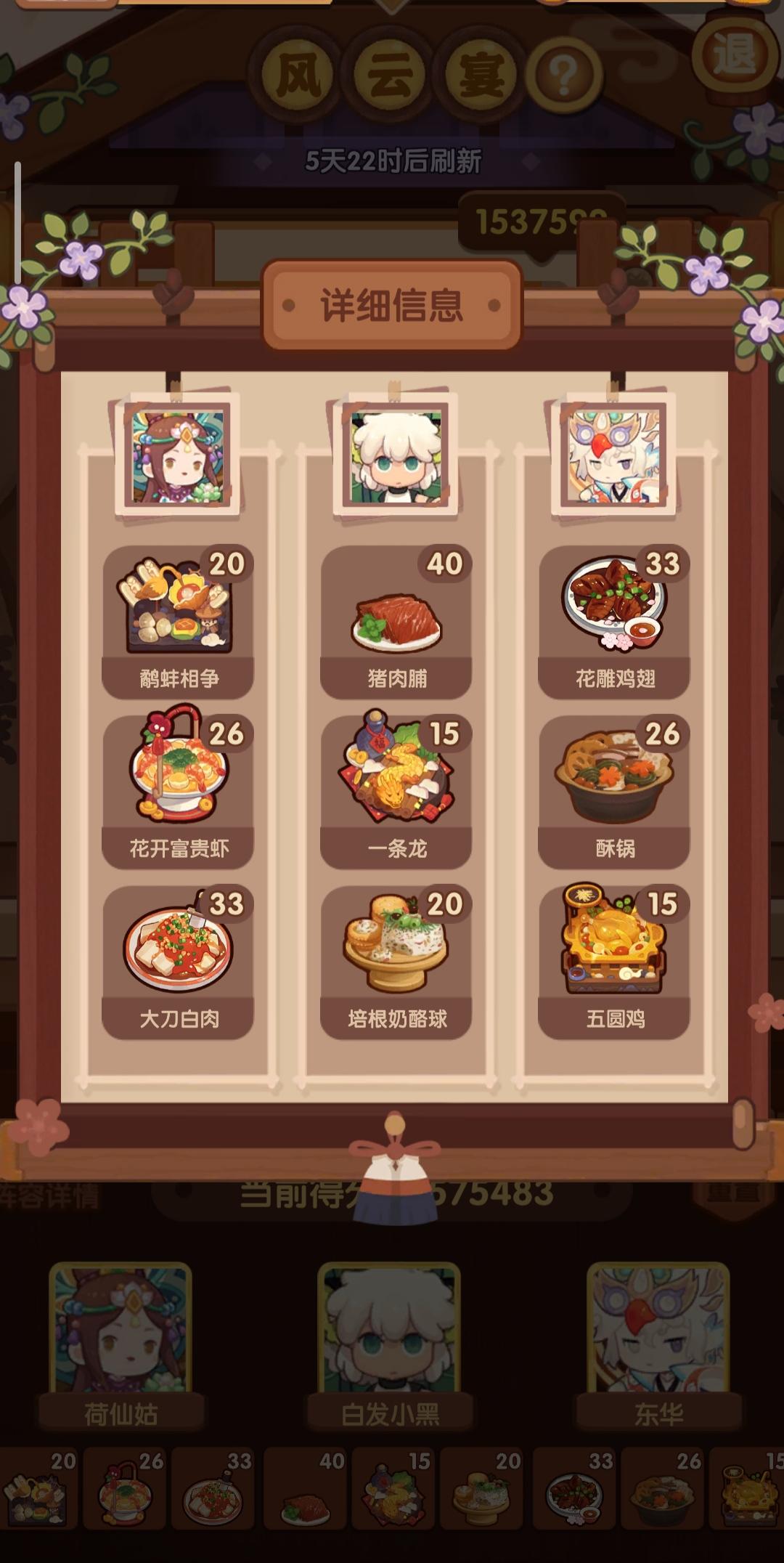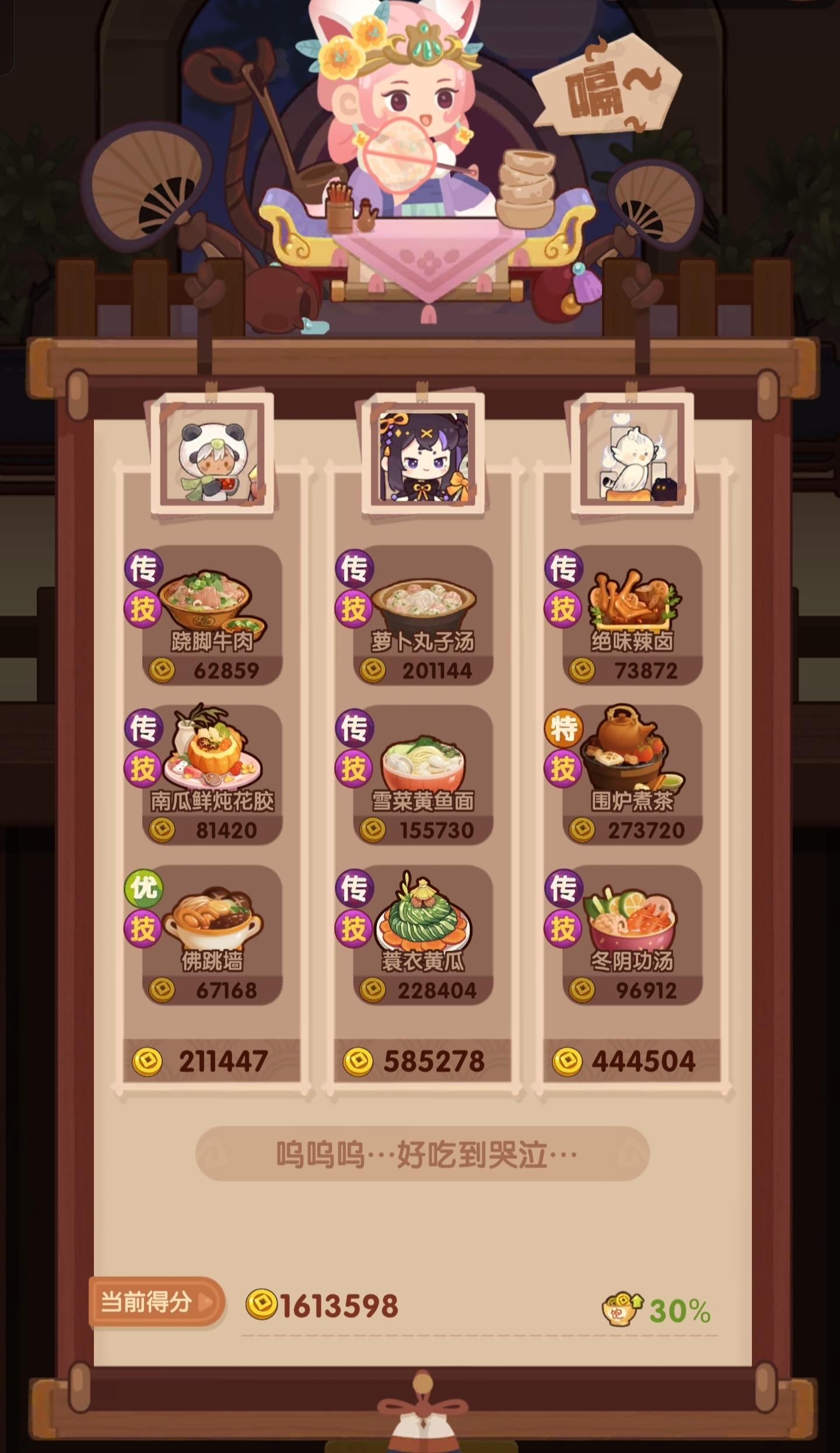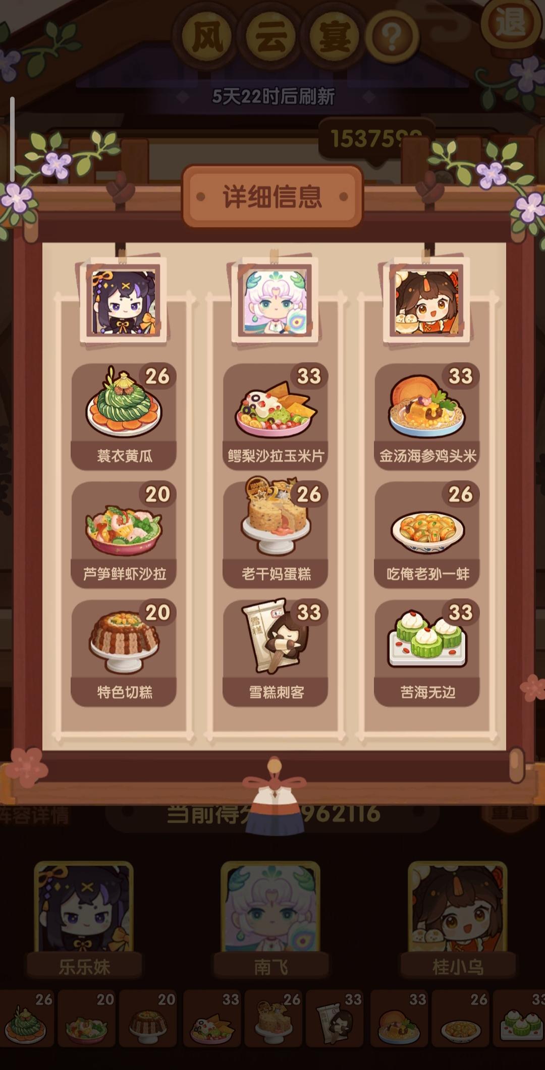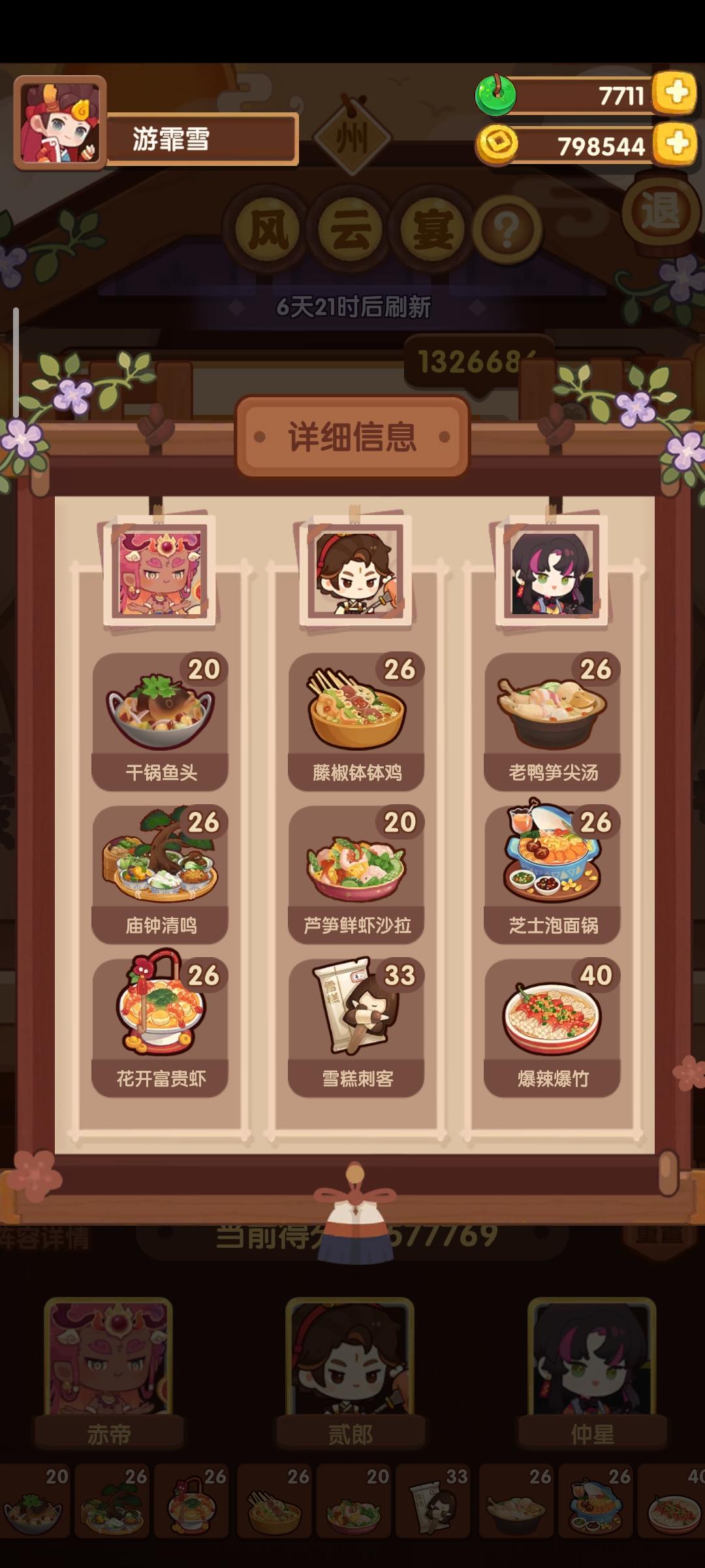 分数已经超过四档,除了何仙姑没带厨具,南飞带+烤属性售价15%,其他人带的是+100主主属性厨具ps:没仔细算下总合分,结果出来之后发现自己已经半只脚踏入第五档(距离下一档差9万分)