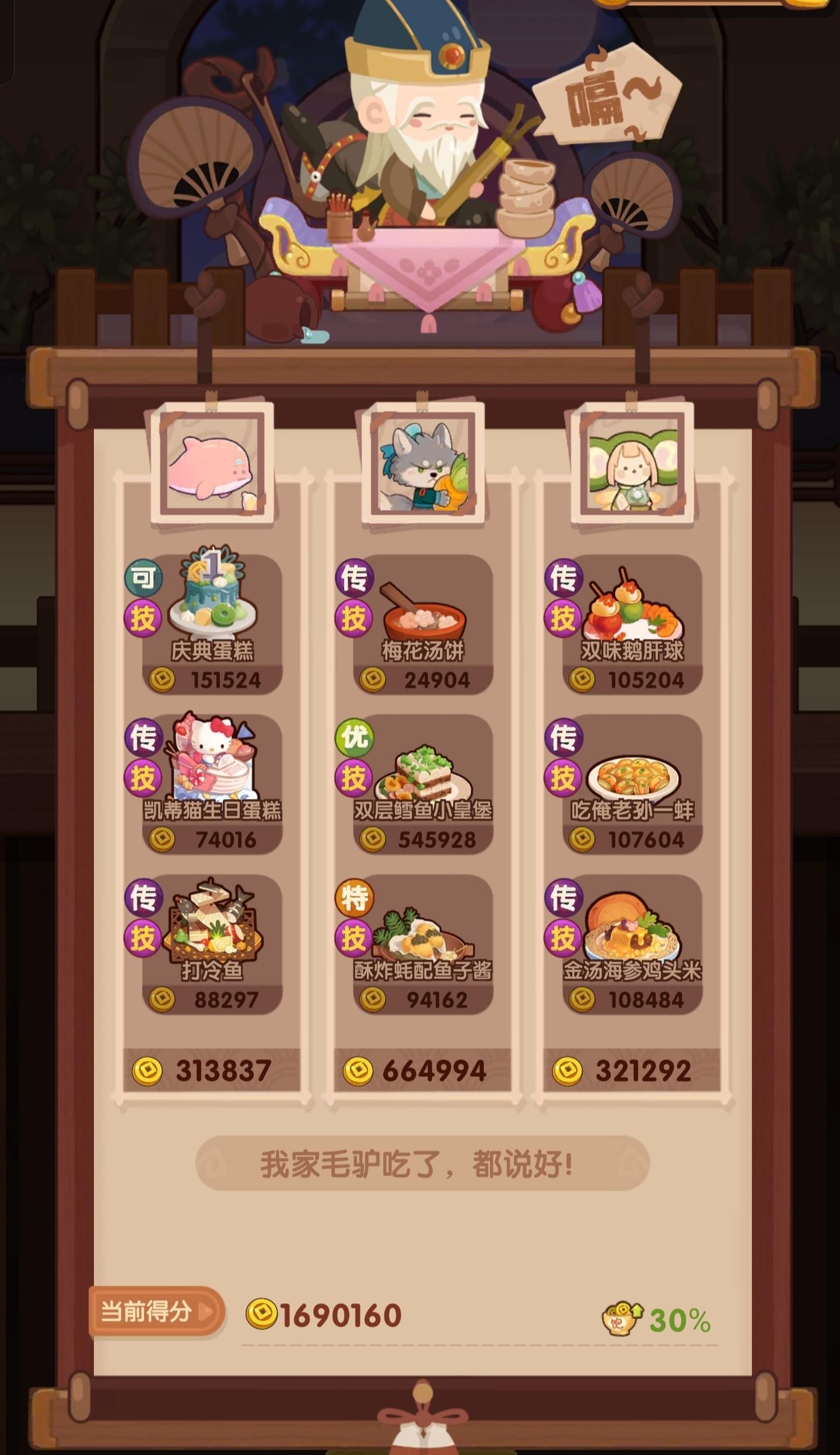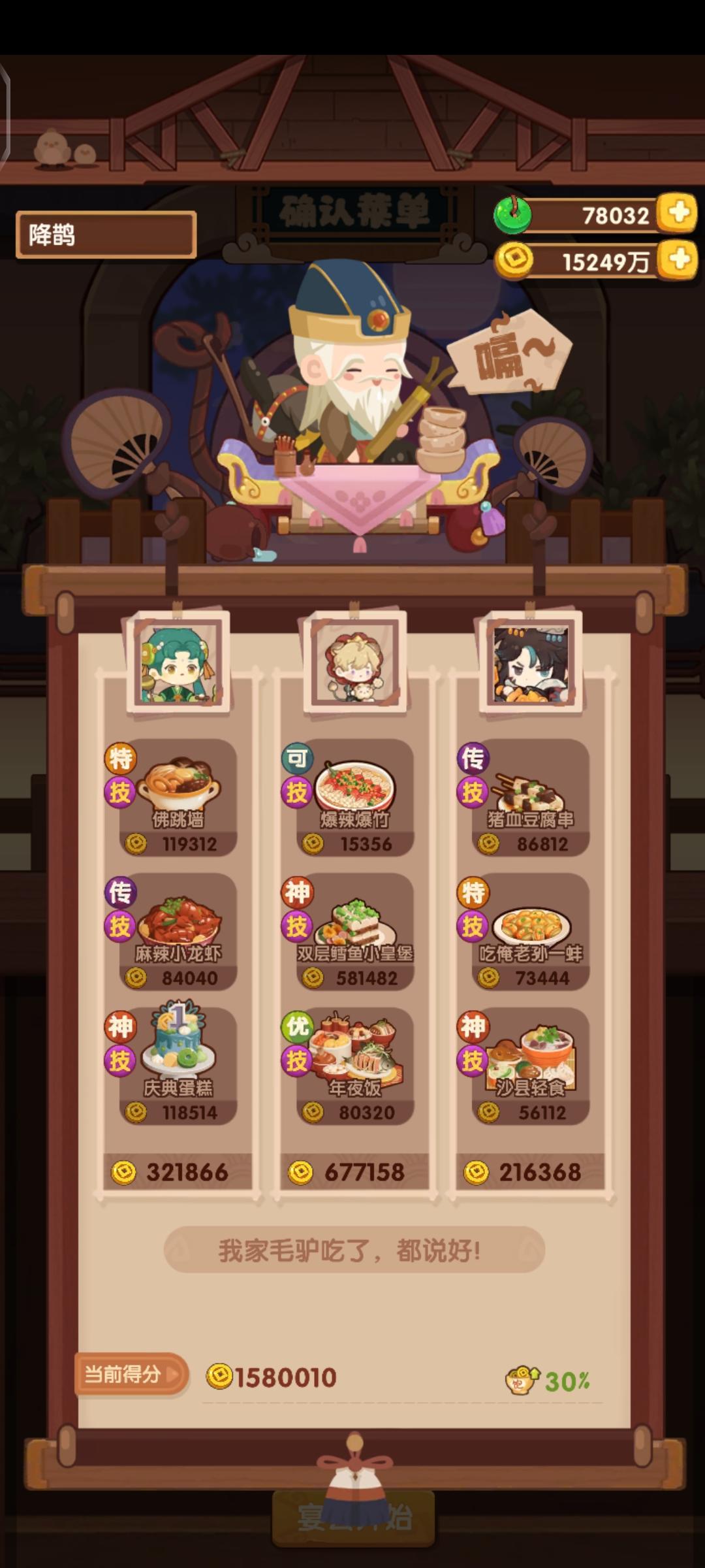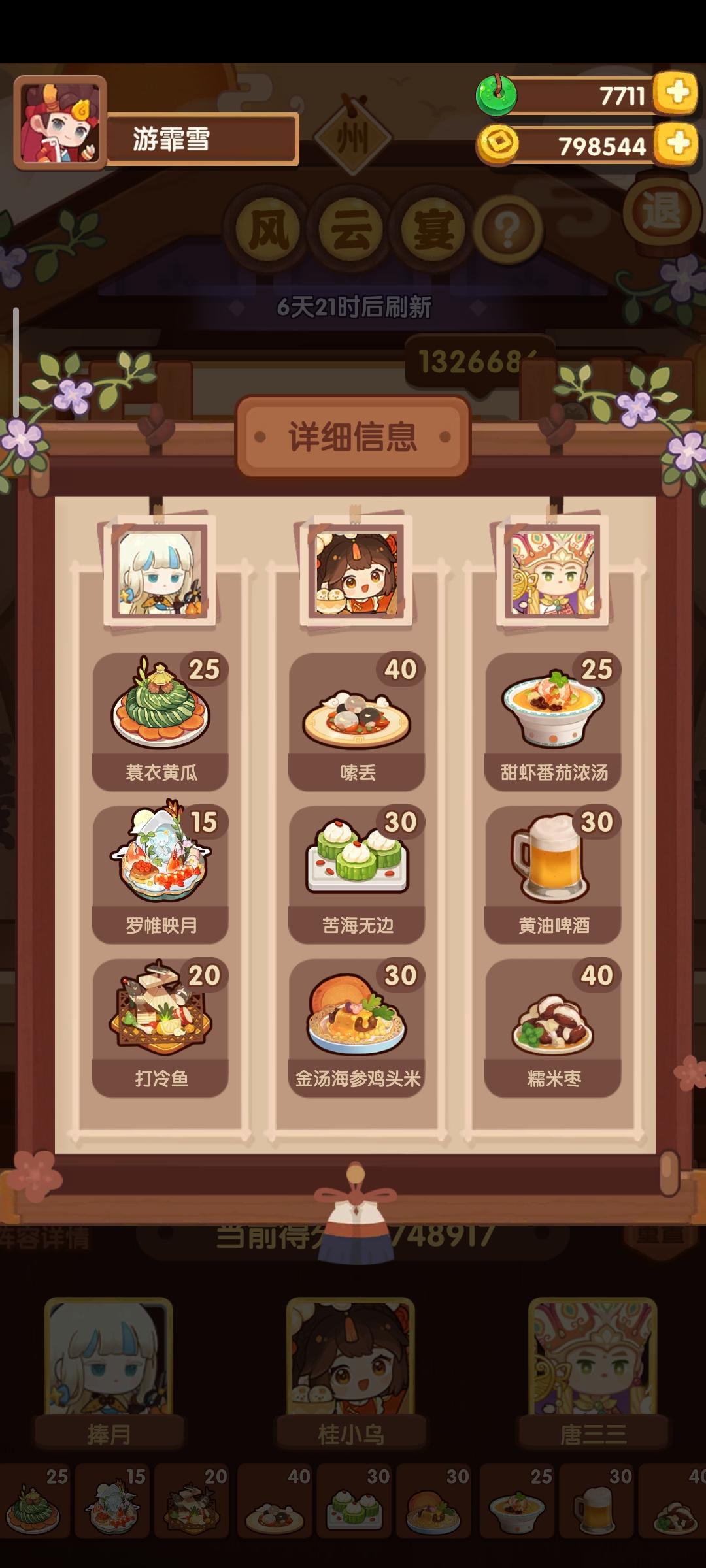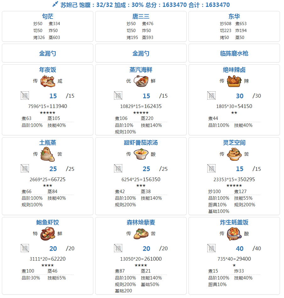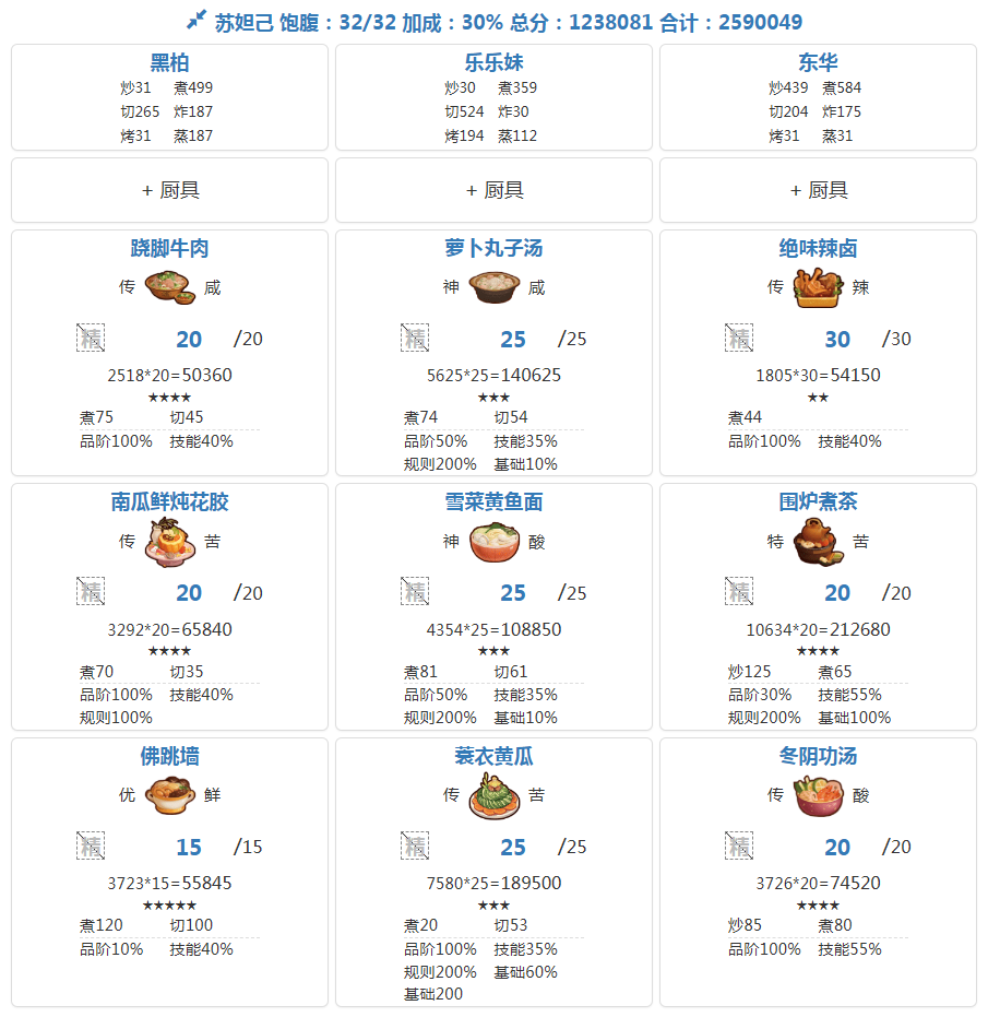 分数已经超过四档,除了何仙姑没带厨具,南飞带+烤属性售价15%,其他人带的是+100主主属性厨具ps:没仔细算下总合分,结果出来之后发现自己已经半只脚踏入第五档(距离下一档差9万分)