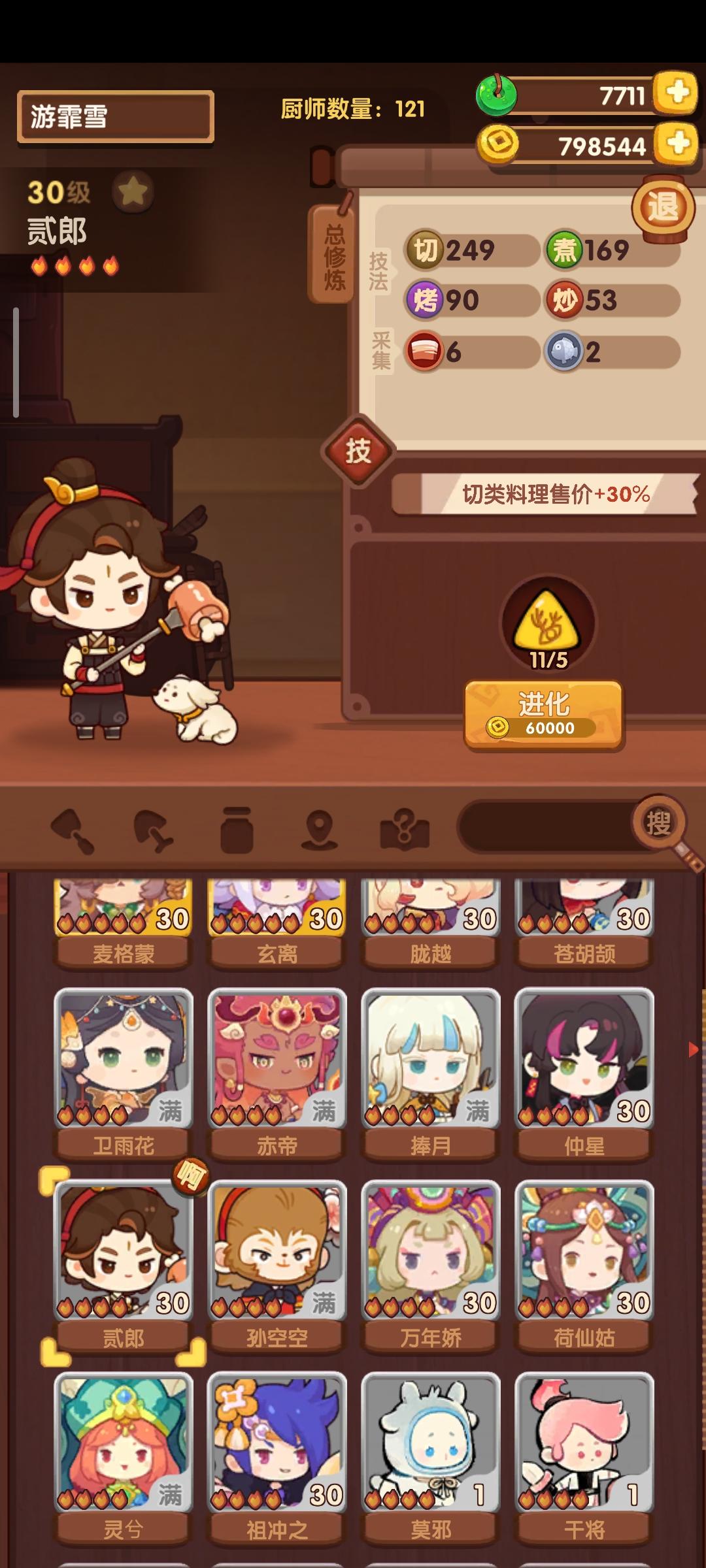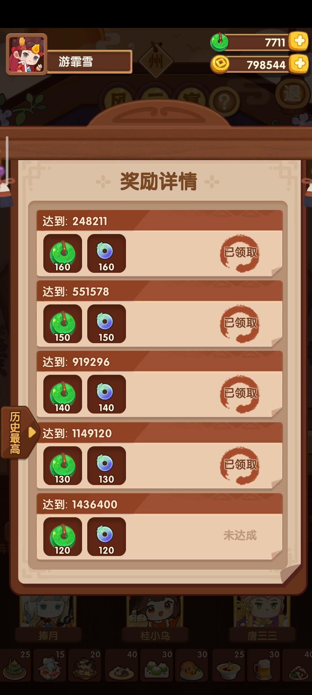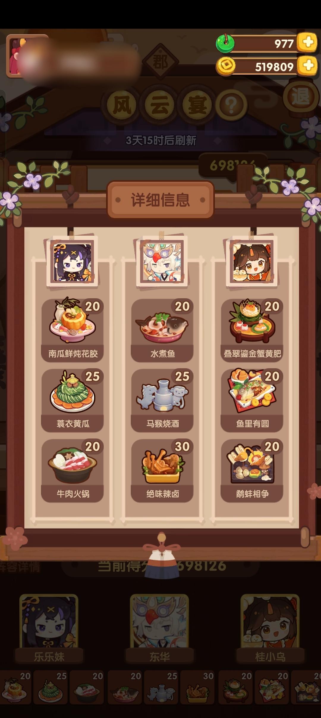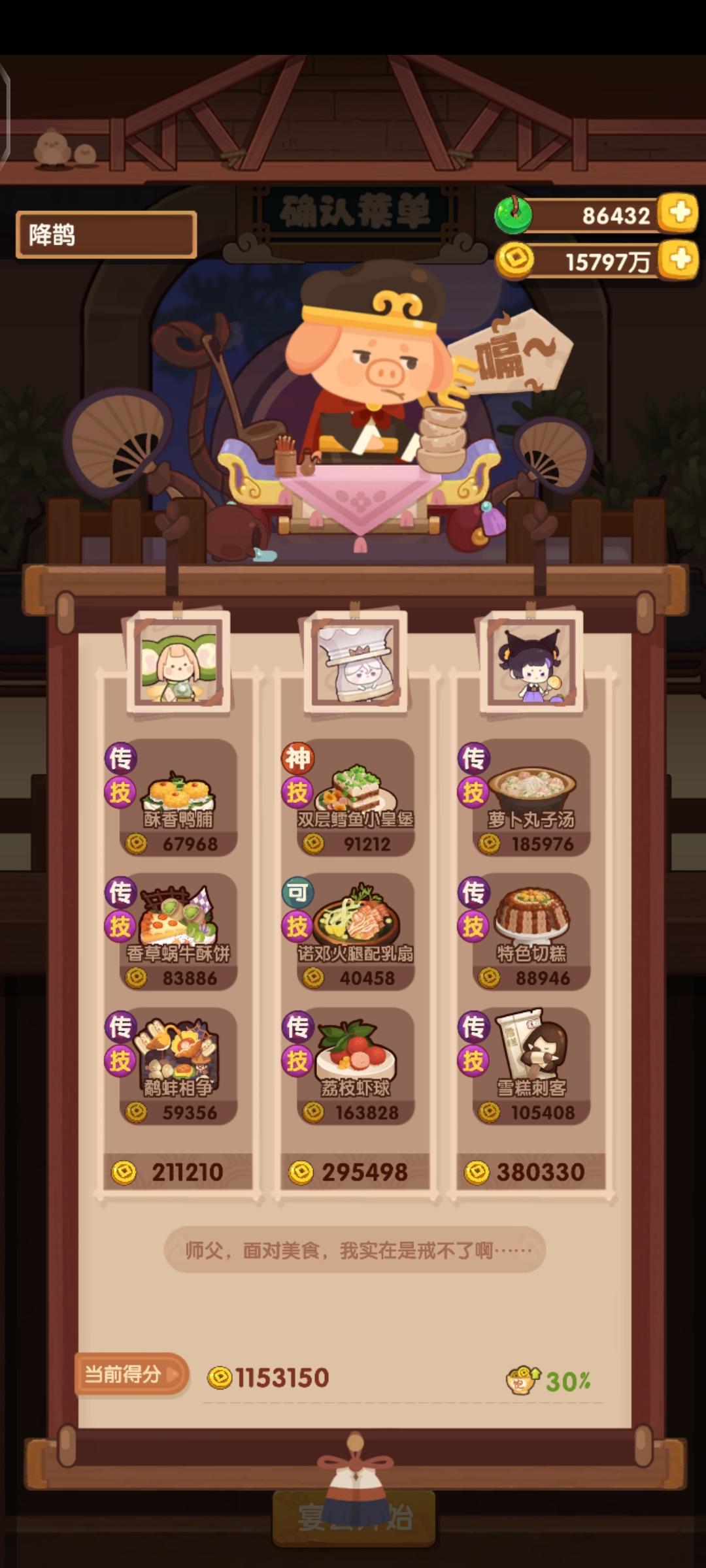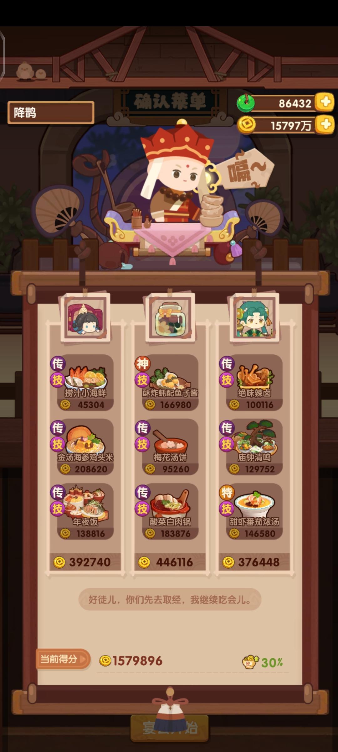 分数已经超过四档,除了何仙姑没带厨具,南飞带+烤属性售价15%,其他人带的是+100主主属性厨具ps:没仔细算下总合分,结果出来之后发现自己已经半只脚踏入第五档(距离下一档差9万分)