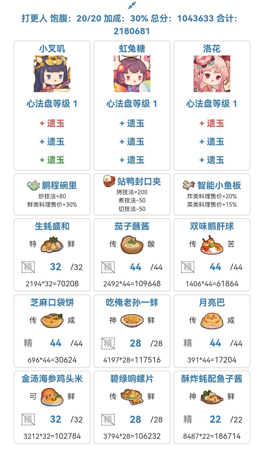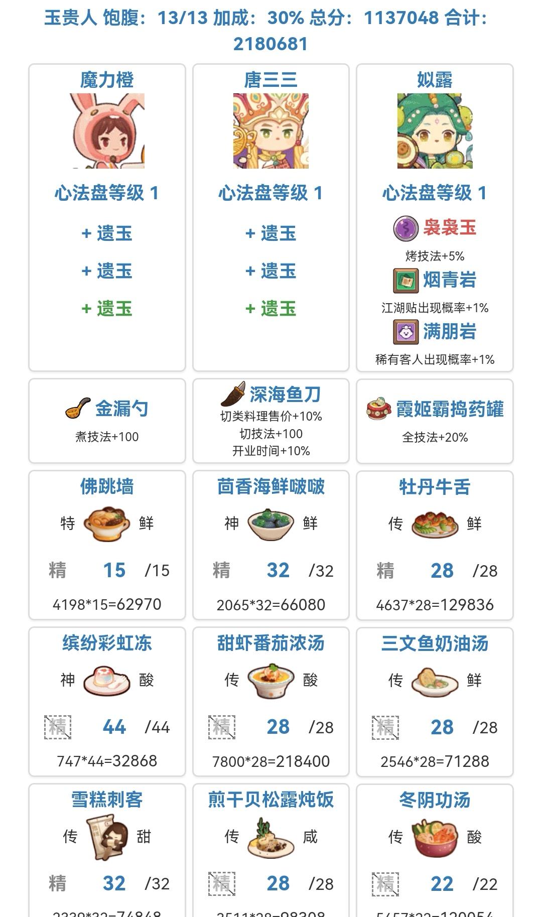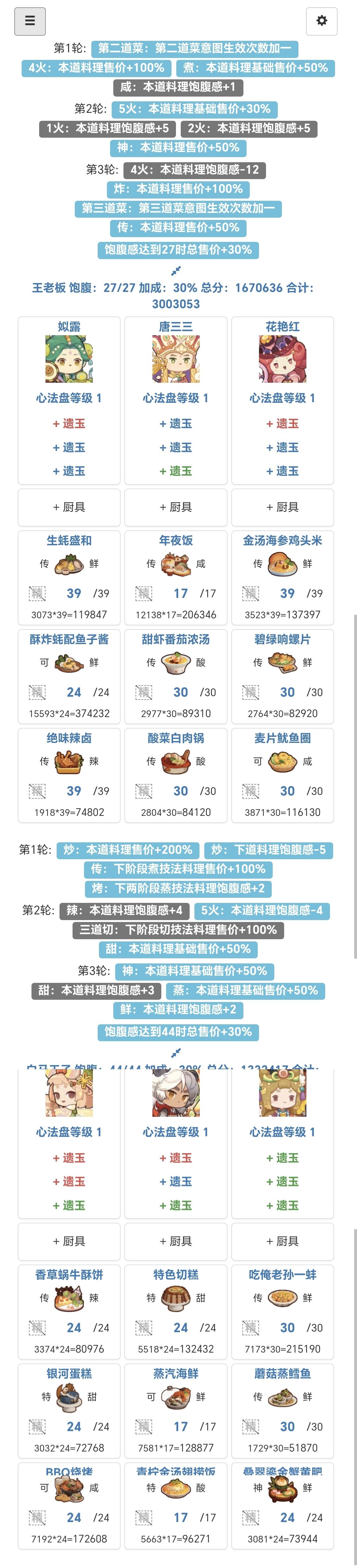 国际惯例的全员无厨具、无遗玉,修炼偏高,具体数值在P3。赤帝、句茫、乐乐妹、小卧龙有修炼,小公明有修炼但不影响结果。全菜谱无专精,五火菜谱上限17适用,上限17总分3068124,上限18总分3086993。【替代方案】乐乐妹没修炼的可以找修炼了的贰郎或者没修炼的阿根哥哥,小卧龙没修炼的可以去找黑柏。没有银河蛋糕可用红蟳米糕、叠翠流金蟹黄肥、蒸汽石锅鱼等四火蒸菜谱替代,都没有就去找雪笋蒸