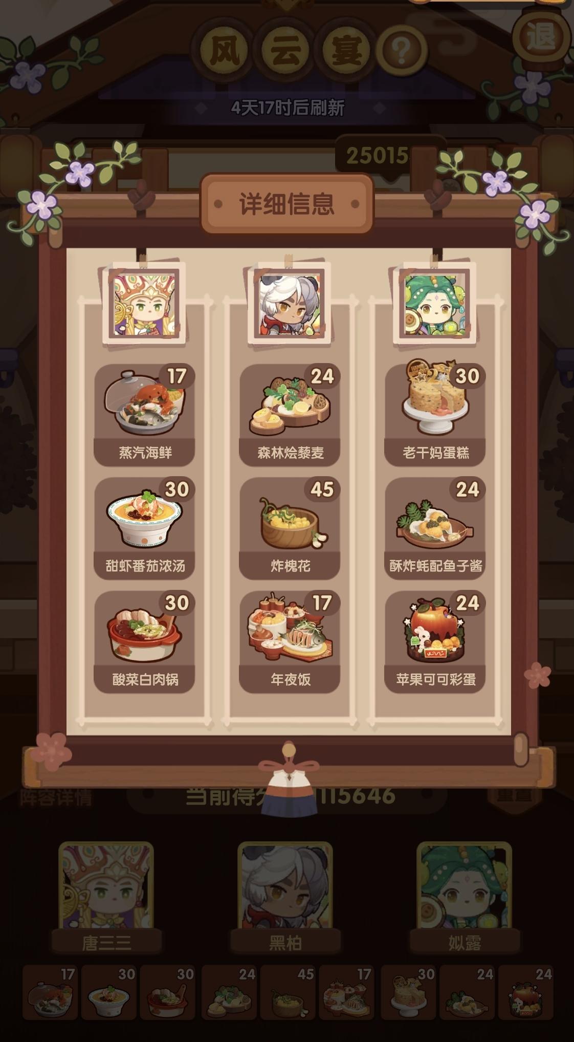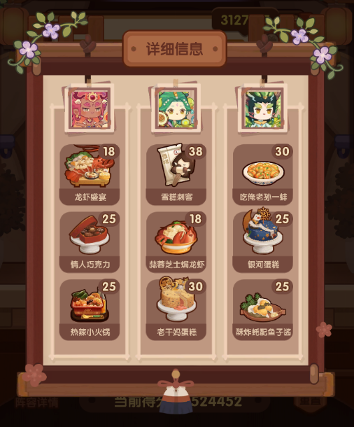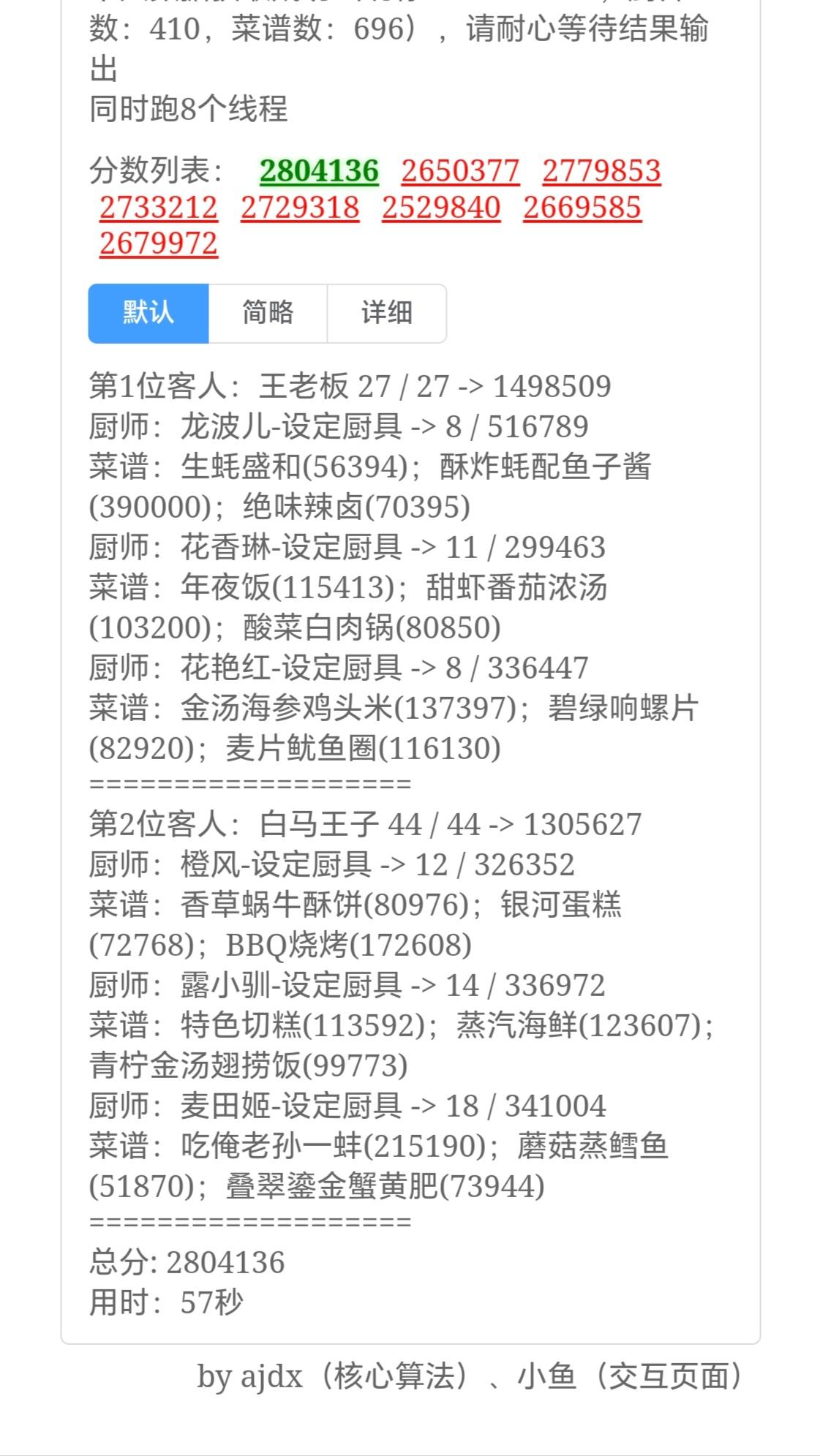 国际惯例的全员无厨具、无遗玉,修炼偏高,具体数值在P3。赤帝、句茫、乐乐妹、小卧龙有修炼,小公明有修炼但不影响结果。全菜谱无专精,五火菜谱上限17适用,上限17总分3068124,上限18总分3086993。【替代方案】乐乐妹没修炼的可以找修炼了的贰郎或者没修炼的阿根哥哥,小卧龙没修炼的可以去找黑柏。没有银河蛋糕可用红蟳米糕、叠翠流金蟹黄肥、蒸汽石锅鱼等四火蒸菜谱替代,都没有就去找雪笋蒸