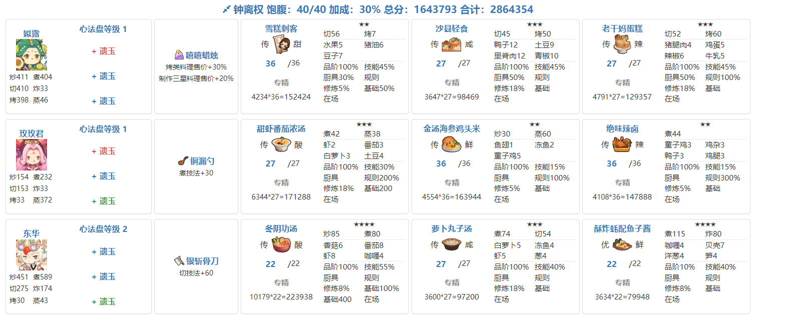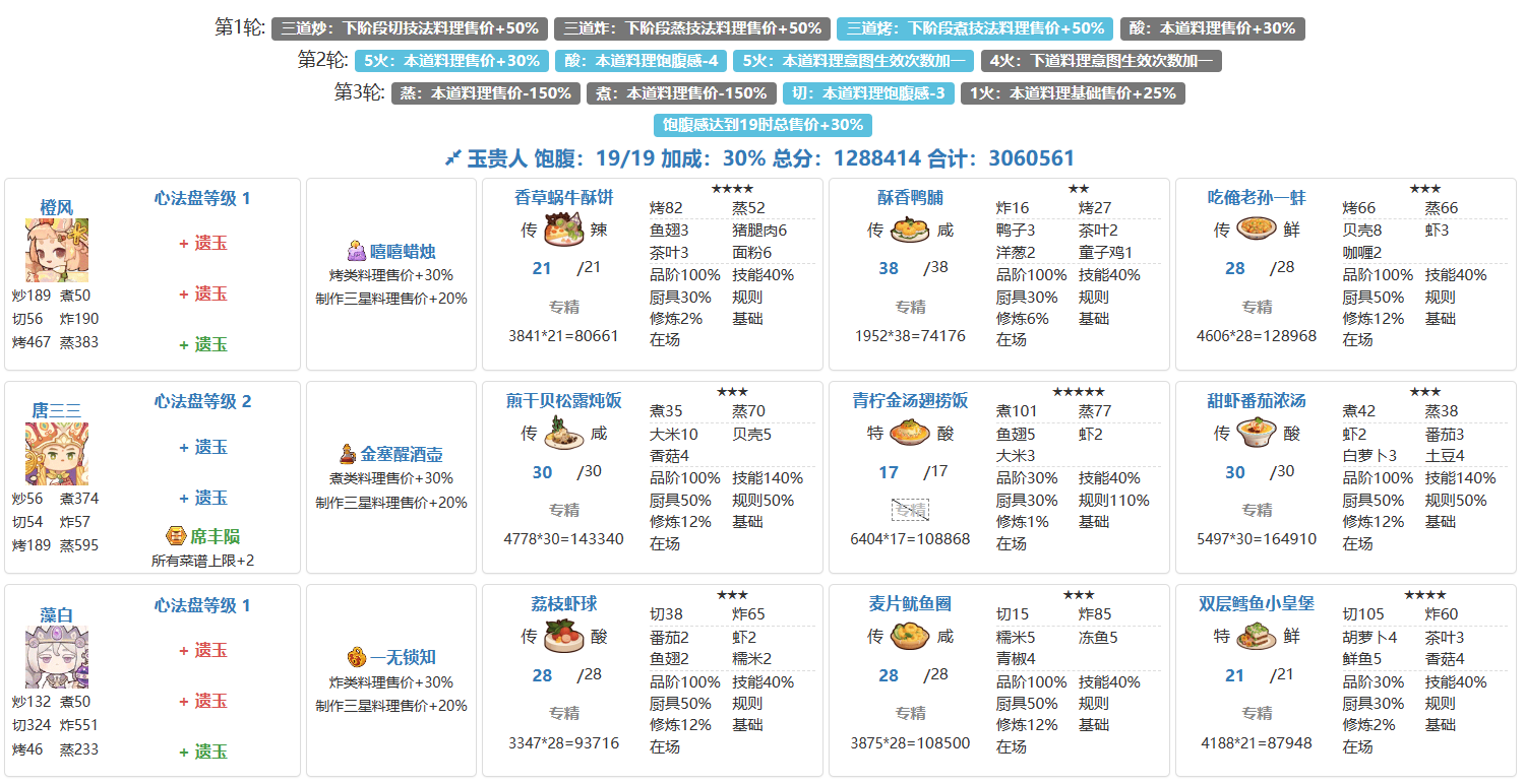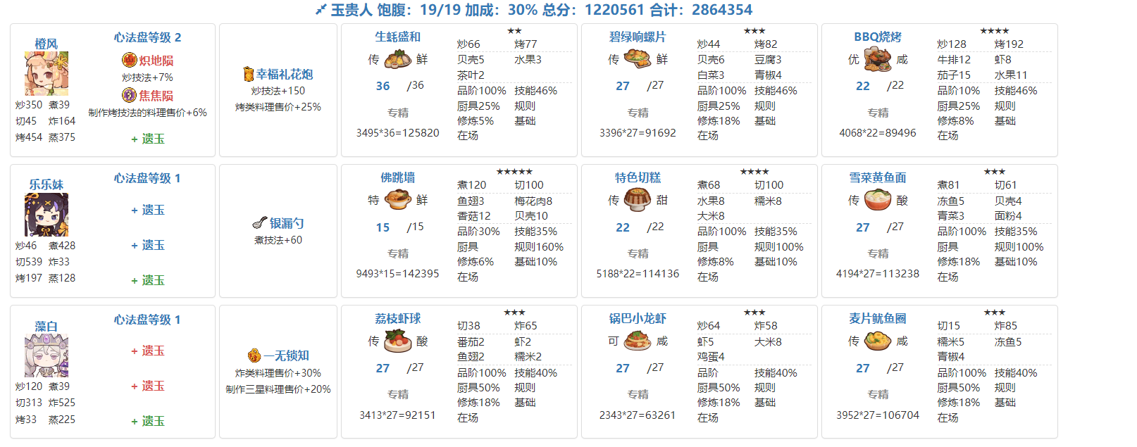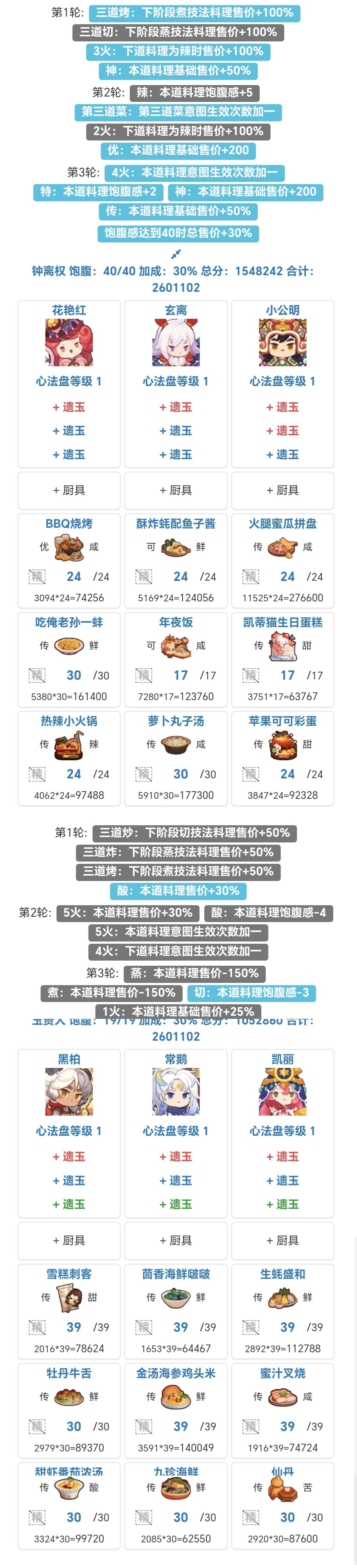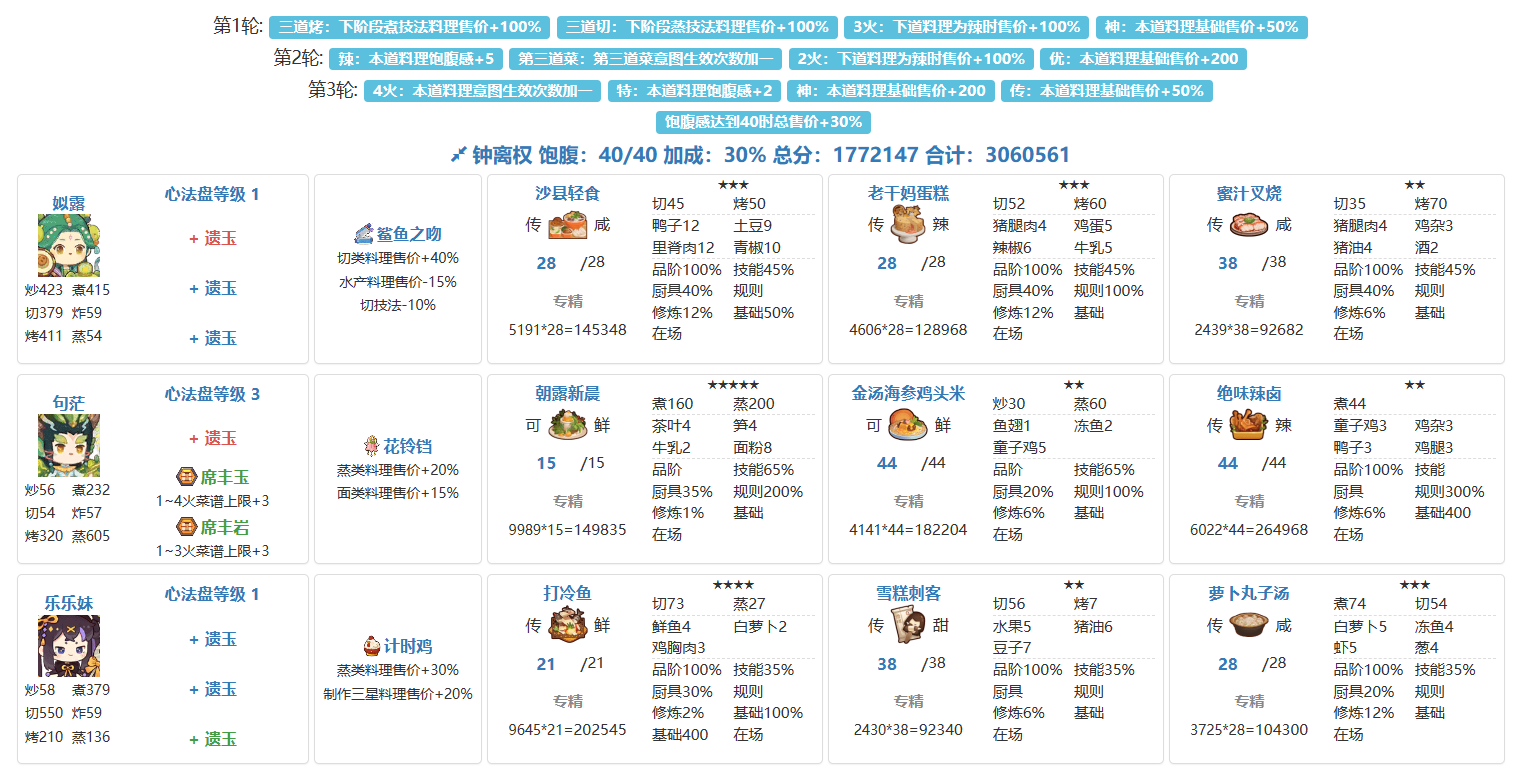 🧱前排提醒相比较去年1006,这次可以稳五档了。本方案三四火上限越高越轻松,可以通过遗玉系统补分。特别注意东华的第一道菜必须是特品级,否则会抢第二道的加成。🧱菜谱优化①冬阴功汤/鱼子酱上位> 醇香合饮②自热煲仔饭上位> 红蟳米糕/抹茶喷泉/森林烩藜麦/银河蛋糕。③蜜汁叉烧上位> 生蚝盛和🧱厨师优化①若有修过的南飞,可走烤切替换乐乐妹②东华已修,若有洛花可以走传鱼子酱,