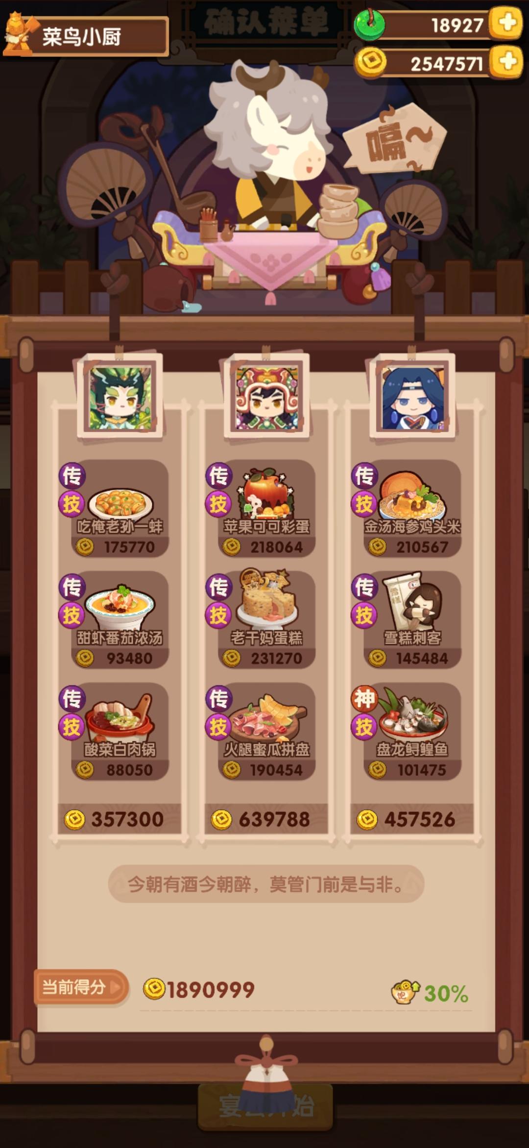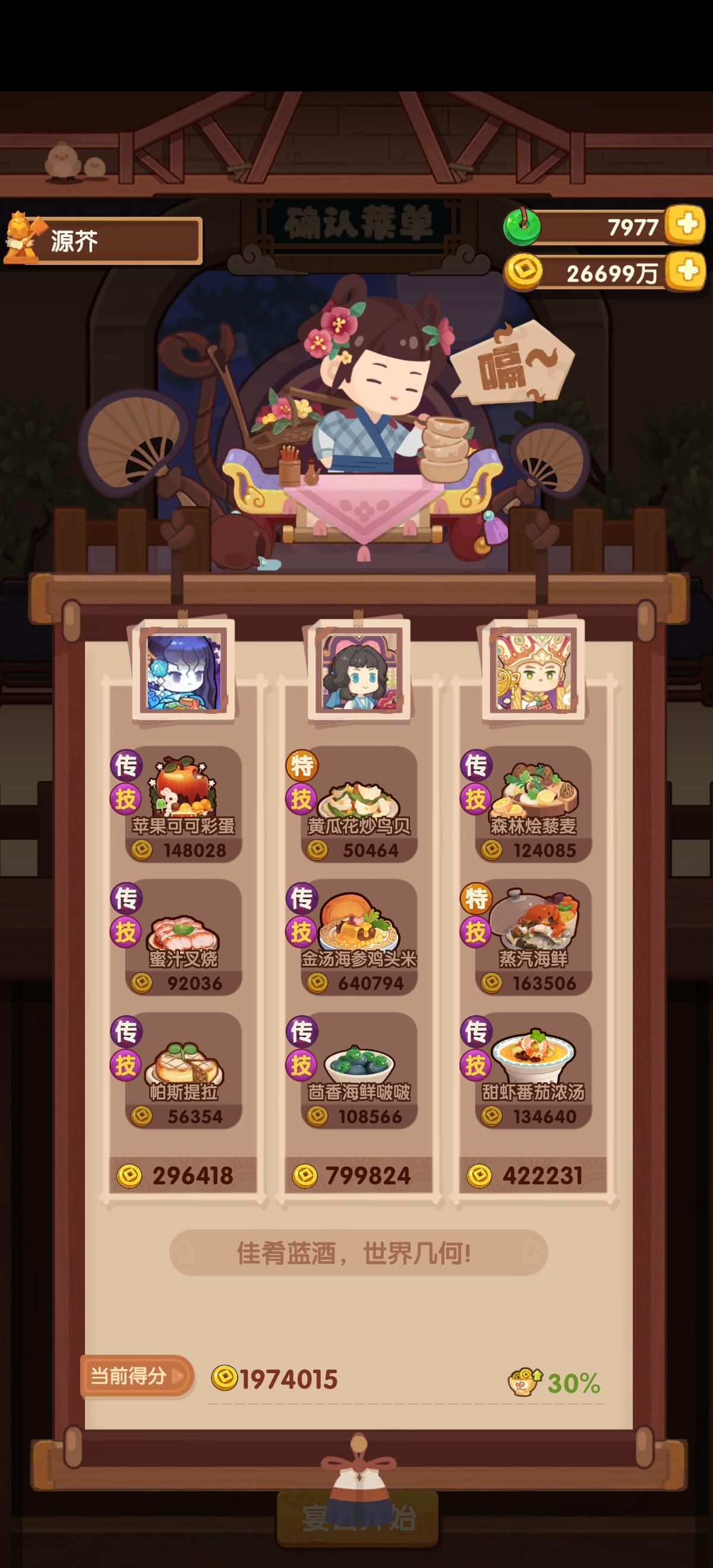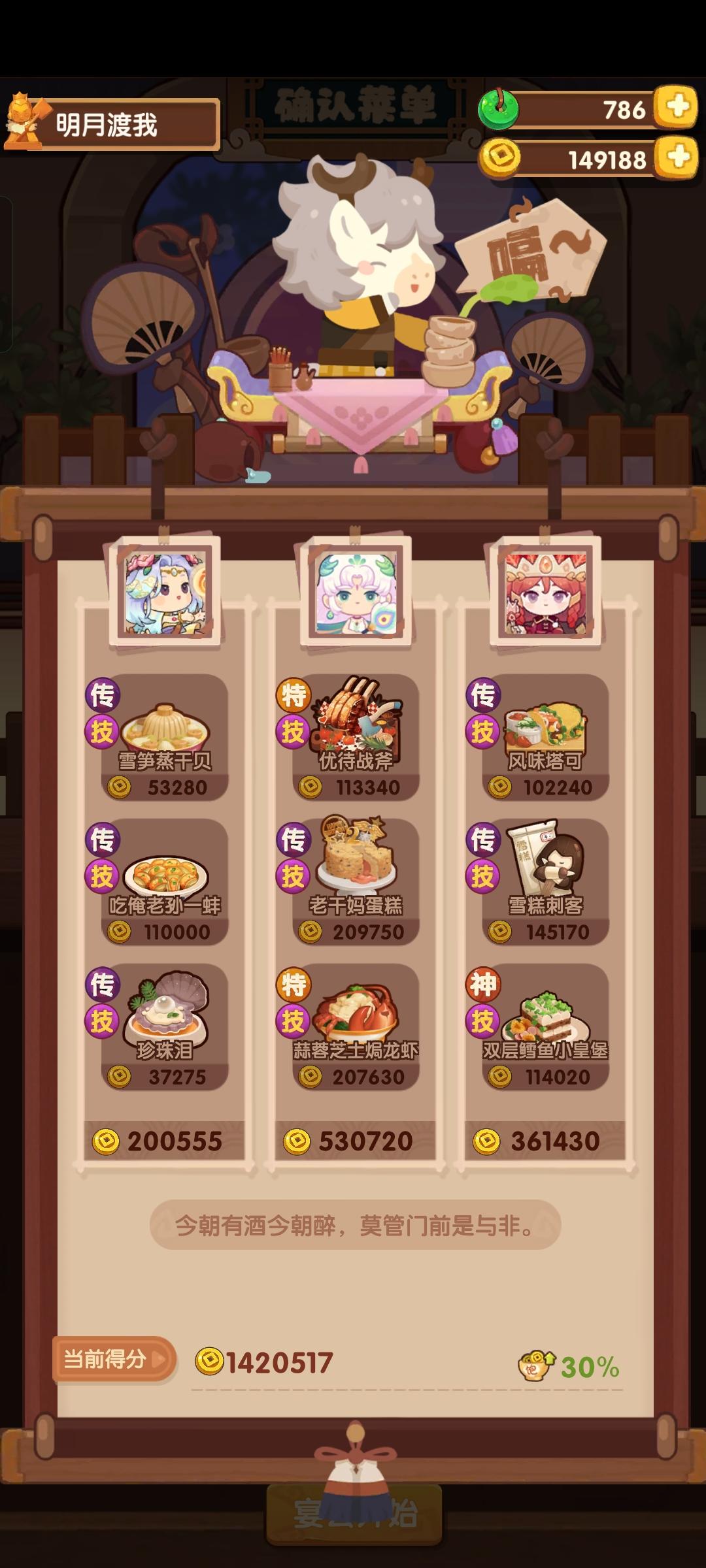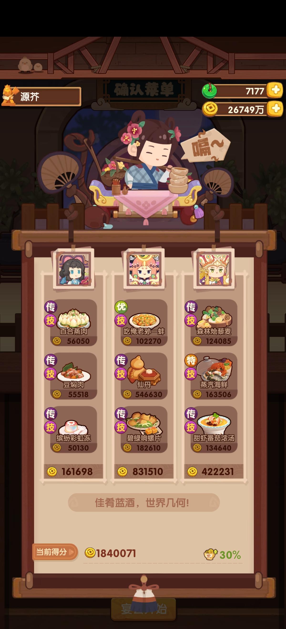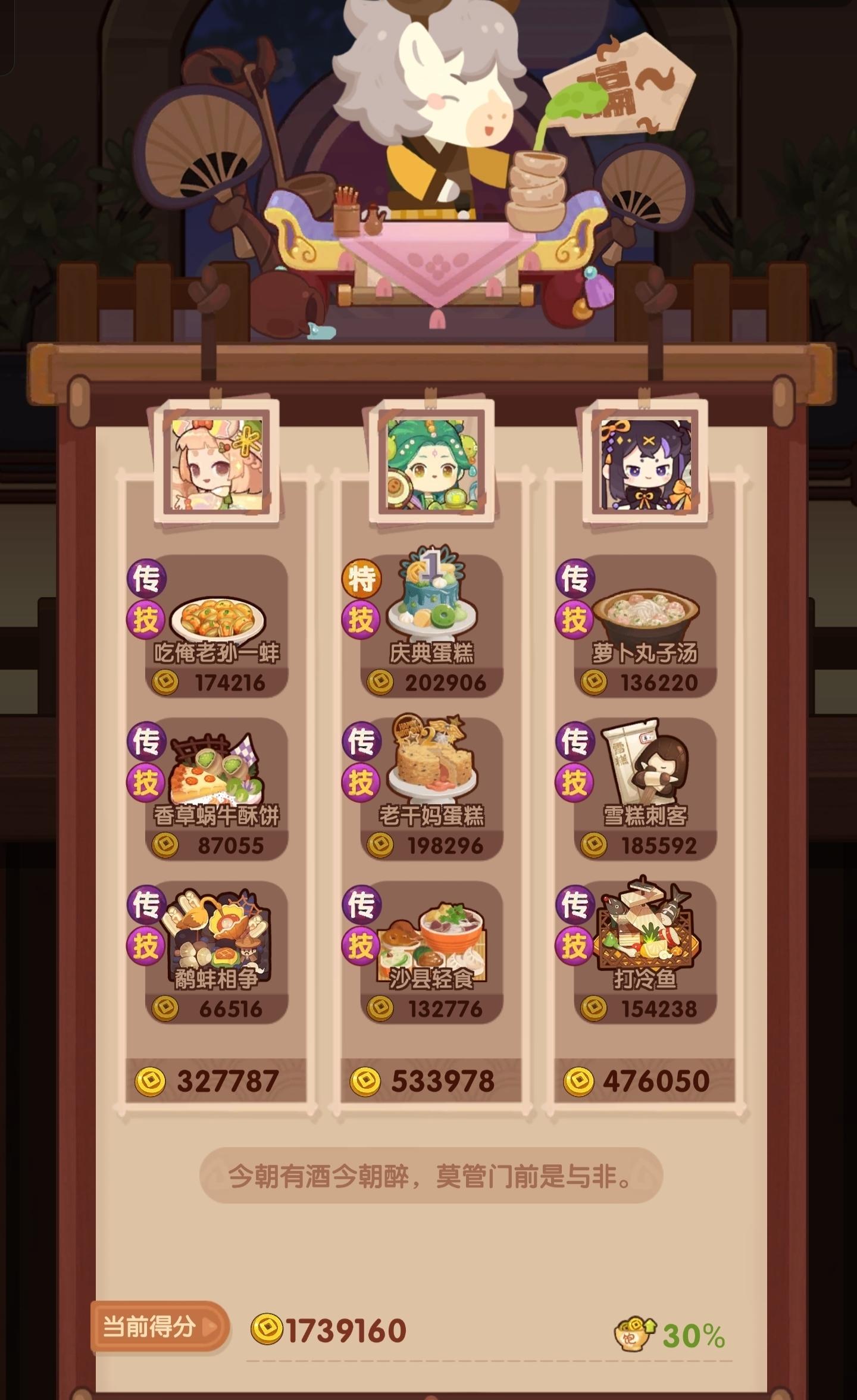 今天有点事作业晚点记录,省宴367w这是本年度最后一次宴会,蓝铁组合第一次在省宴出现,不过规则可以追溯第一次省宴三贵客,和蓝何铁中的蓝铁是一样的这一次做了354w分,较半年前也算有了不少的进步,清凝我是戴了厨具所以比拉琪更好,而且能让玉涂做优级吃俺老孙,不然可以换成老干妈之类的参考论坛作业修改了一下一贵客方案,使用金汤海参鸡头米作为顶分菜,详见p3,提升到了367w,不过有生蚝应该还是炒烤比