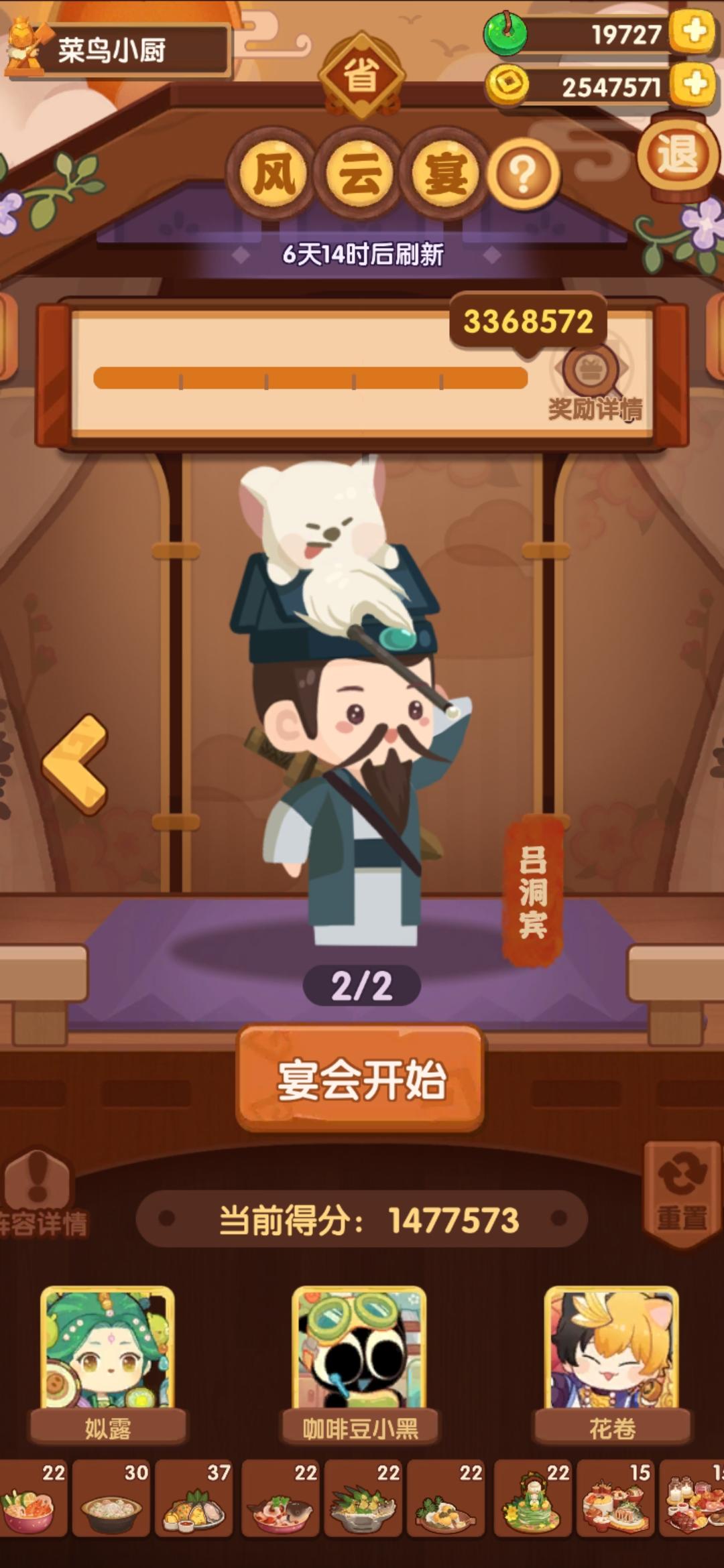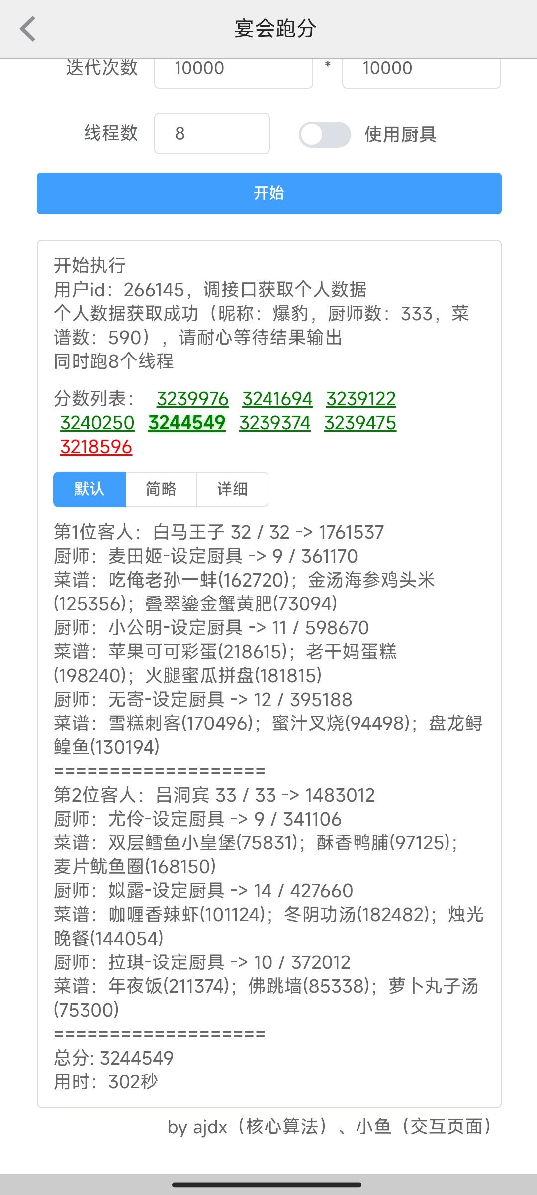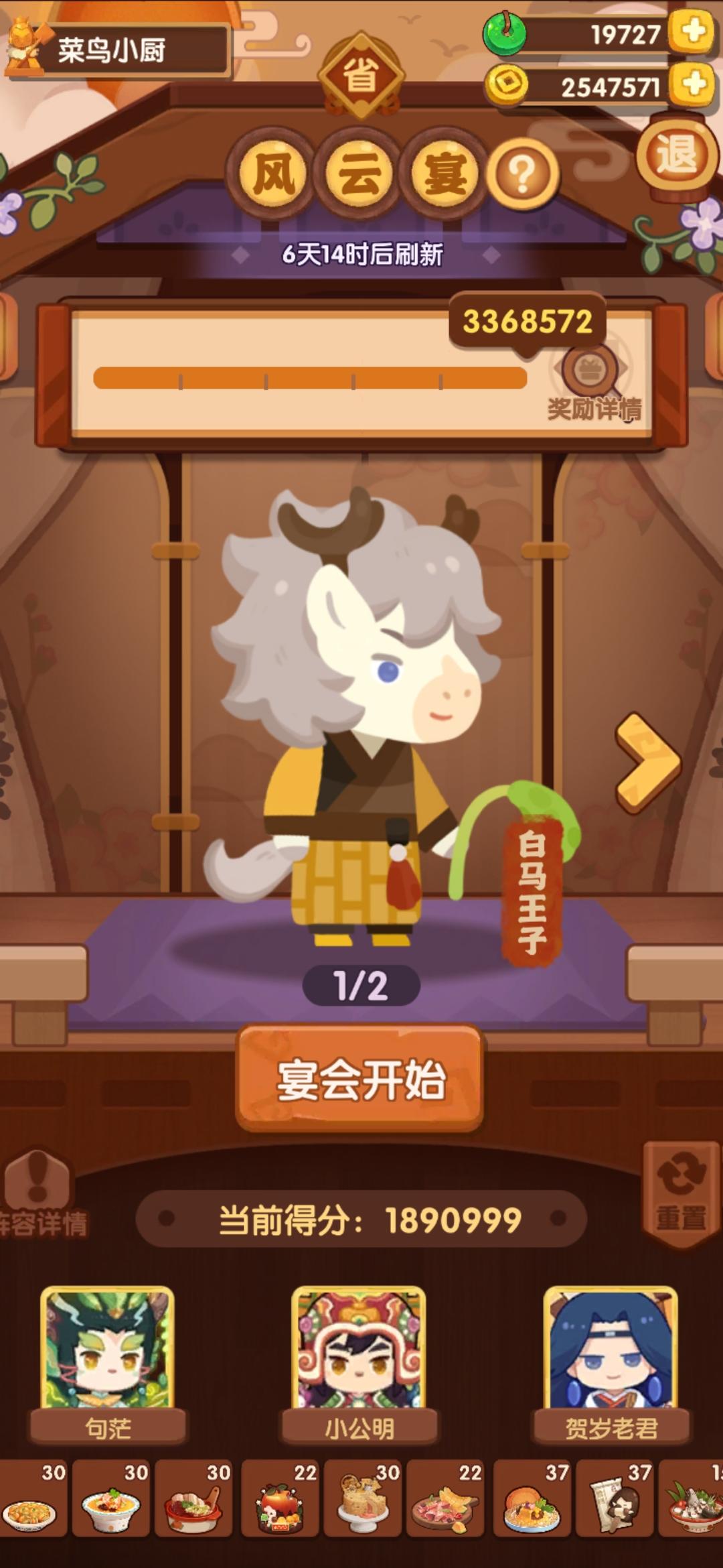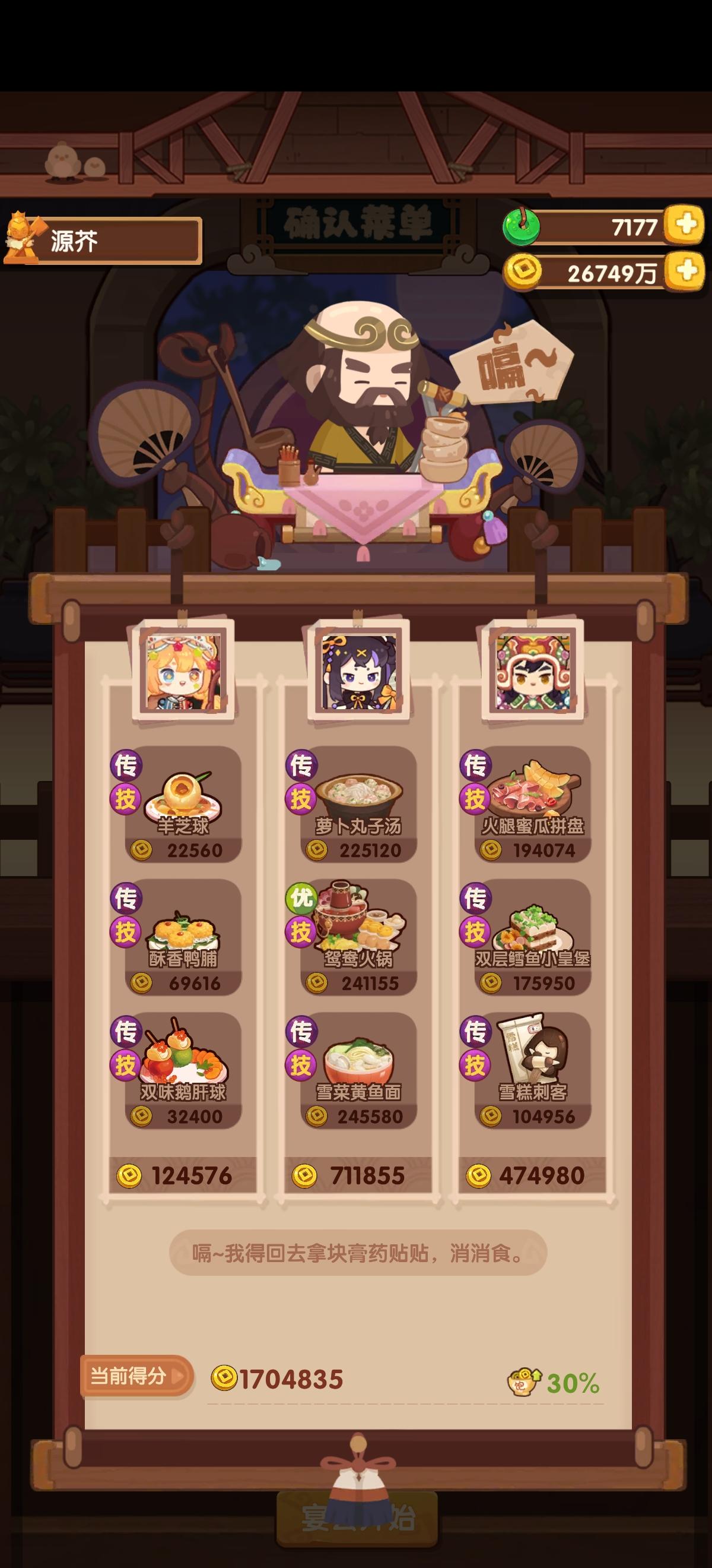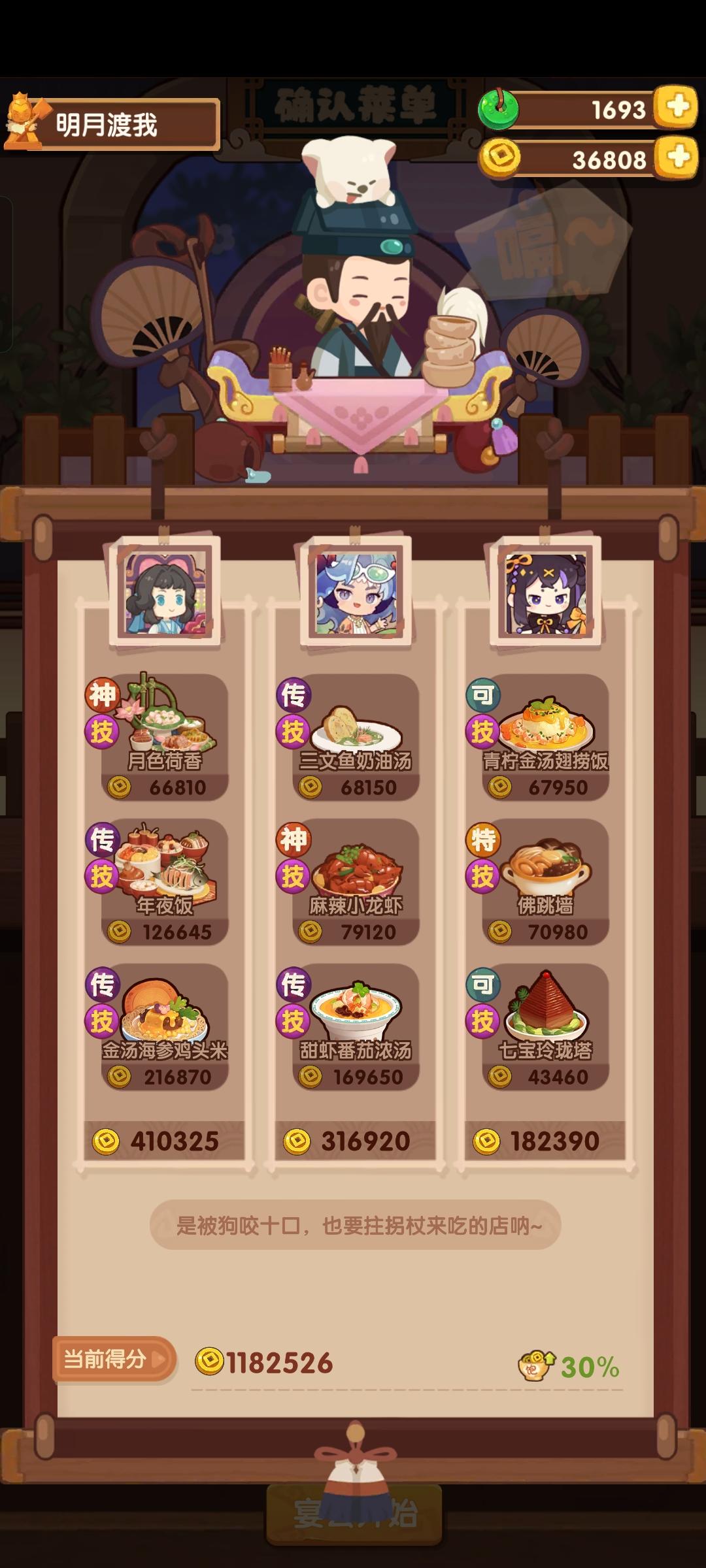 今天有点事作业晚点记录,省宴367w这是本年度最后一次宴会,蓝铁组合第一次在省宴出现,不过规则可以追溯第一次省宴三贵客,和蓝何铁中的蓝铁是一样的这一次做了354w分,较半年前也算有了不少的进步,清凝我是戴了厨具所以比拉琪更好,而且能让玉涂做优级吃俺老孙,不然可以换成老干妈之类的参考论坛作业修改了一下一贵客方案,使用金汤海参鸡头米作为顶分菜,详见p3,提升到了367w,不过有生蚝应该还是炒烤比