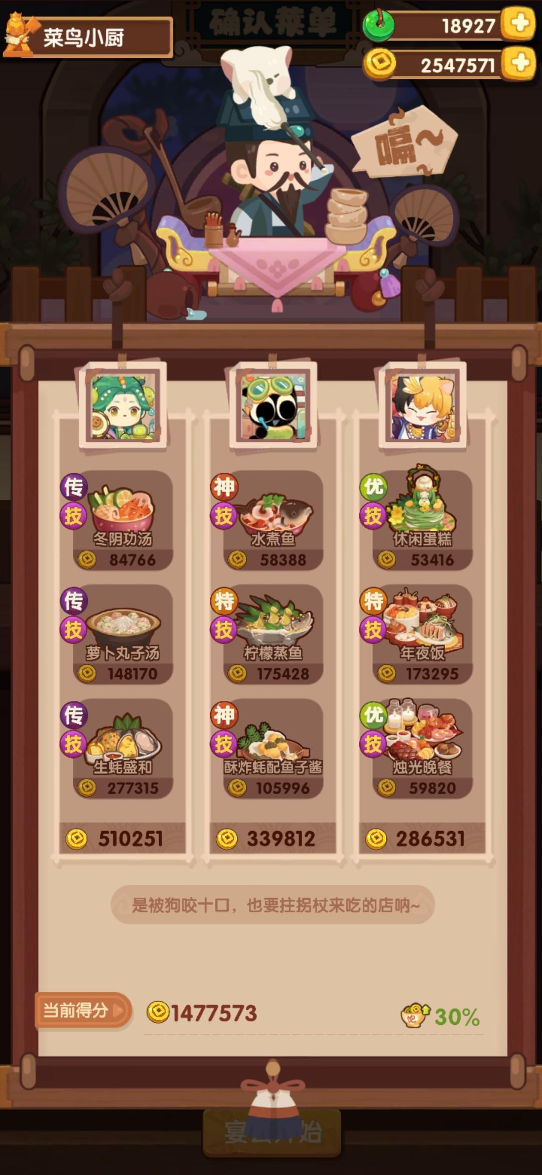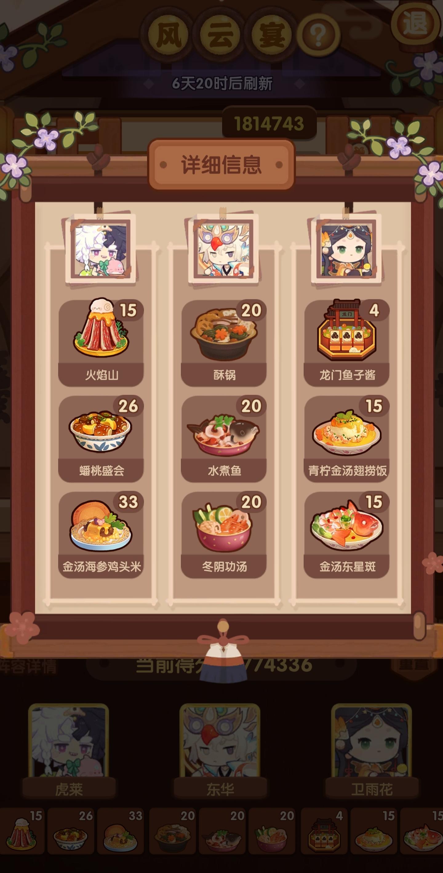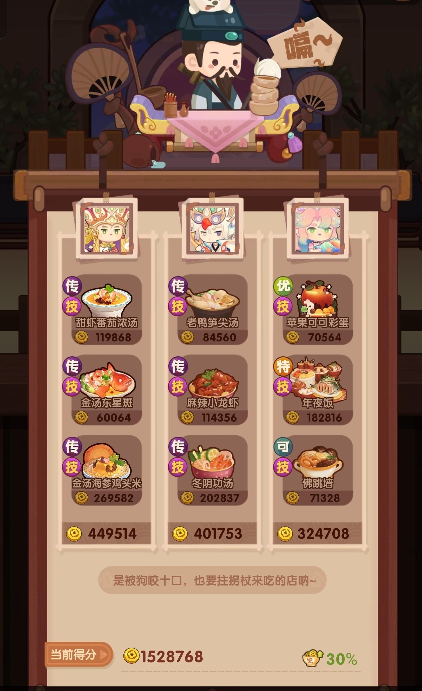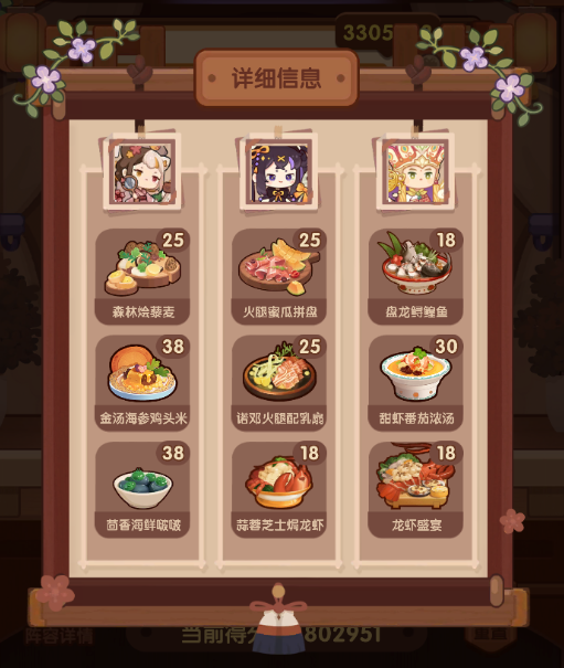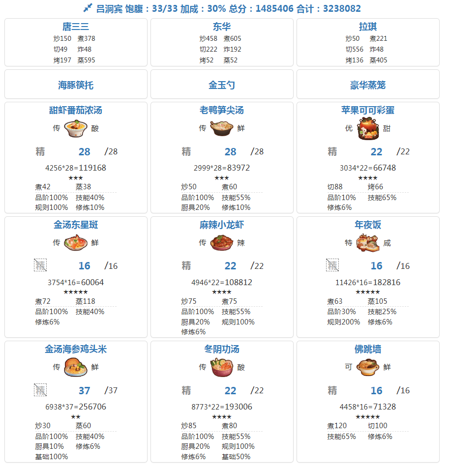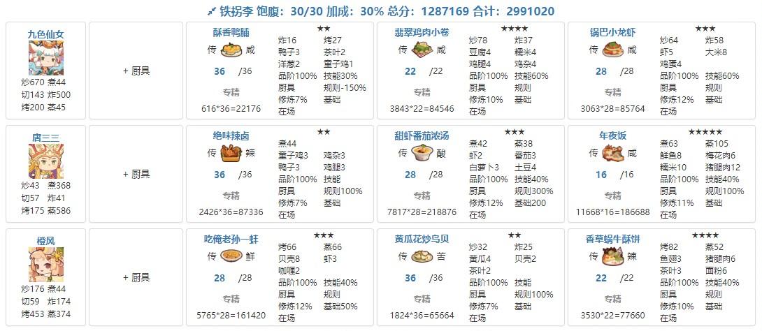 国际惯例的全员无厨具、无遗玉,修炼偏高,具体数值在P3。全员有修炼,但橙风的修炼不影响结果。售价修炼和我差不多但五星菜谱上限只有17也适用,但需要月色荷香和蒜蓉芝士焗龙虾的专精。全菜谱无专精的情况下总分3273766。【替代方案】没有龙虾盛宴的,可以用豪华海鲜桶或人参果替代,三个都没有就用金汤东星斑,但需要在与上限17相同的两道菜专精,同时多加上火腿蜜瓜拼盘、诺邓火腿配乳扇和盘龙鲟鳇鱼三