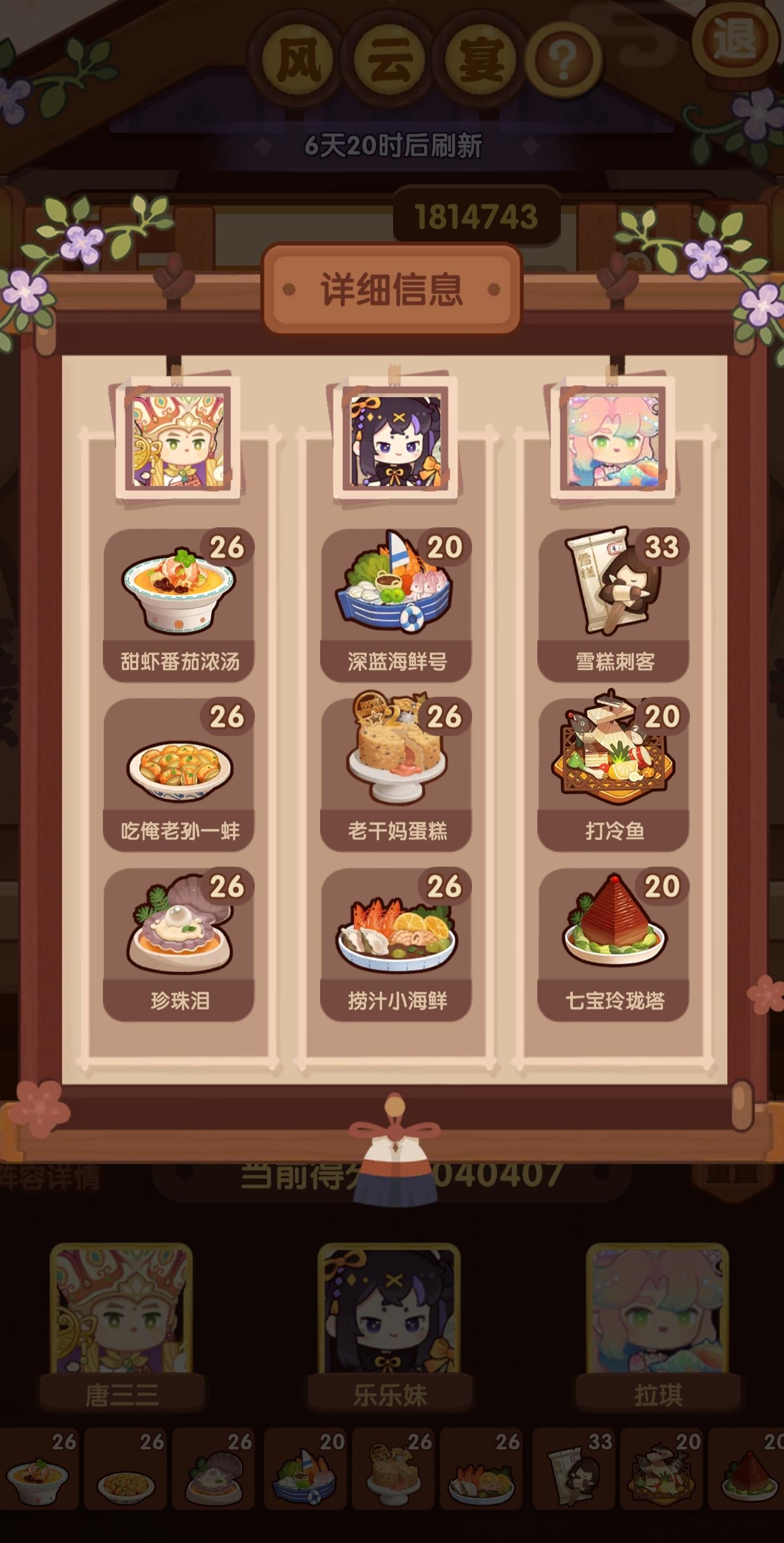 🧱前排提醒五档对于喵喵厨来说有难度,需要一定菜谱上限和基修。若试验后分差过大,建议稳四档。🧱基修提示①若姒露不能[神]庆典蛋糕,可跟苹果可可换位置(总分-1万多)②乐乐妹做[传]打冷鱼需135蒸③唐三三若不能[传]东星斑,可换朝露新晨④唐三三做[传]鸡头米需150炒,若基修不够>用更高的炒技法厨具⑤拉琪需做[特]年夜饭,而第一道菜不能超过[特],否则分会抢增益词条🐲总结:4-5影响
