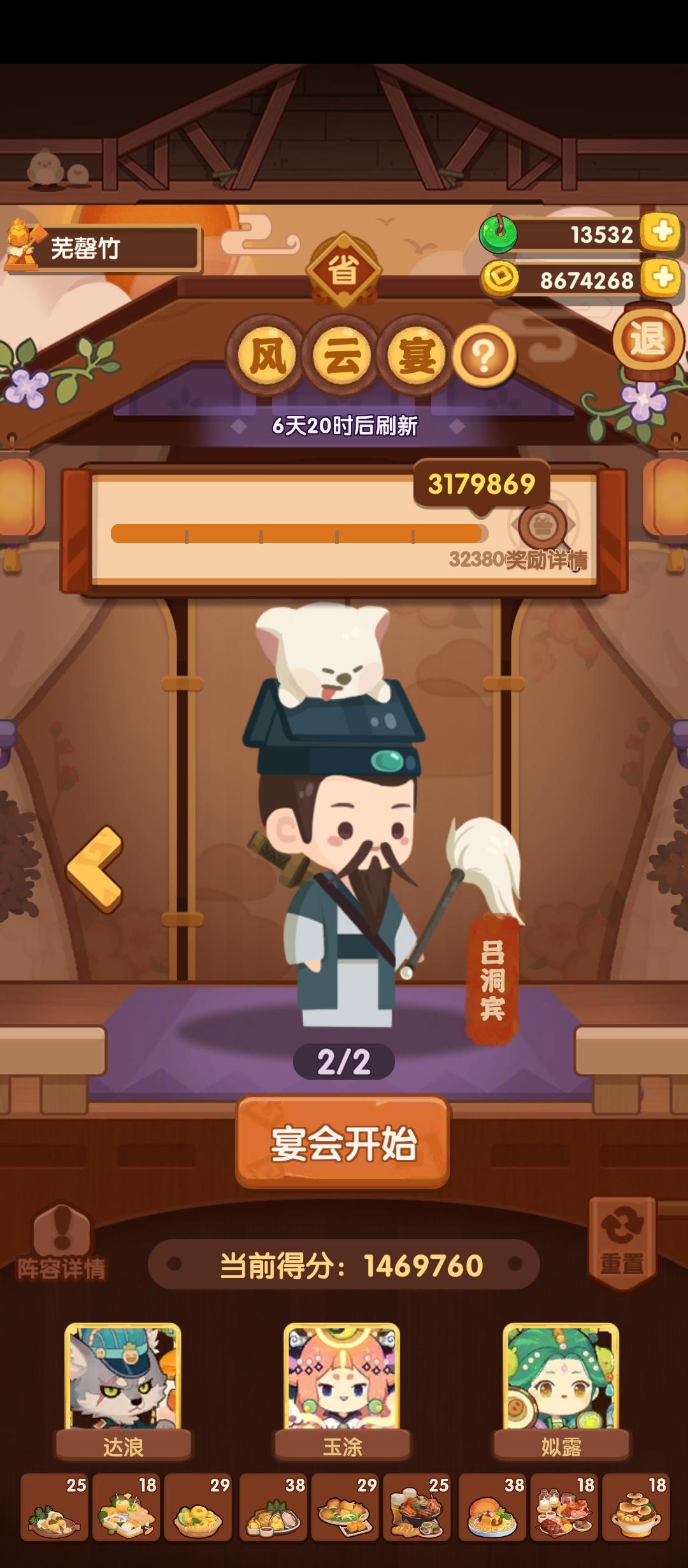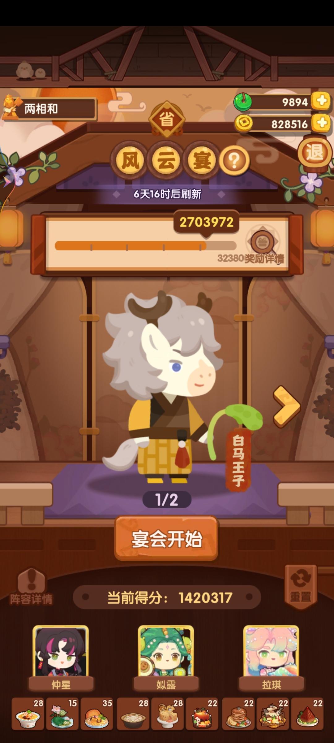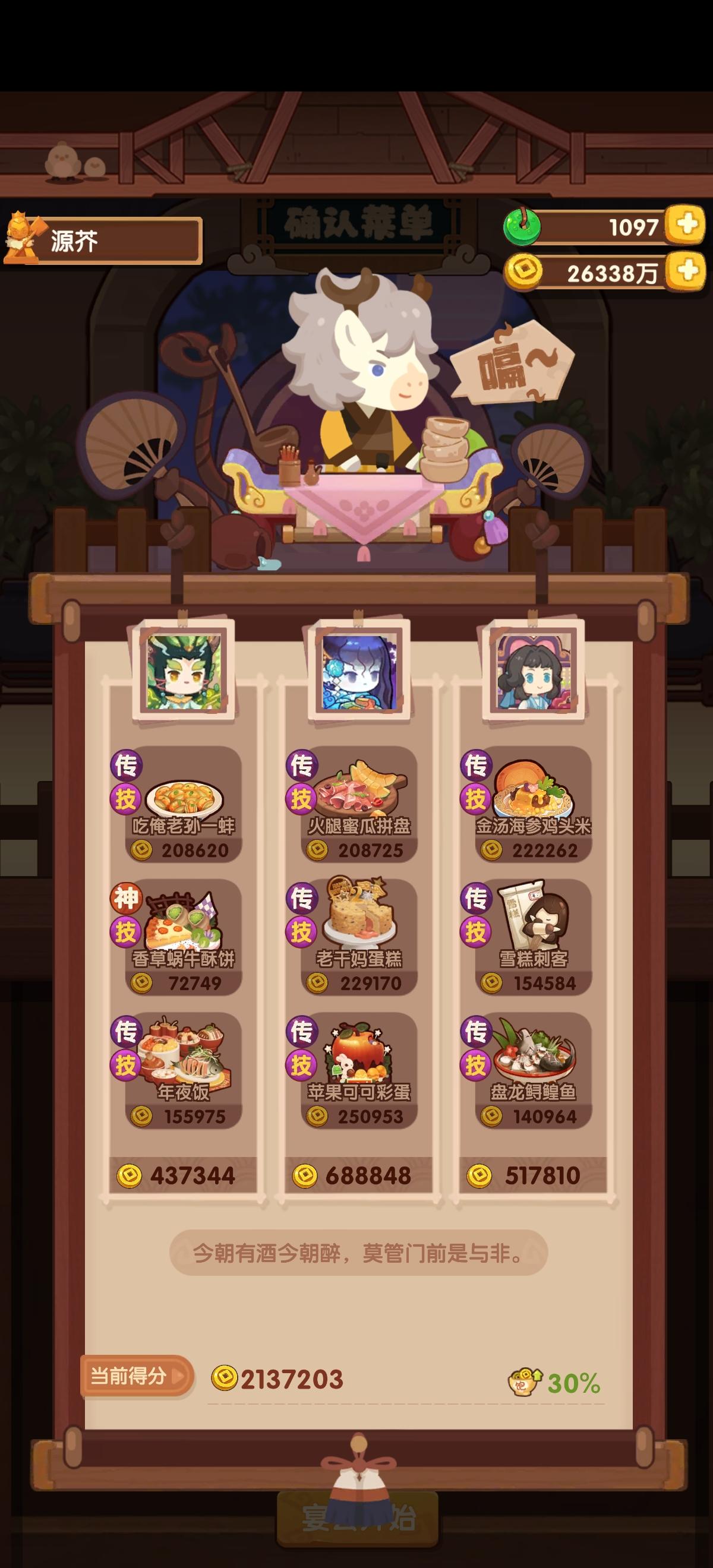 年夜饭宴会初登场,简直不要太好用图二的樱花寿司比较难换,实在没有的话就重配吧厨具:黑柏:金塞醒酒瓶,煮售价+30%,三星售价+20%藻白:一无锁知,炸售价+30%,三星售价+20%唐三三:豪华蒸笼,蒸技法+100(非必须)乐乐妹:银烤叉,烤技法+60(非必须)姒露:豪华甜品架,切售价+30%,三星售价+20%橙风(已修炼):嘻嘻蜡烛,烤售价+30%,三星售价+20%