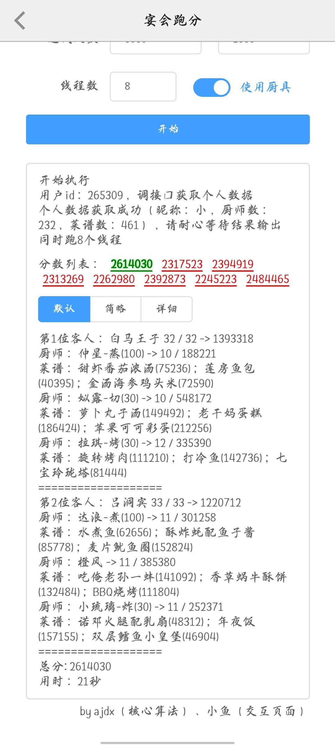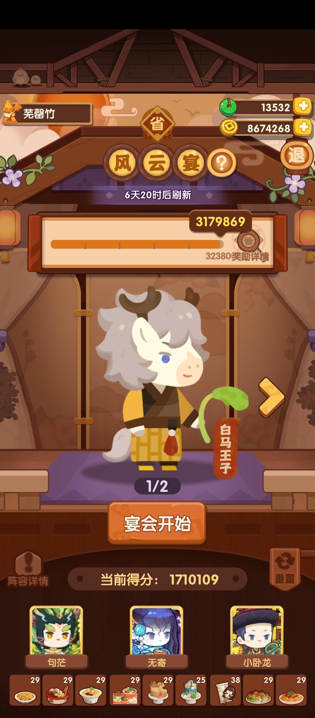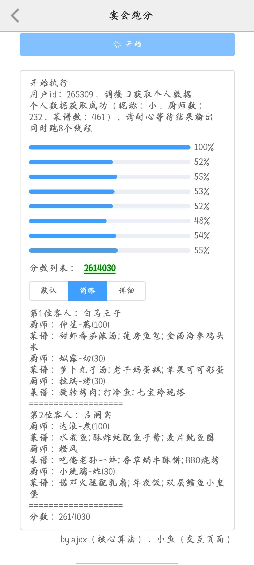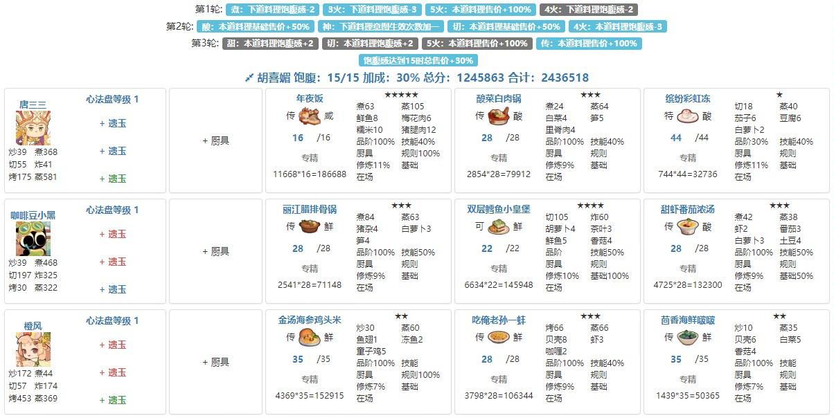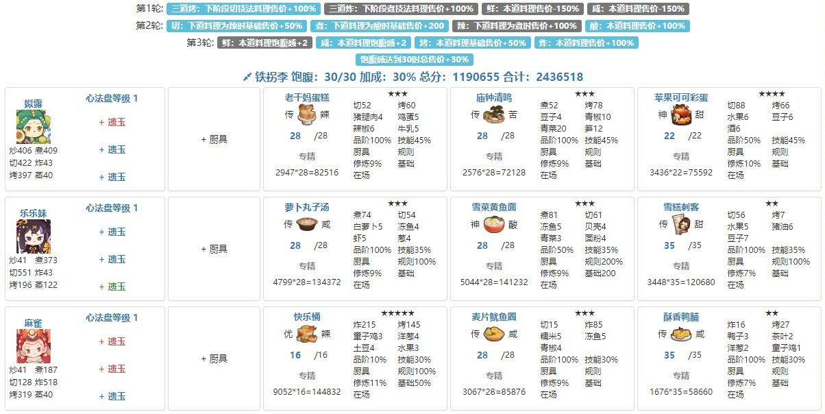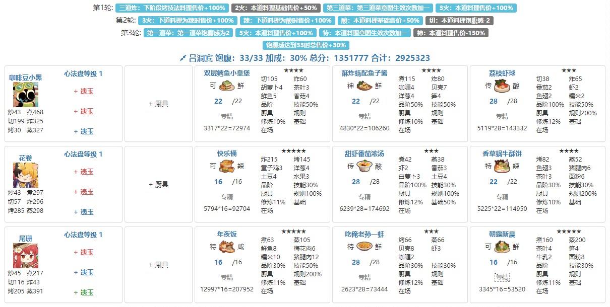国际惯例的全员无厨具、无遗玉,修炼偏高,具体数值在P3。全员有修炼,售价修炼和我差不多但五星菜谱上限只有17也适用。五星菜谱上限只有17且全菜谱无专精的情况下总分2645815,上限18且全菜谱无专精的情况下总分2654883。【替代方案】分数溢出三十万,这替代说实话没啥好说的。戚芷戈没修炼可以去找尤伶,乐乐妹没修炼去找小公明。【闲聊】我恨逐渐变暖然后又突然变冷的冬天。