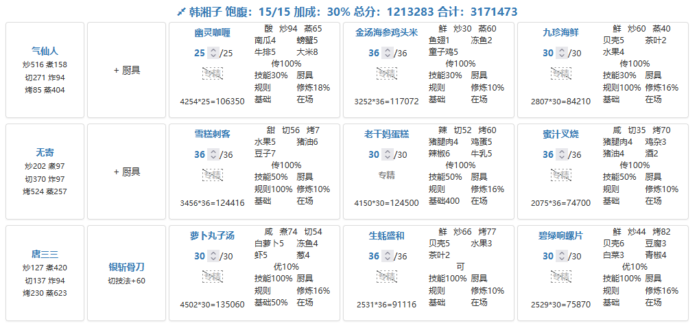 只装了新手池子的厨具的满档作业,修炼偏高,具体数值在P3。全员有修炼,缺一不可。因全菜谱无专精的情况下无法满档,因此至少需求老干妈蛋糕+年夜饭+优待战斧的专精,总分3171473。【替代方案】上了修炼了的唐三三和年夜饭才搞出踩线过的作业,没那玩意。【闲聊】谢邀,人活着,作业晚出是被作业折磨的。从开游戏看人看满档分数线,到去计算器里算出作业已经三四个小时了,我死活都掏不出无厨具还全无专