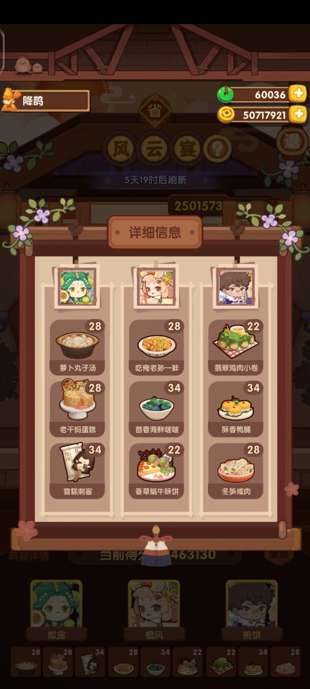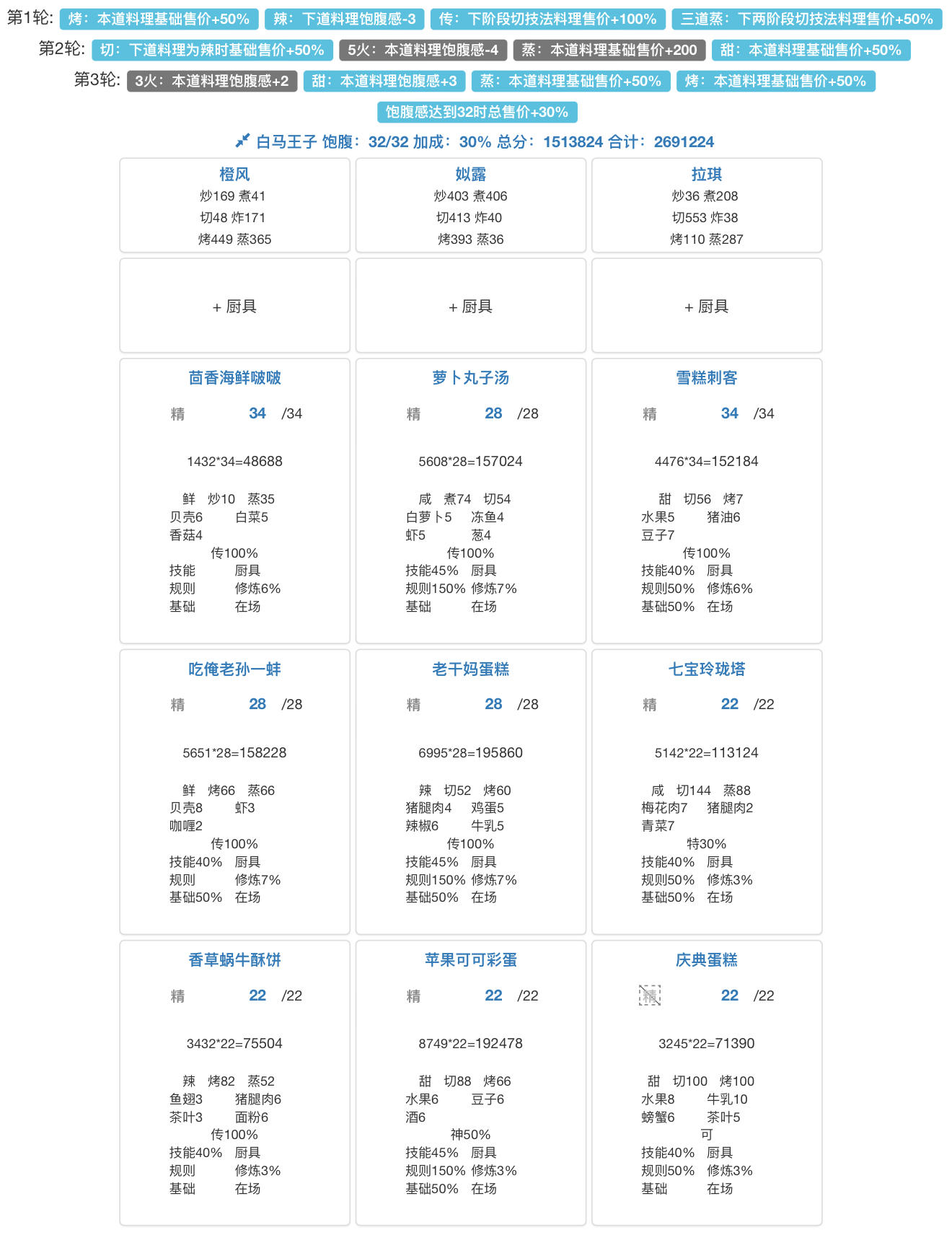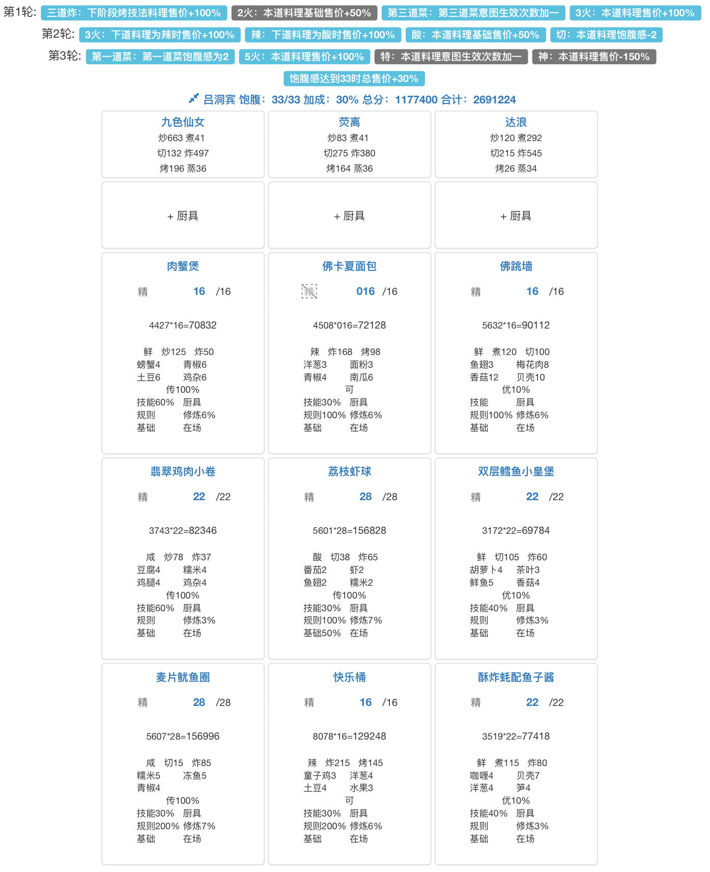 国际惯例的全员无厨具,修炼偏高,具体数值在P3。玉涂、小公明、尤伶有修炼。本次作业用的是论坛用户【莽夫】算出的结果再尽可能的进行无后厨菜的优化,有足够的后厨菜和修炼的请直接去原帖那照搬结果:【https://www.taptap.cn/moment/459370460912549909】五火菜上限修炼不够的会因全无修炼分数不足,至少需要有老干妈蛋糕、朝露新晨、水煮鱼、痛风锅以及月色荷香五道菜