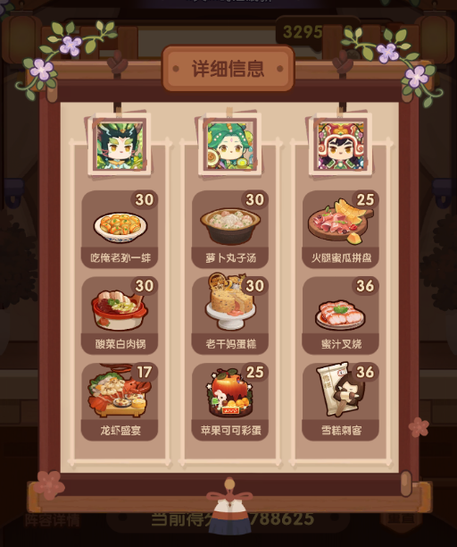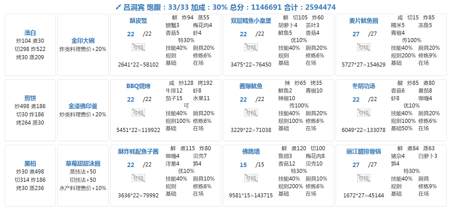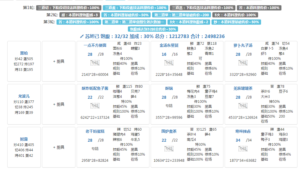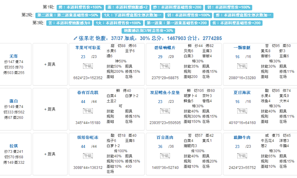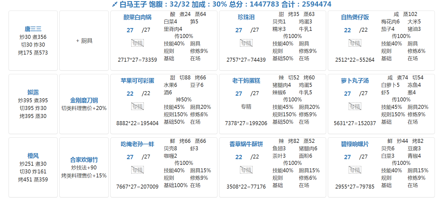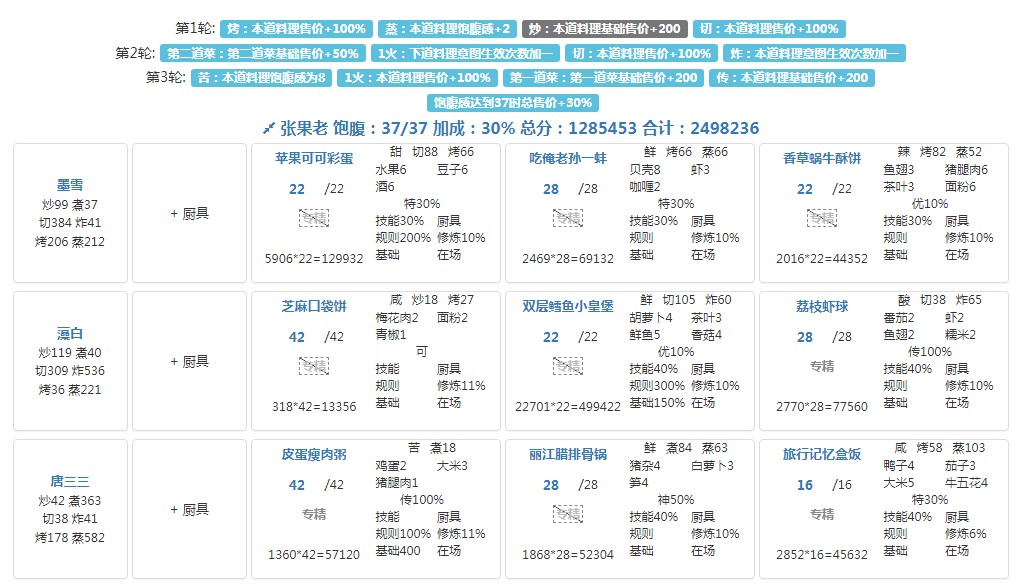 国际惯例的全员无厨具,修炼偏高,具体数值在P3。句茫有修炼,小公明有修炼但不影响结果。在修炼足够的情况下,沙嗲拼盘可换风味塔可,但会因为分数无法到满档而需要其他菜谱到达专精,和我修炼差不多的大概只需要老干妈蛋糕专精,如果没有这个程度的修炼的话,可能还需要再加个邪神烤鸡专精,又或者是简单粗暴的修炼一个菜谱可装备上限的厨子。在替换了且专精了老干妈蛋糕的情况下总分3238285,不替换且无专精的情