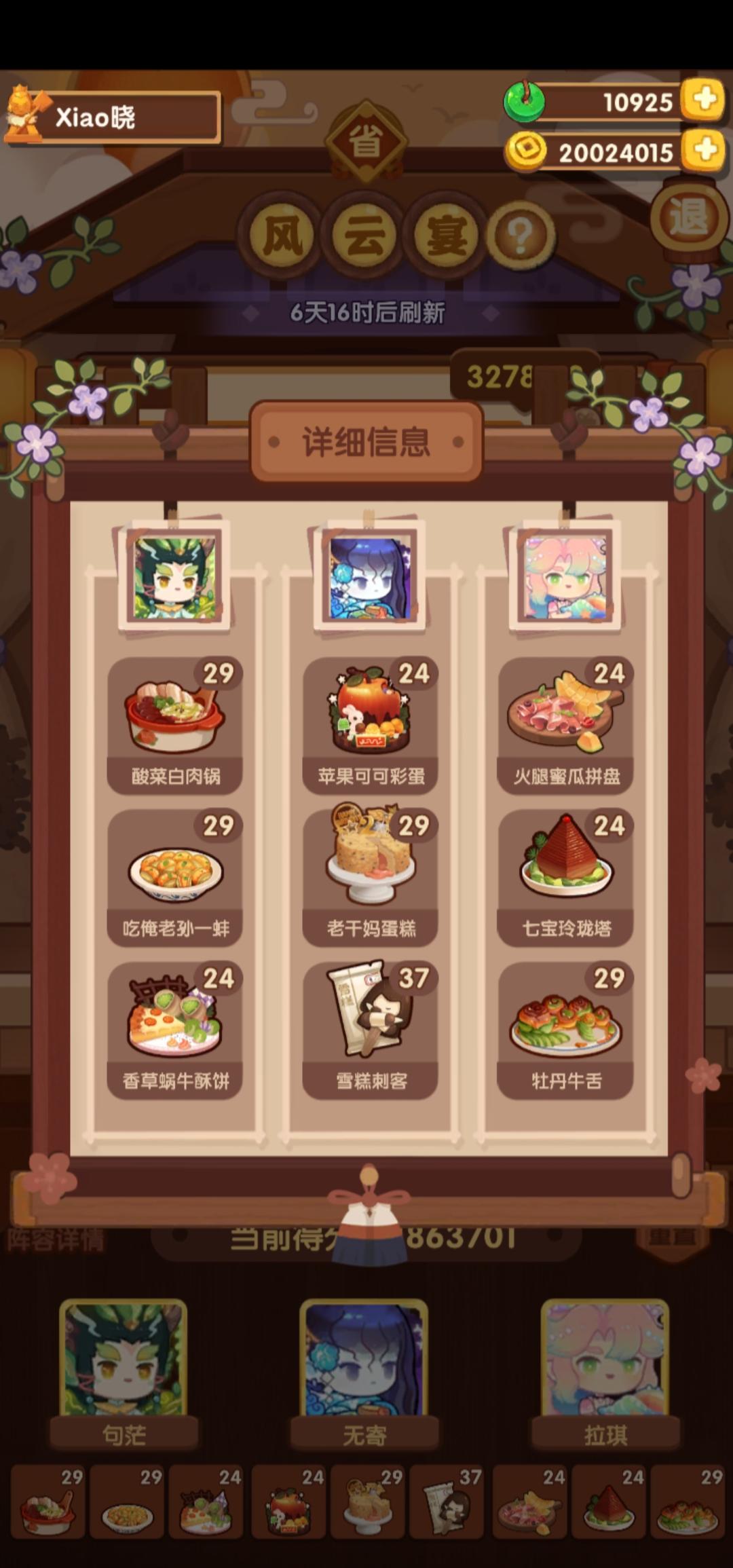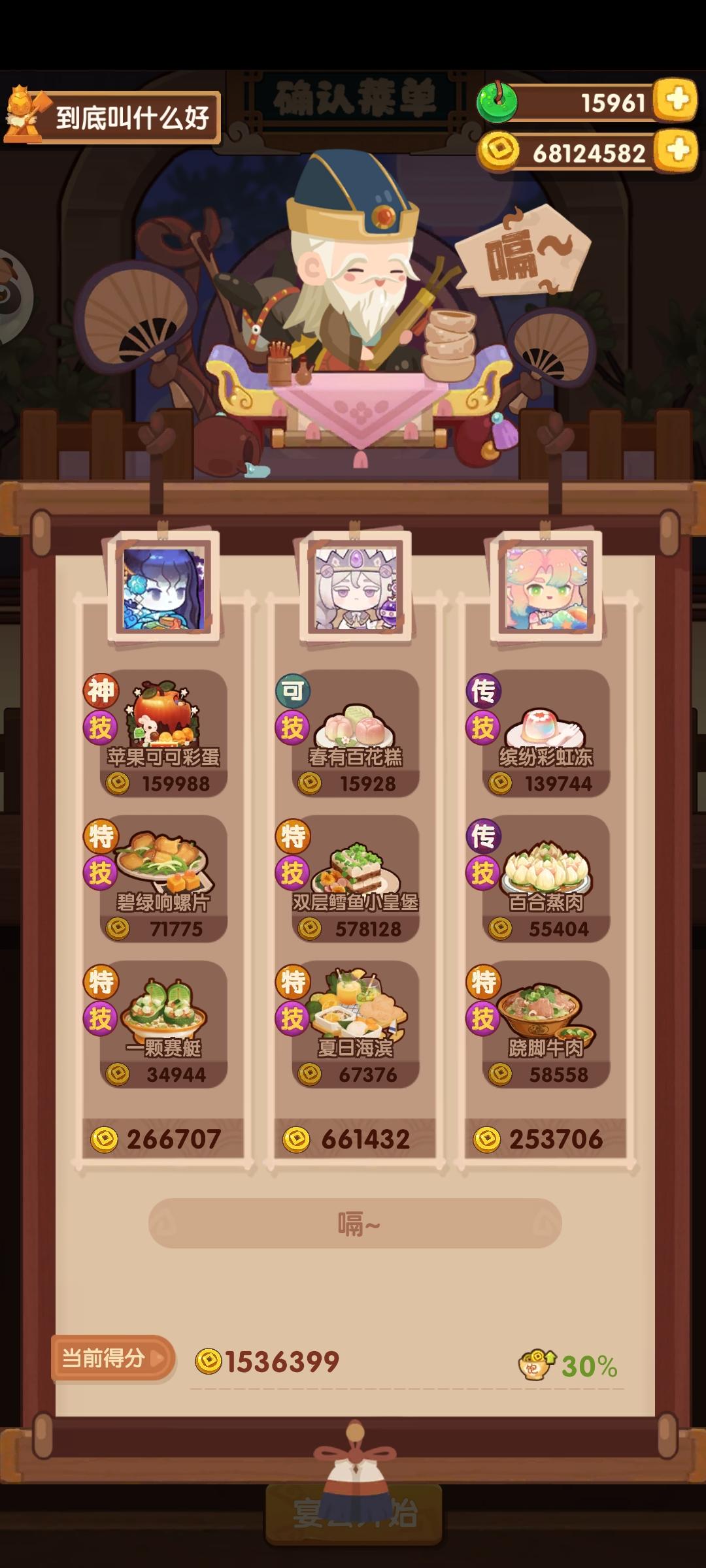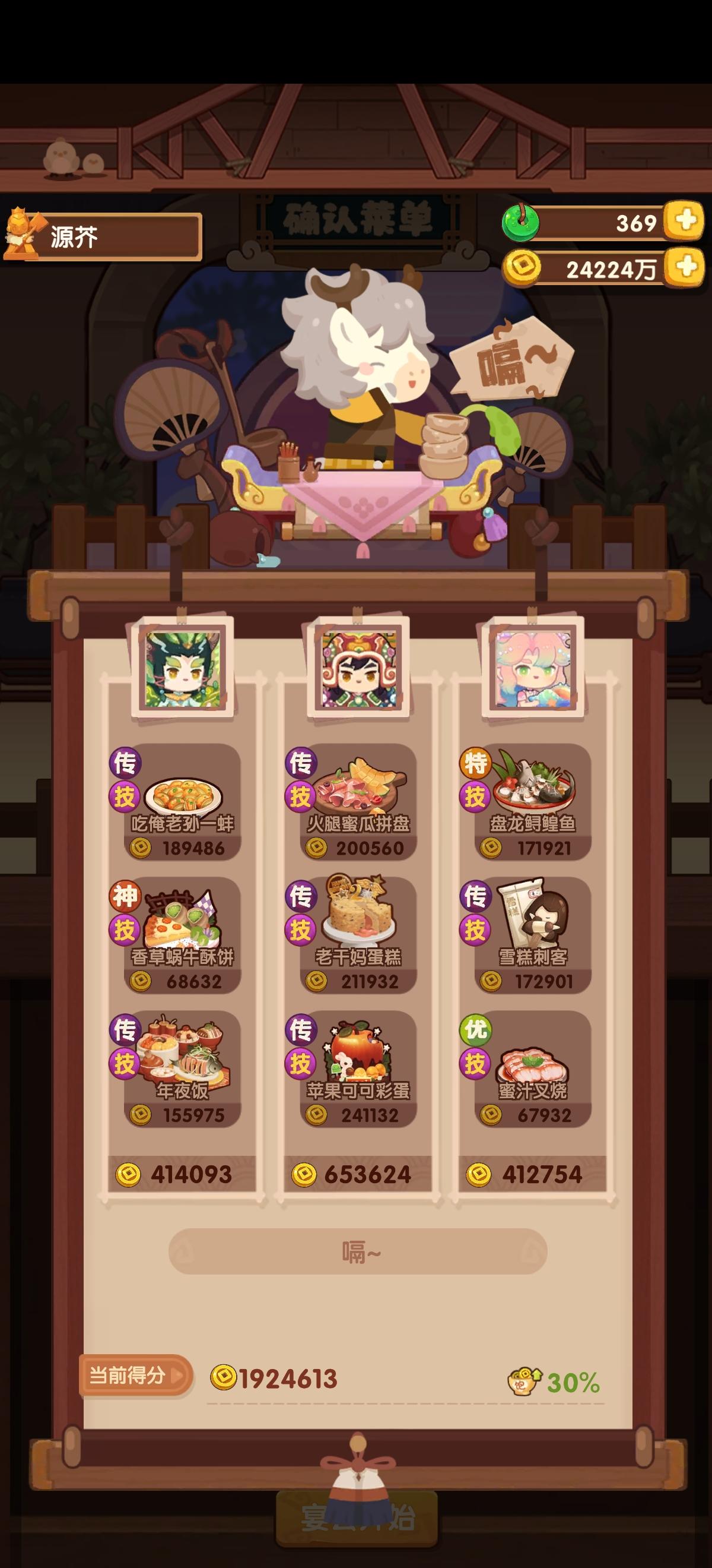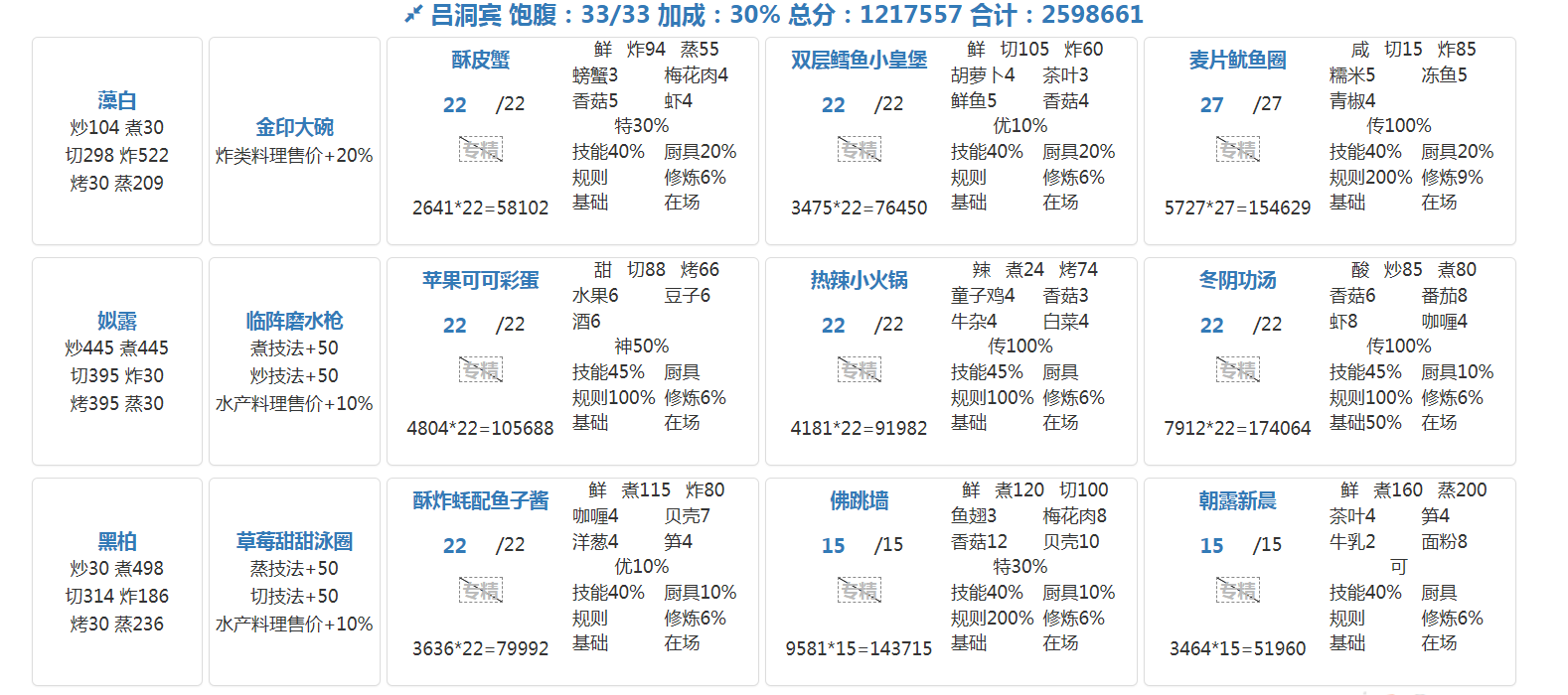 国际惯例的全员无厨具,修炼偏高,具体数值在P3。句茫有修炼,小公明有修炼但不影响结果。在修炼足够的情况下,沙嗲拼盘可换风味塔可,但会因为分数无法到满档而需要其他菜谱到达专精,和我修炼差不多的大概只需要老干妈蛋糕专精,如果没有这个程度的修炼的话,可能还需要再加个邪神烤鸡专精,又或者是简单粗暴的修炼一个菜谱可装备上限的厨子。在替换了且专精了老干妈蛋糕的情况下总分3238285,不替换且无专精的情