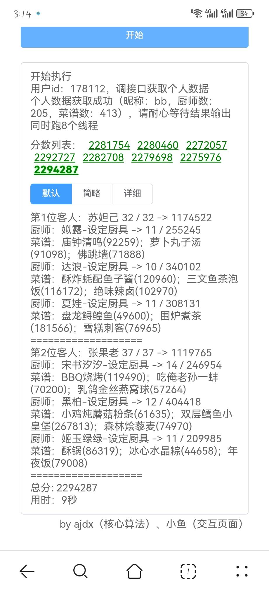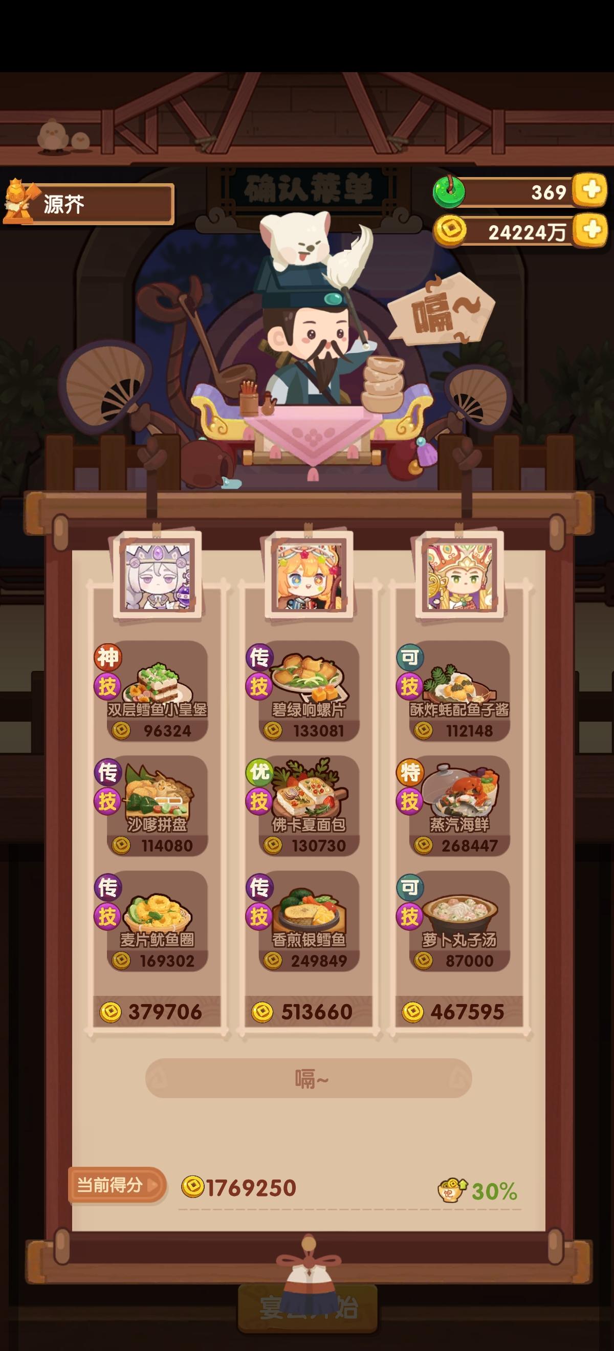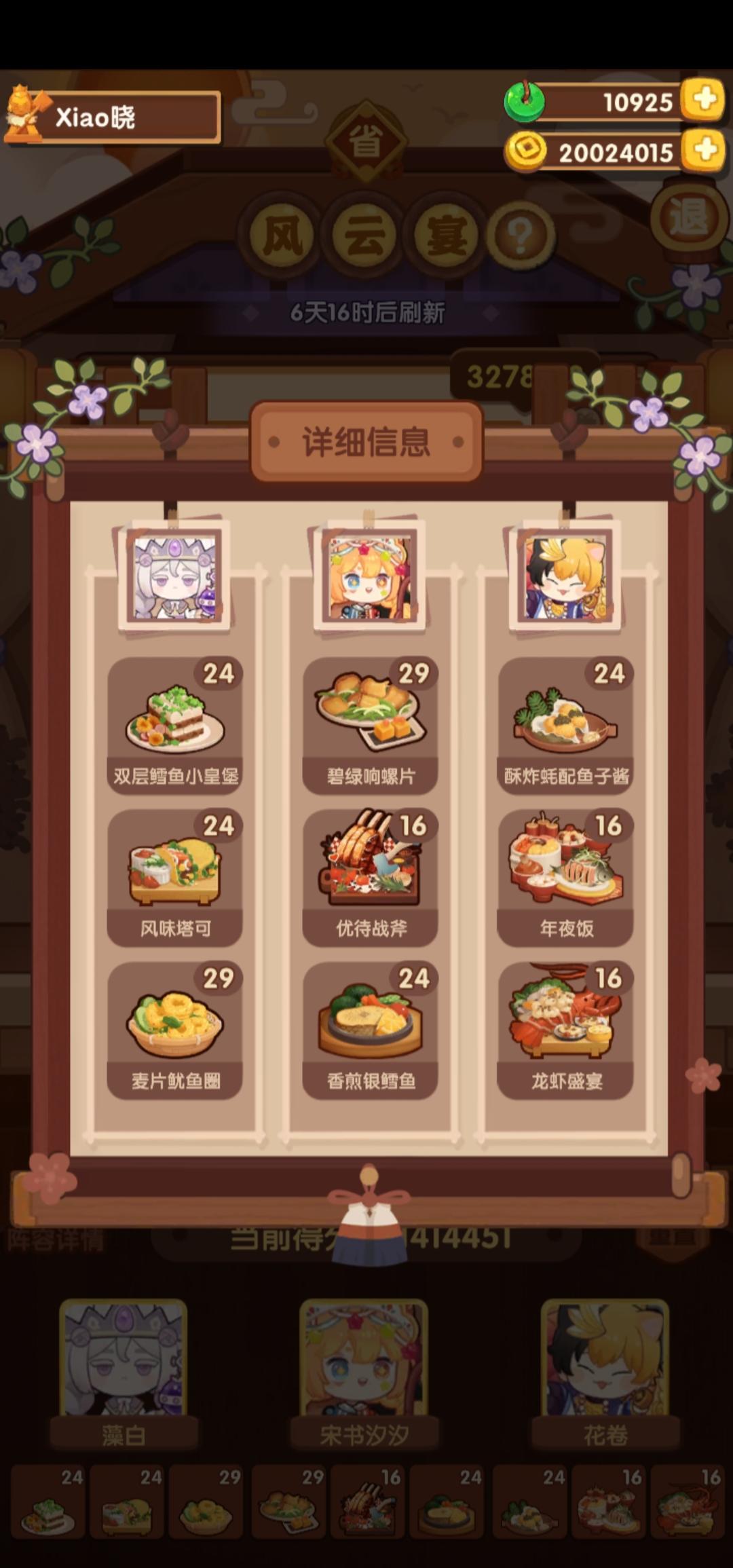 国际惯例的全员无厨具,修炼偏高,具体数值在P3。句茫有修炼,小公明有修炼但不影响结果。在修炼足够的情况下,沙嗲拼盘可换风味塔可,但会因为分数无法到满档而需要其他菜谱到达专精,和我修炼差不多的大概只需要老干妈蛋糕专精,如果没有这个程度的修炼的话,可能还需要再加个邪神烤鸡专精,又或者是简单粗暴的修炼一个菜谱可装备上限的厨子。在替换了且专精了老干妈蛋糕的情况下总分3238285,不替换且无专精的情