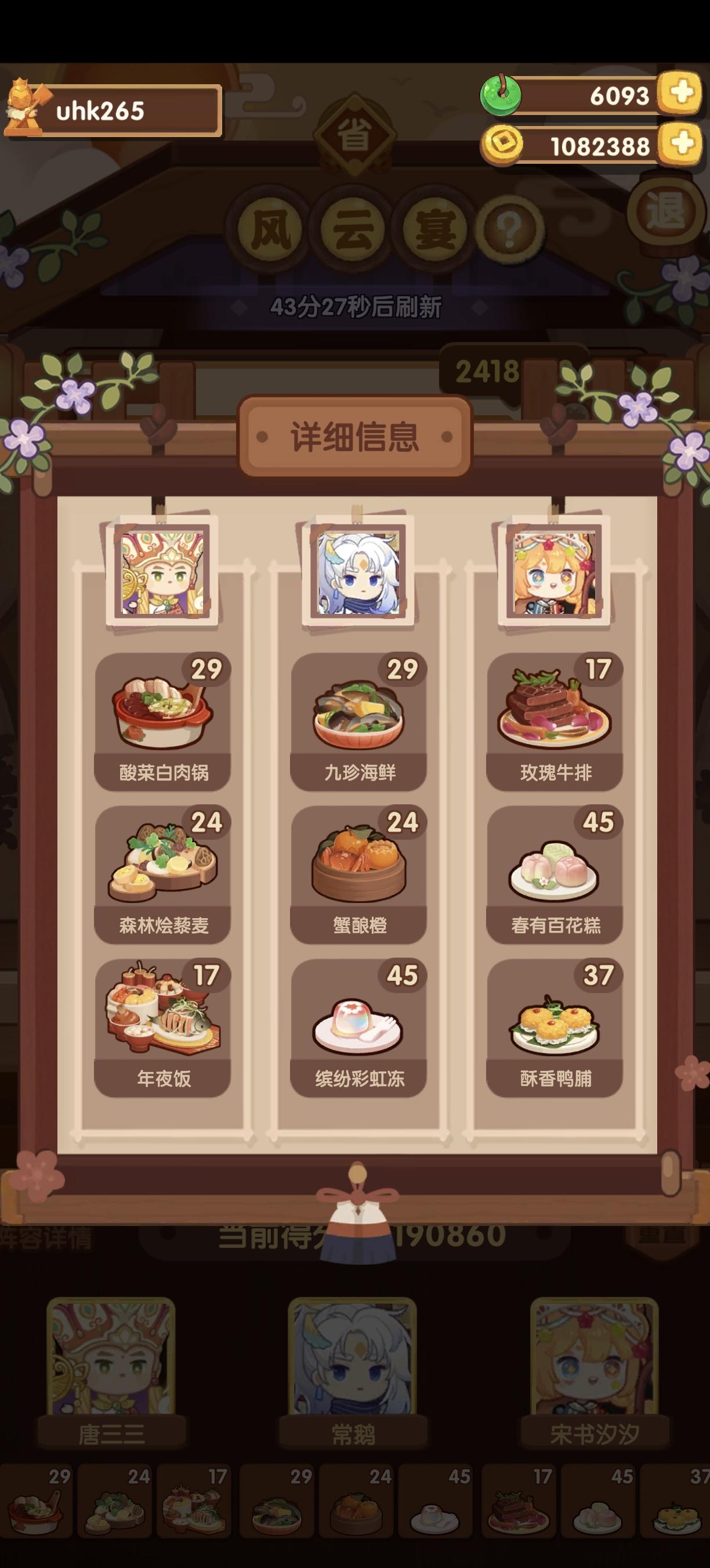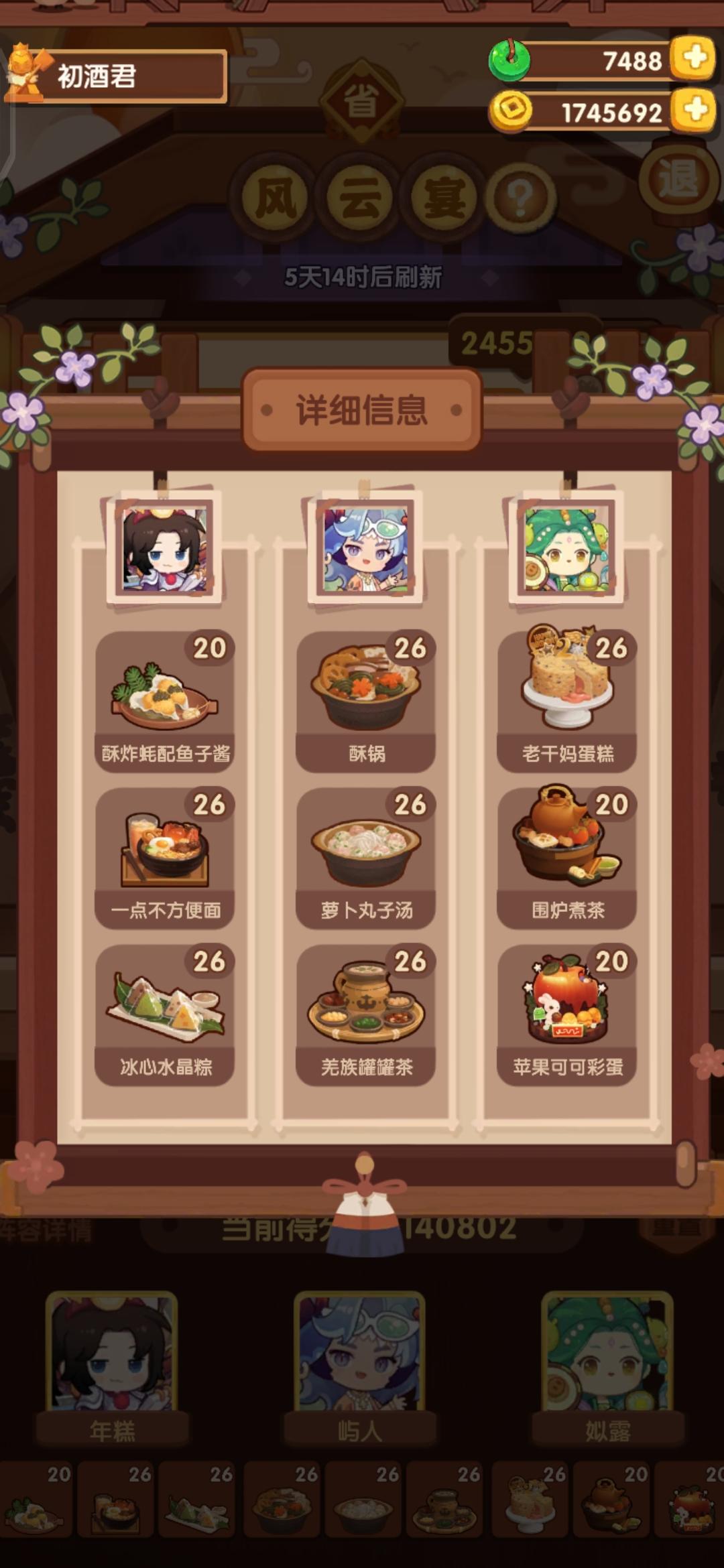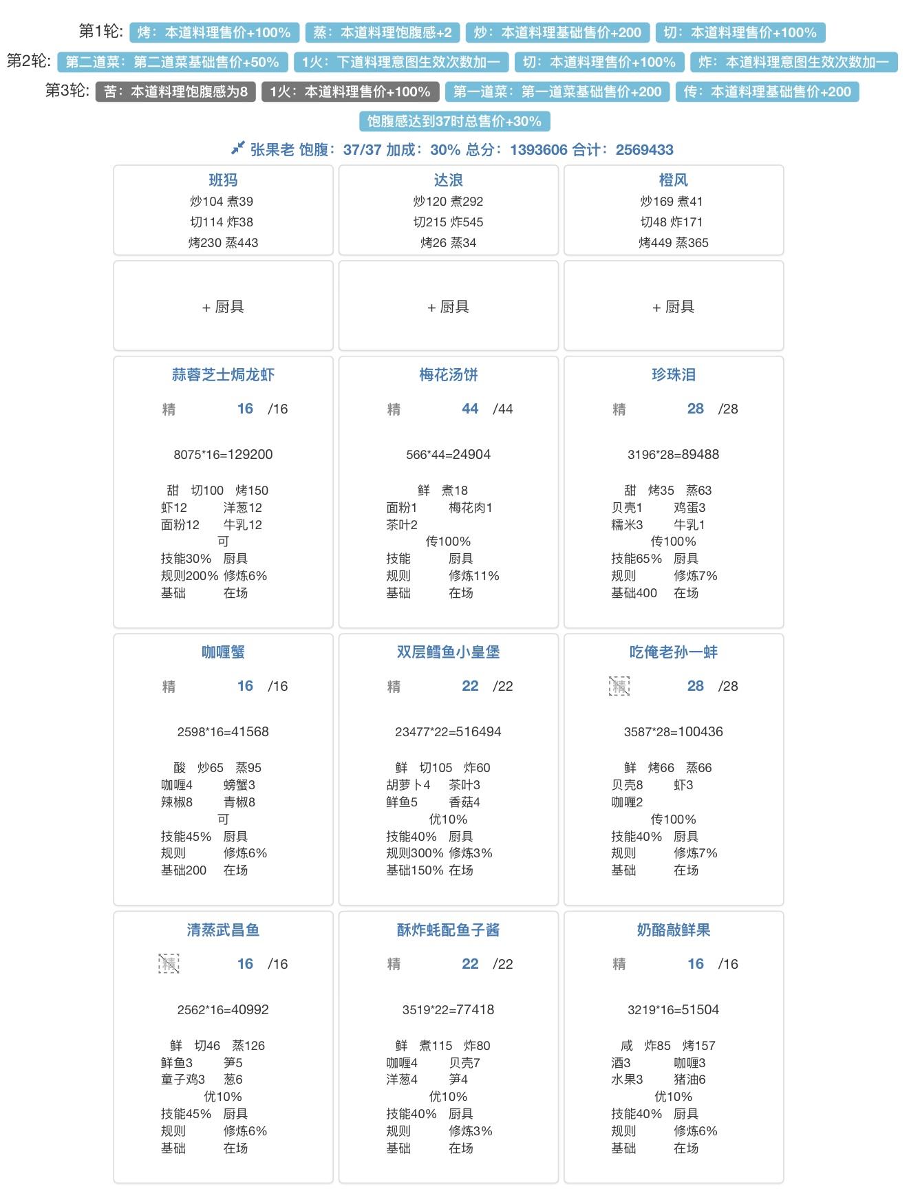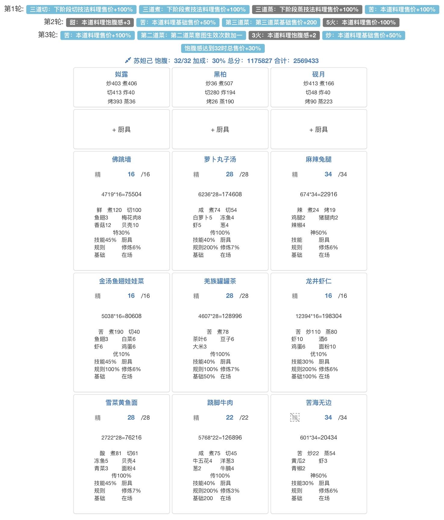 国际惯例的全员无厨具,修炼偏高,具体数值在P3。句茫、气仙人、尤伶有修炼。在修炼足够的情况下,红蟳米糕可换蒸汽石锅鱼,沙嗲拼盘可换风味塔可。没替换且全无专精的情况下总分2884862,替换了且全无专精的情况下总分2714107。有虹兔糖建议把宋书汐汐换成虹兔糖,第二道菜换蒜蓉芝士焗龙虾,分数会更高。