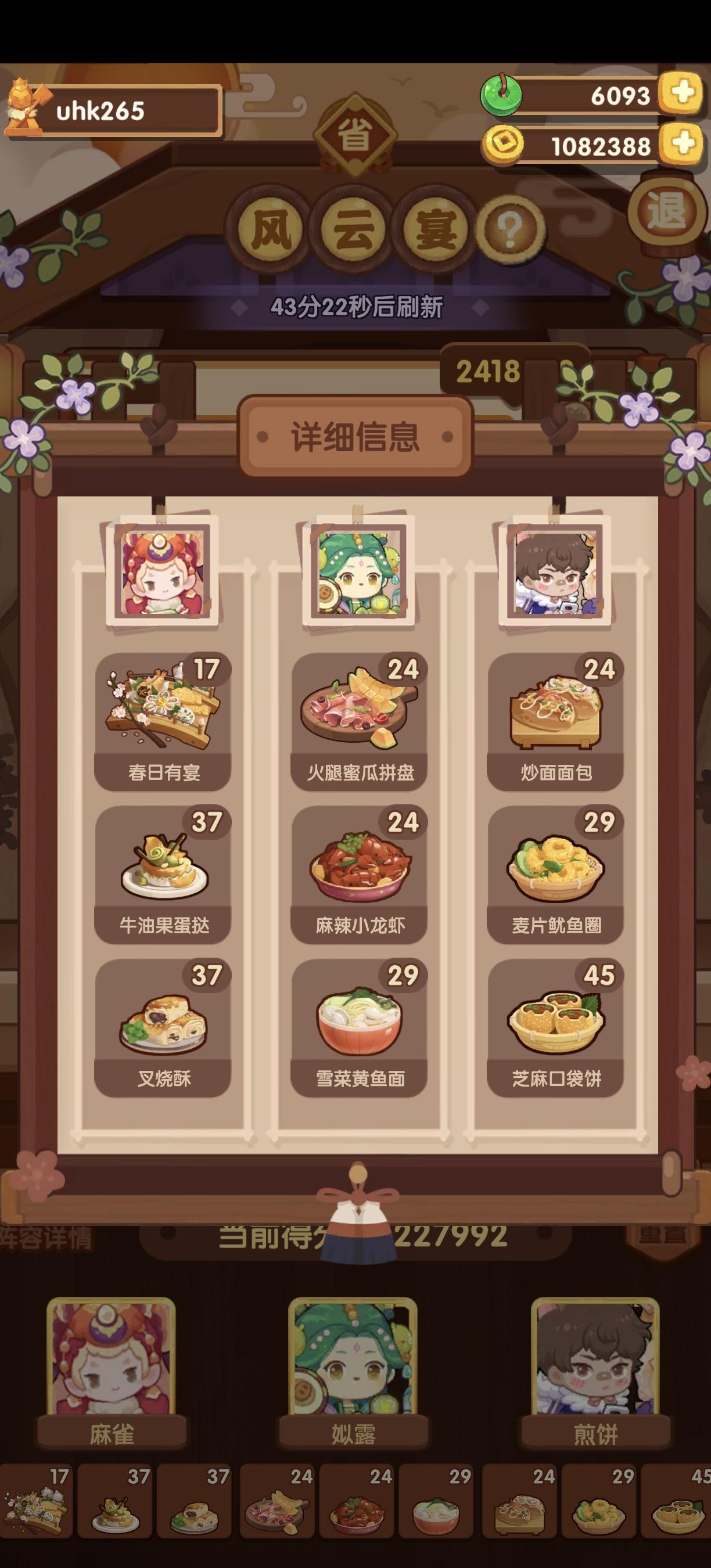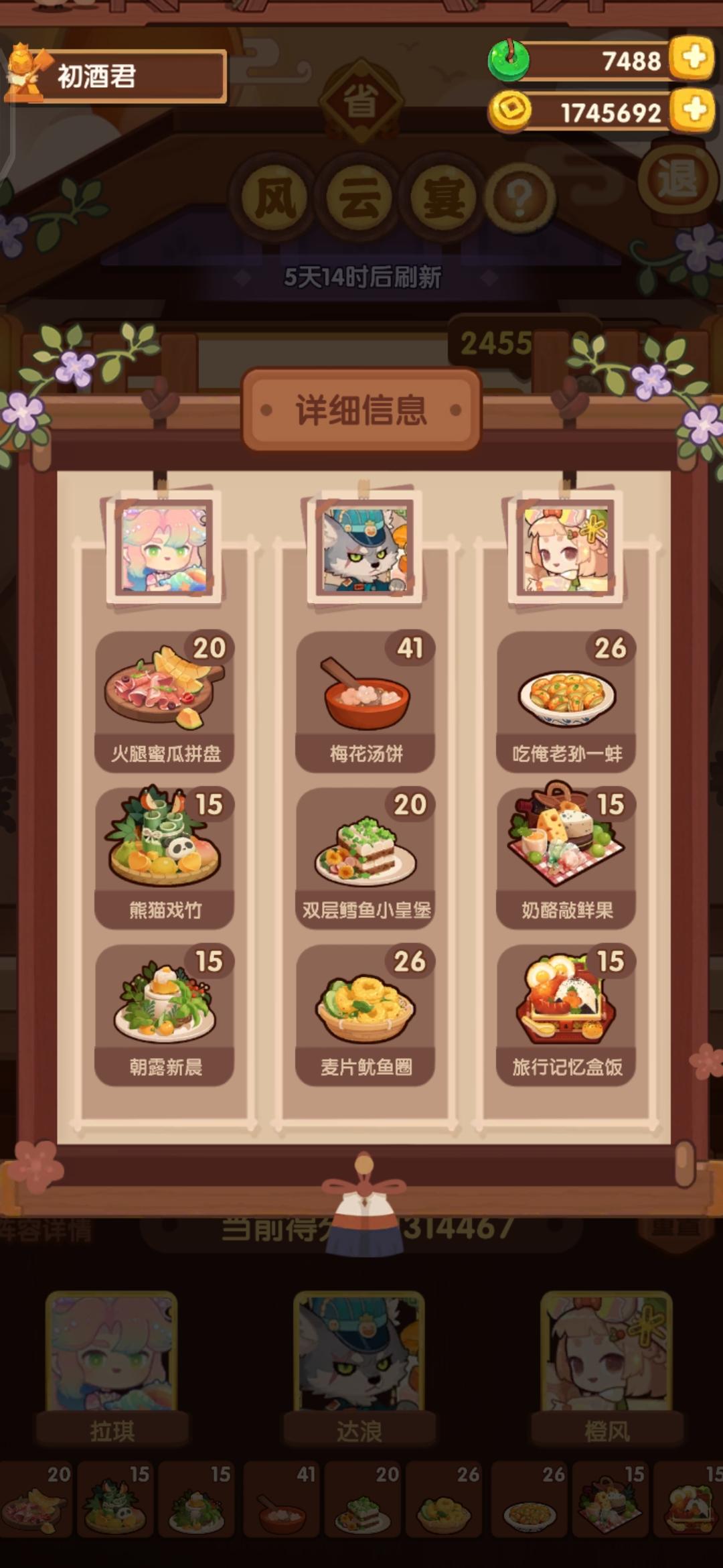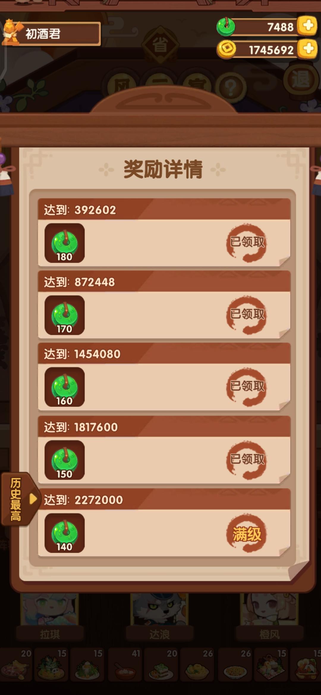 终于!拿满了!第一次!省级!作为一个167天的小萌新,在一次大意之下晋级了省级,从此过上了每周只拿三档510玉(难度大的宴会甚至只有二档350玉)的憋屈生活上个星期我努努力,换厨具换菜谱总算压线过了四档。当然,我知道这次宴会难度很低,下周宴会不可能这么简单,大概率我会重新回到三档,但是我还是好开心在此提醒卡在州4的朋友,这周宴会不要一时脑热晋级省,一晋级,后面的宴会难度上来了,奖励就会少(血