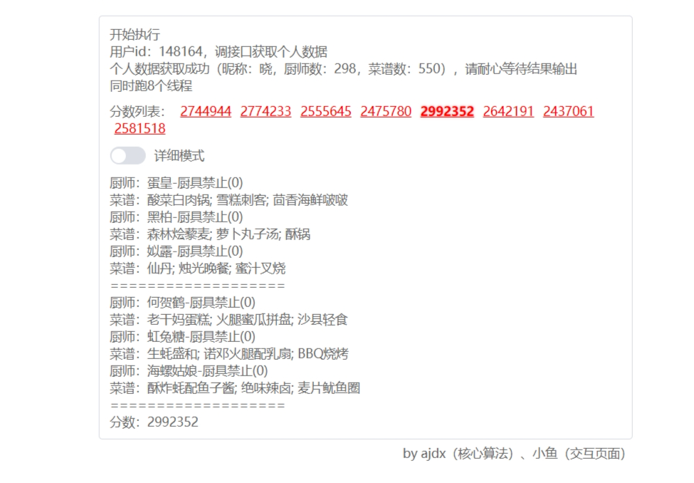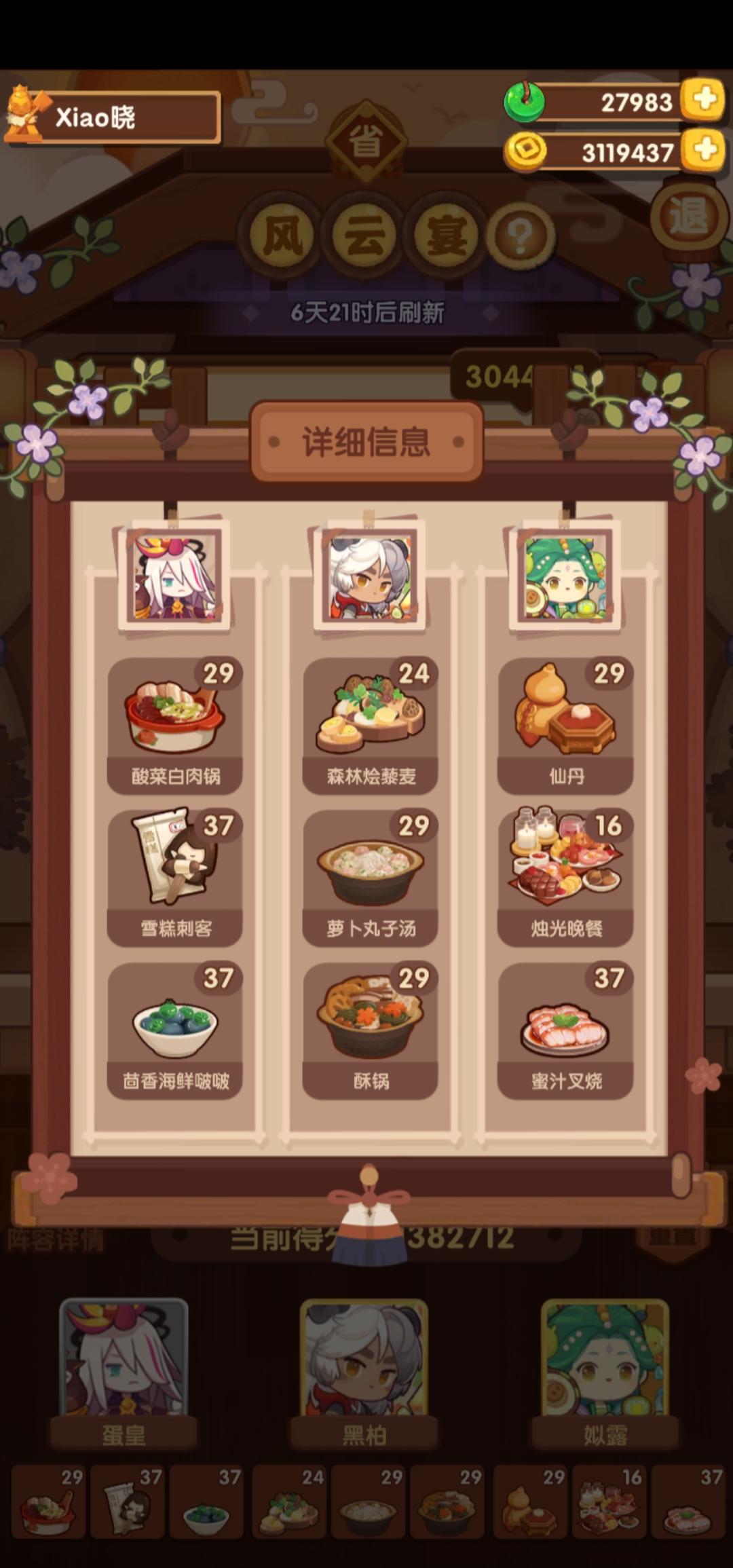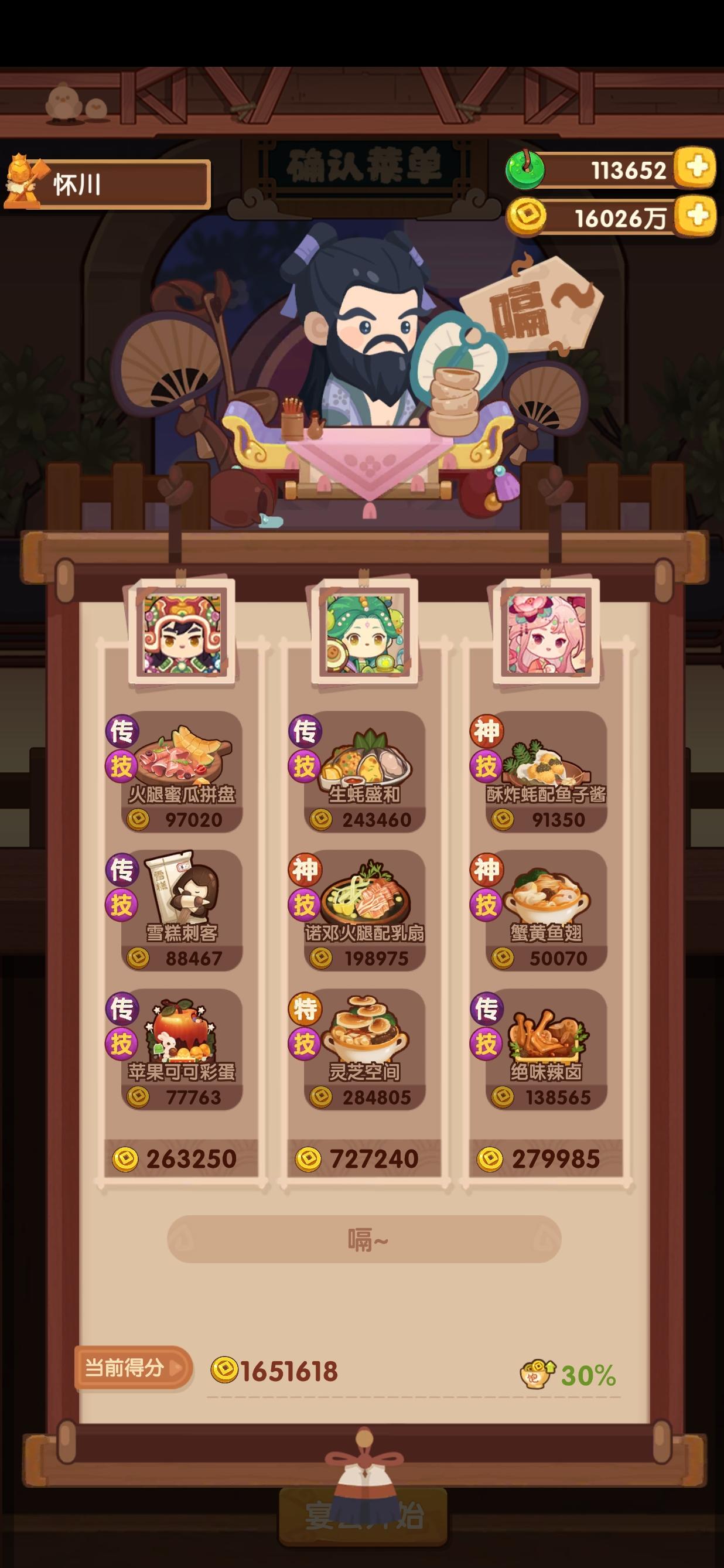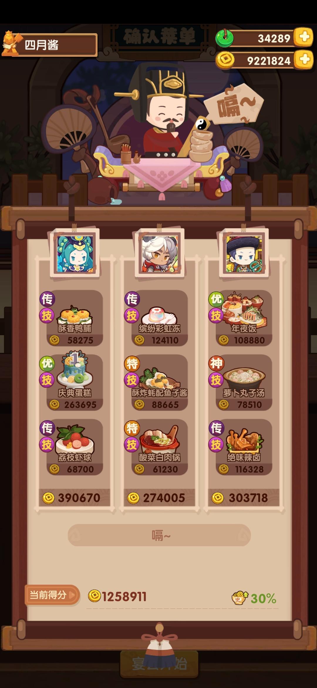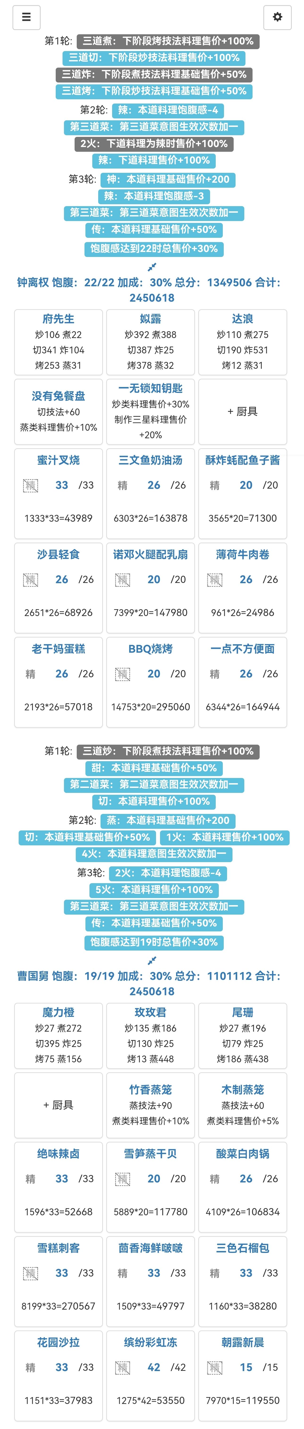 我的思路是先用计算器跑一个差不多分数,再试厨师和菜来凑分(如图一)复刻抽完桃花池,没有炒鳝糊的可以用冬阴功汤,分数差不多的(别的也可以试试)图二只有老干妈/蛋糕,蟹酿橙专精;图三也只有一点不方便面,麦片鱿鱼圈,荔枝虾球专精,没有专精的话这几天可以刷刷看图四是基修,不算高,影响不大煎饼:一无锁知钥匙,炒+30%,三星+20%姒露:豪华甜品架,切+30%,三星+20%墨雪:南玉足印,切技法