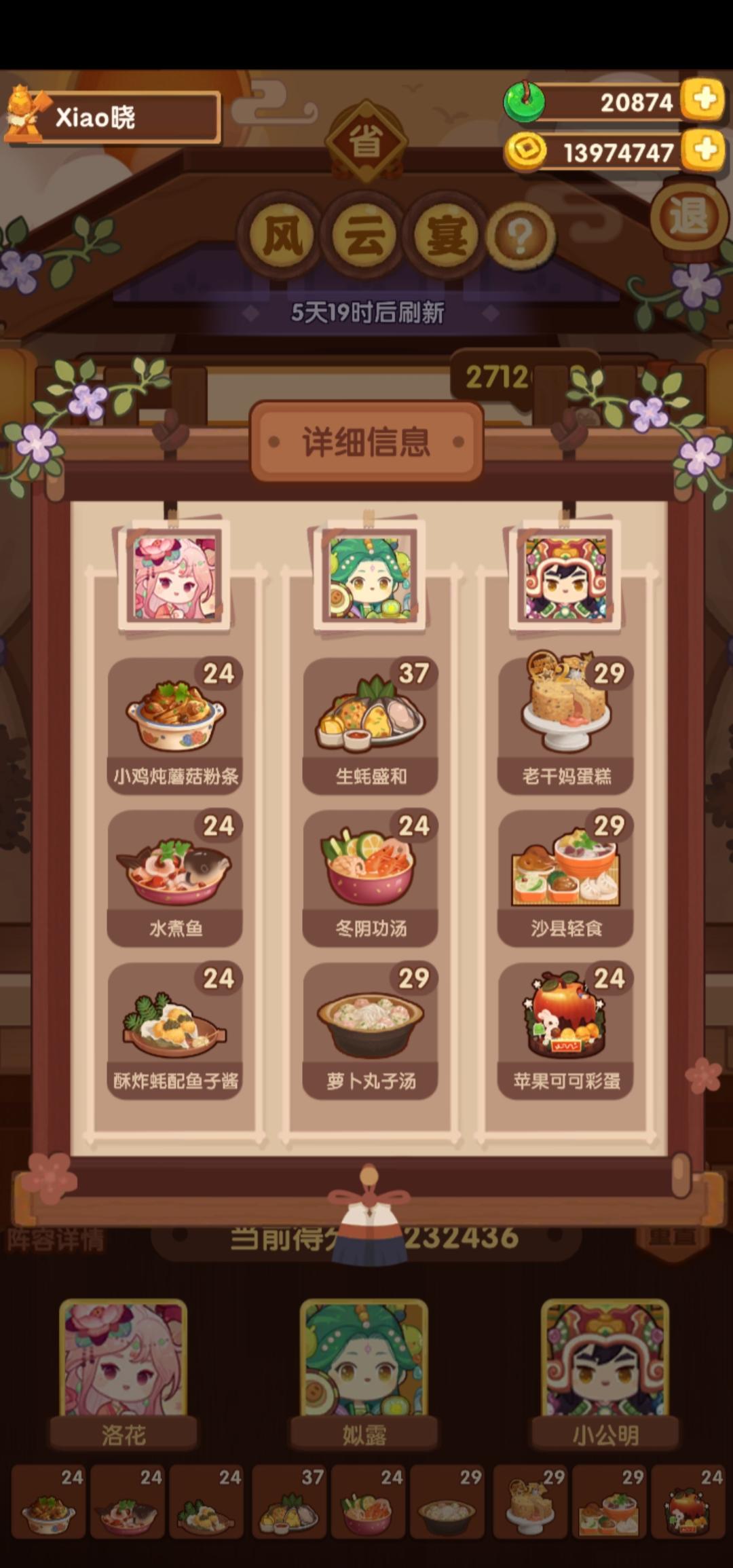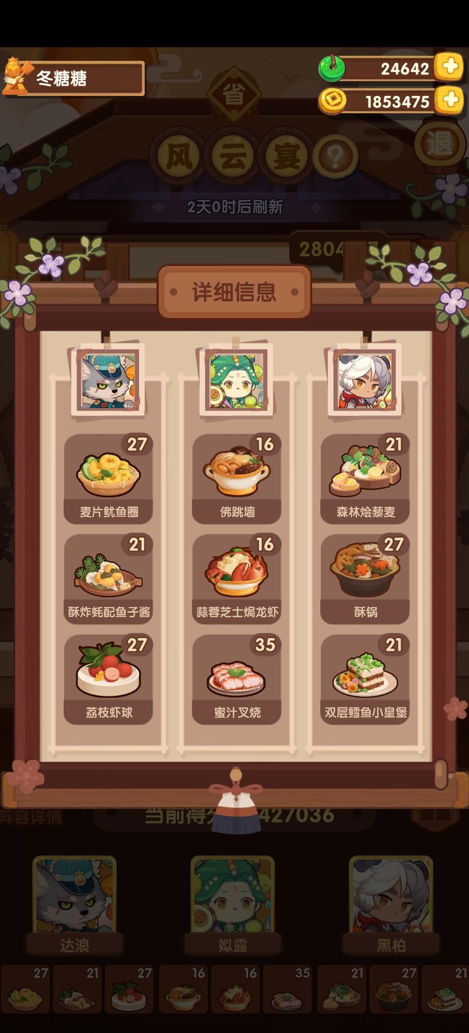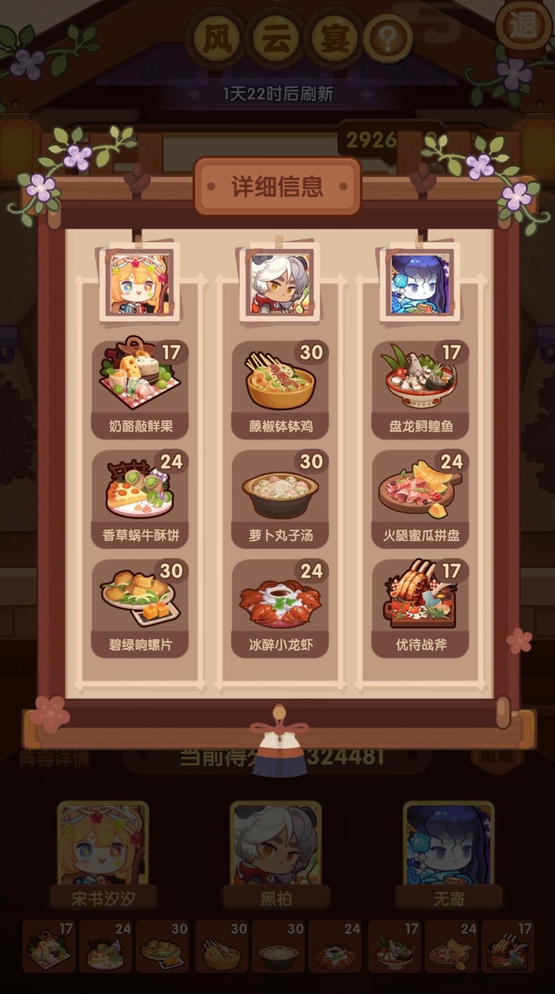 前排提醒①本次宴会较简单,喵喵萌新能冲五档⭐️该方案基修达20左右即可。⭐️4星上限≥2随便炒方案,可稳过。⭐️4星上限=1可以靠大量专精弥补。(差5万左右)⭐️更低基修情况请自行调换更合适的(高分菜谱,高分厨师)。