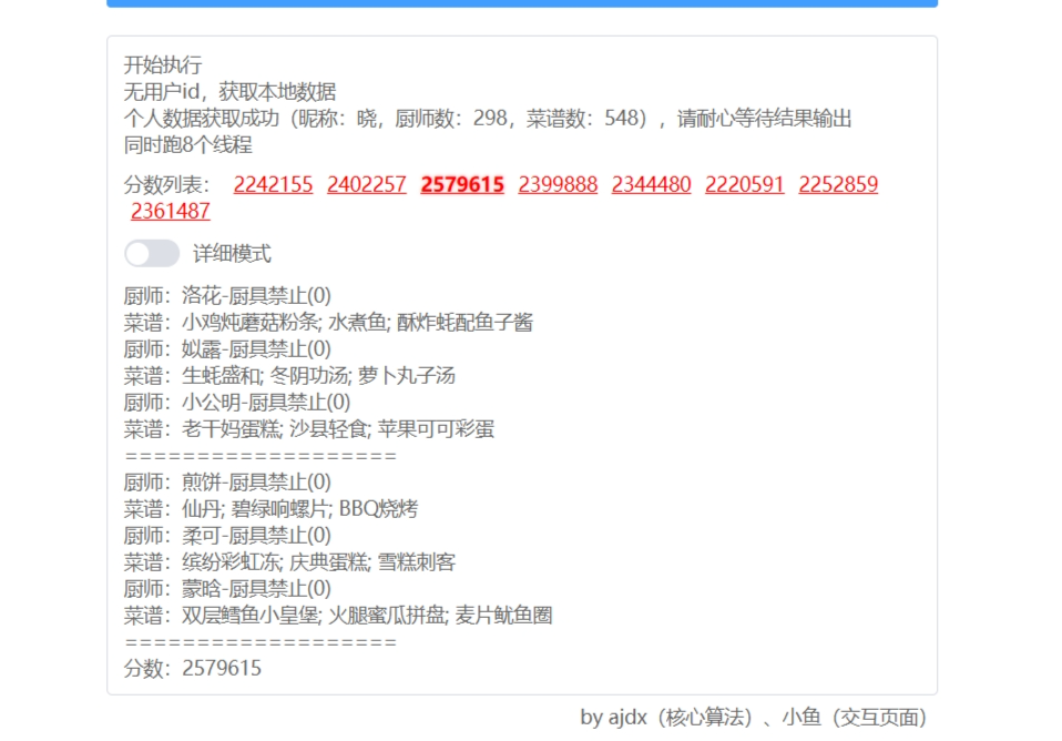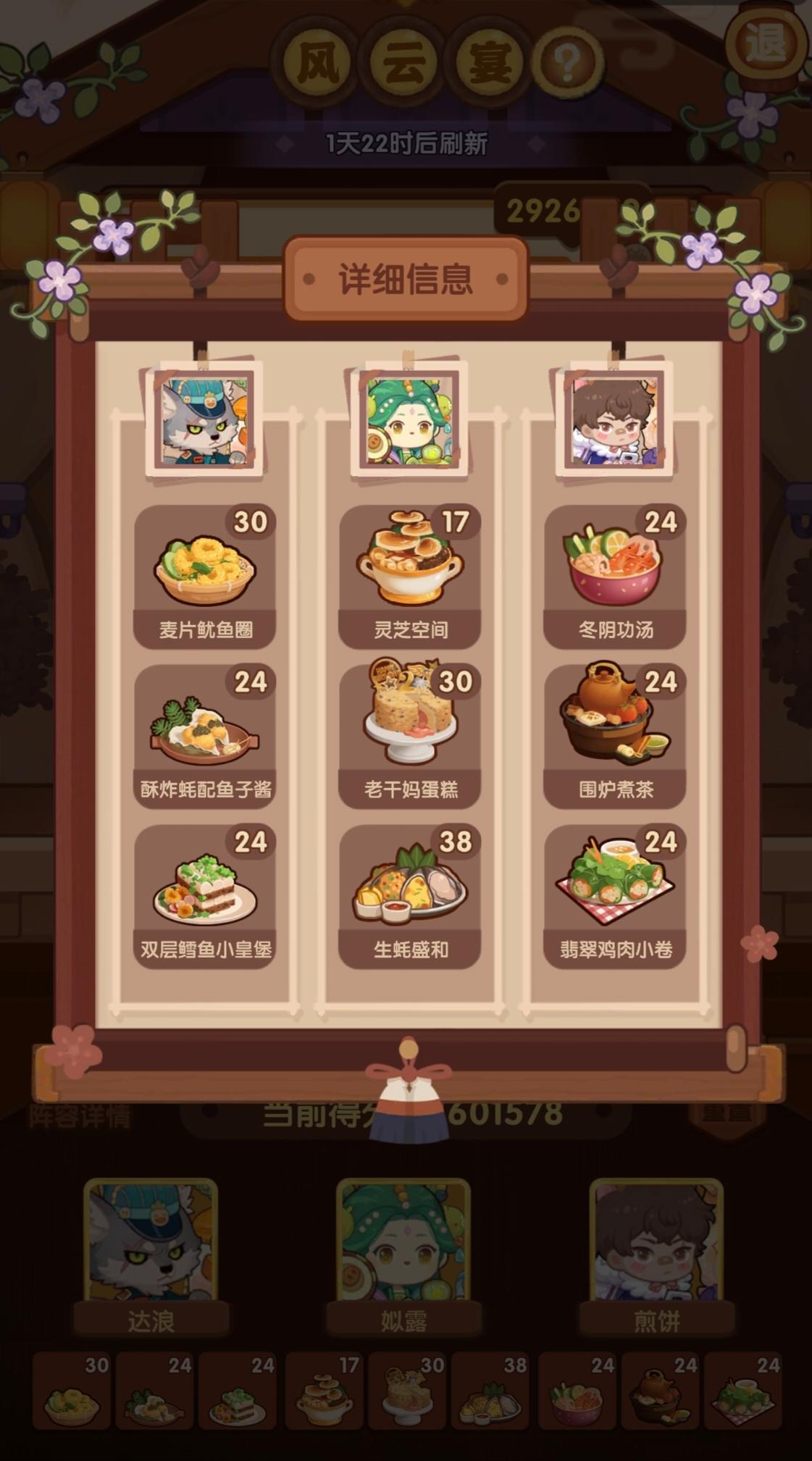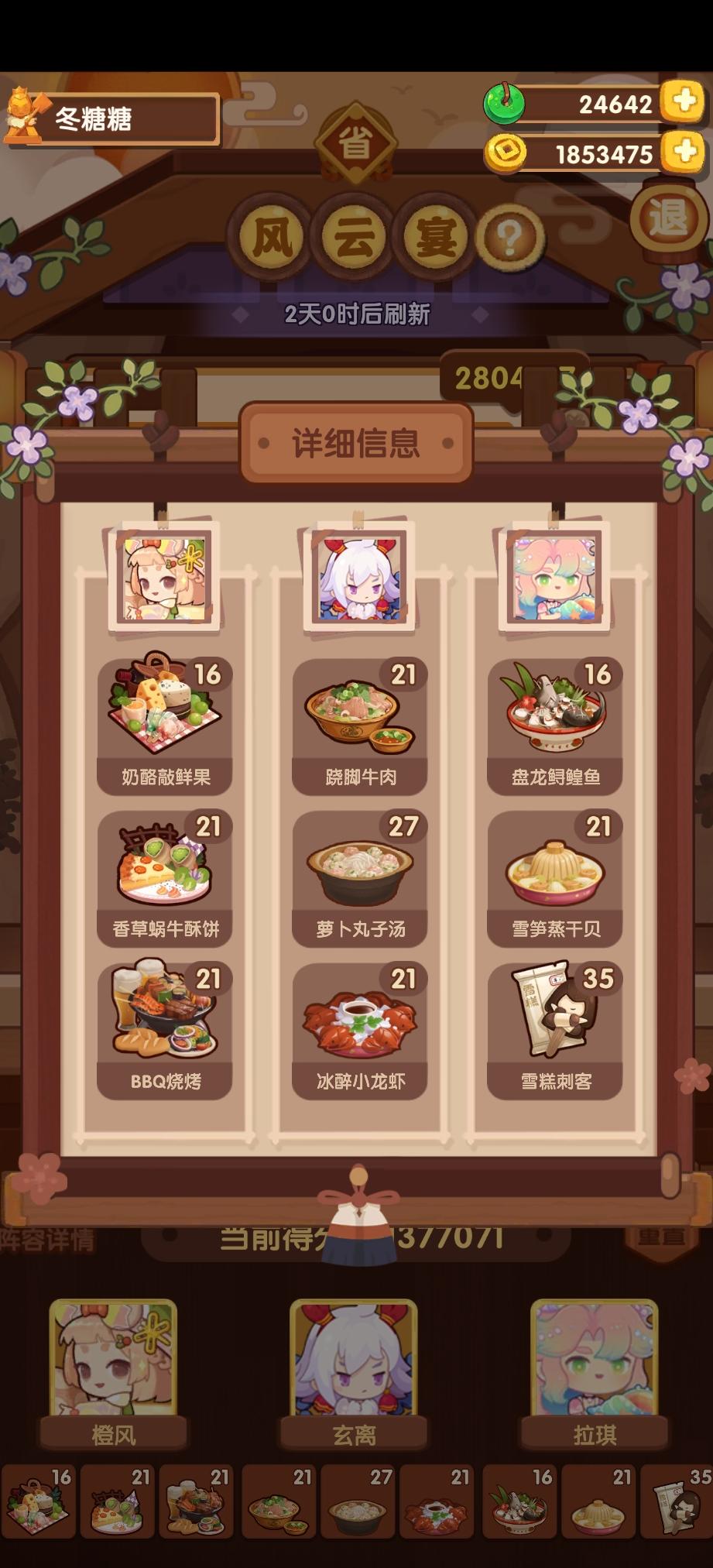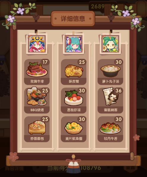 国际惯例的全员无厨具,修炼偏高,具体数值在P3。玉涂有修炼,小公明有修炼但不影响第三棒结果。罗勒青酱面可替BBQ烧烤,老干妈蛋糕可替沙县轻食。替了且无专精的情况下总分2660354,不替且无专精的情况下总分2673224。