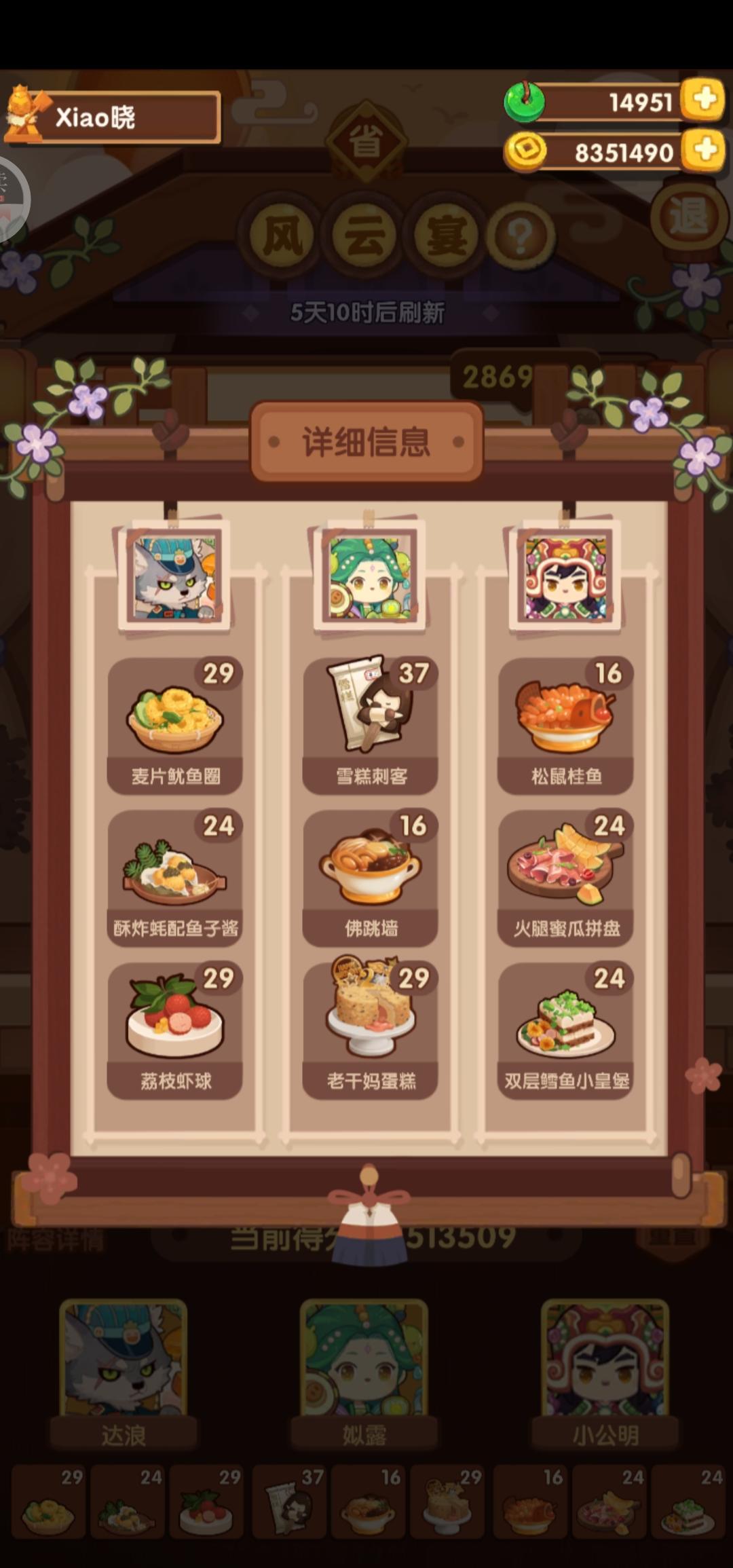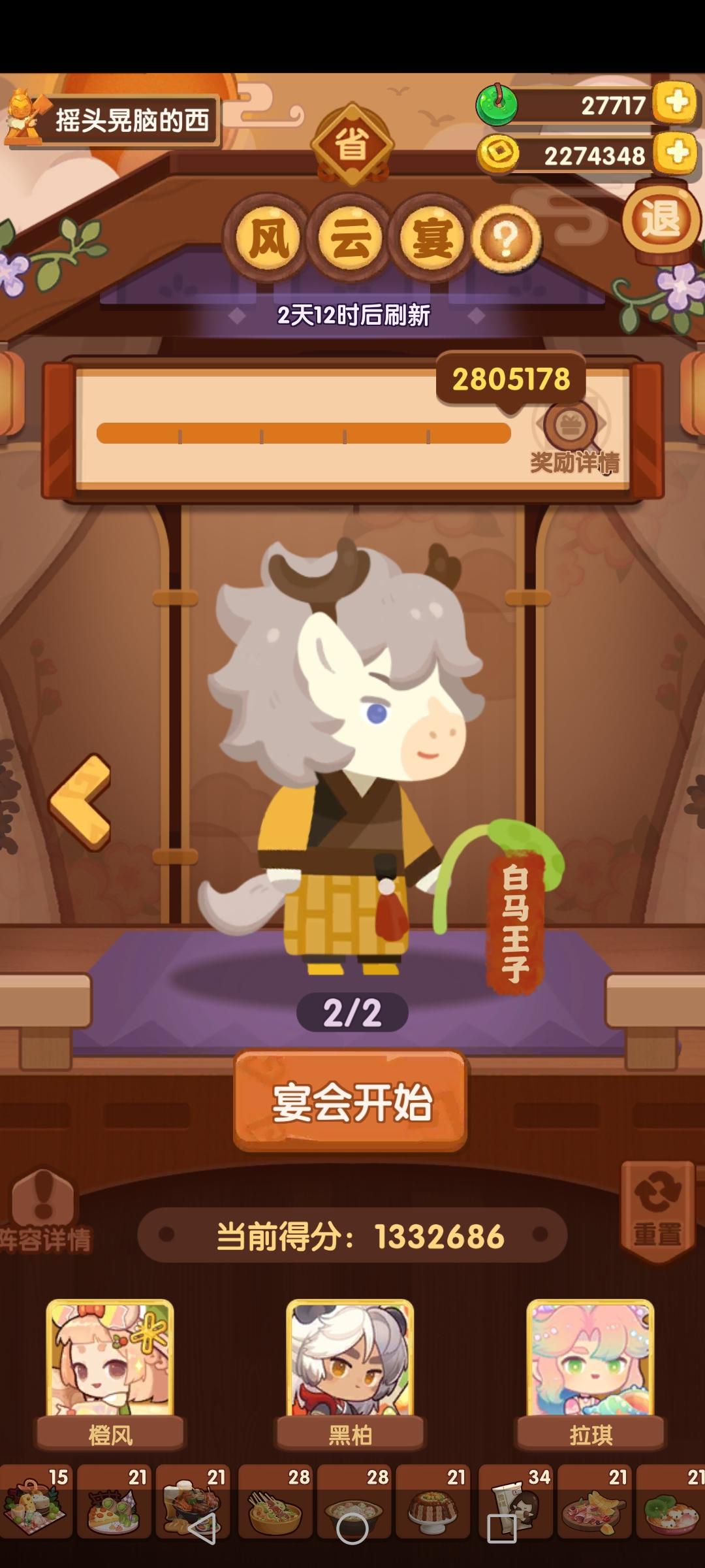 前排提醒①本次宴会,喵喵萌新能稳4档,5档需要一定的基修,菜谱上限等等。⭐️本人基修均40+,若4星菜谱上限<2则可能分值差距较大,≥2尽可尝试;若专精和基修,厨具等情况较好,则4星上限=1也可以尝试⭐️若4星上限=0则建议稳4档,4星上限≤2,更推荐看这个方案,分能高10万左右https://www.taptap.cn/topic/25891565?share_id=02e3124625