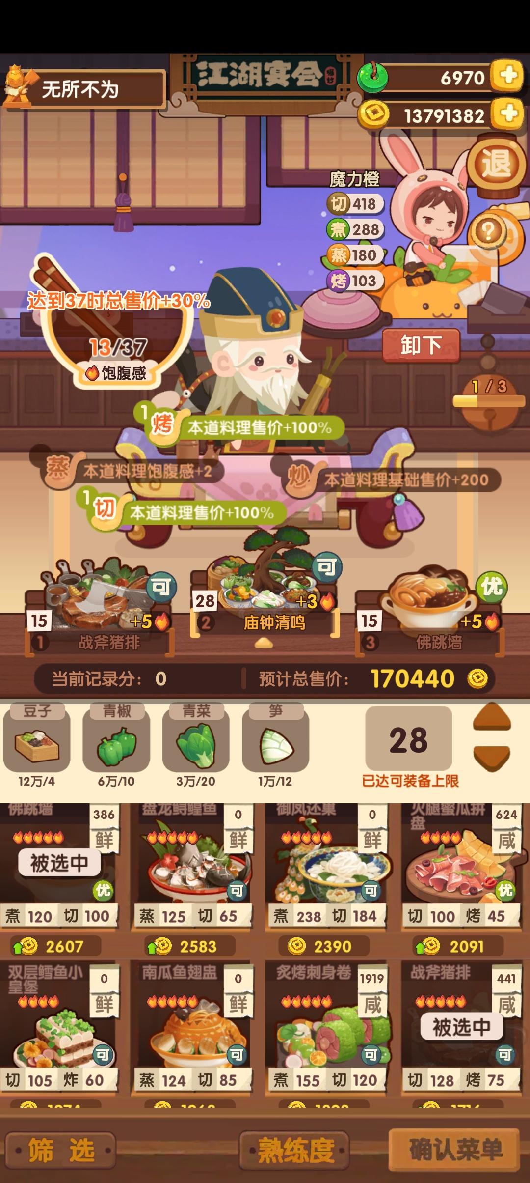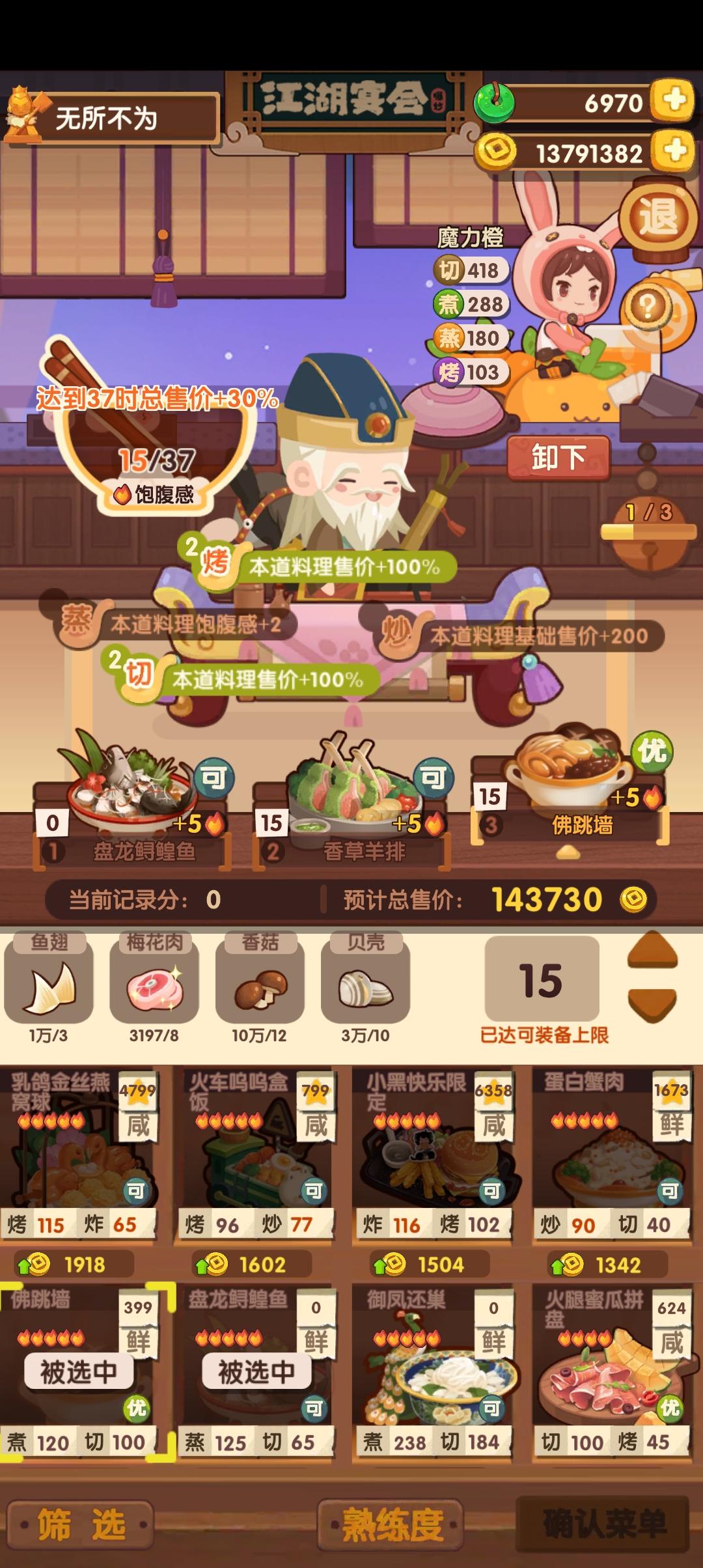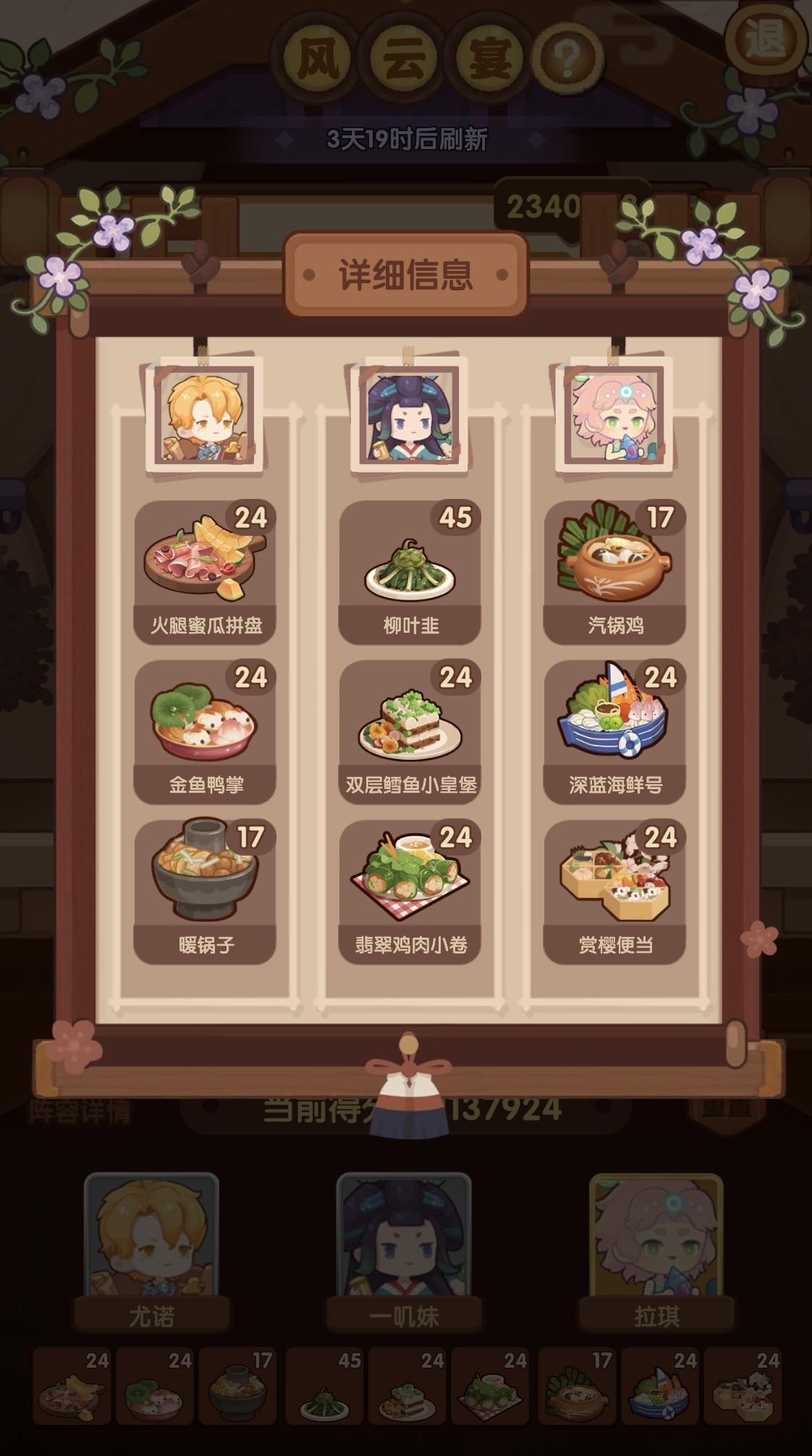 前排提醒①本次宴会较简单,江山萌新及之前应该是稳过五档的。②喵喵萌新可 随便 用P1-2方案,江山萌新可 尝试 用P3-4方案,(失策)P3萝卜可以换沙县或老鸭,但是得多靠其他方面补点分,比如达浪用一无锁有加双层鳕鱼专精就能过线③菜谱,厨师,厨具,专精有限,大伙可以到图鉴网自行调换更合适的。
