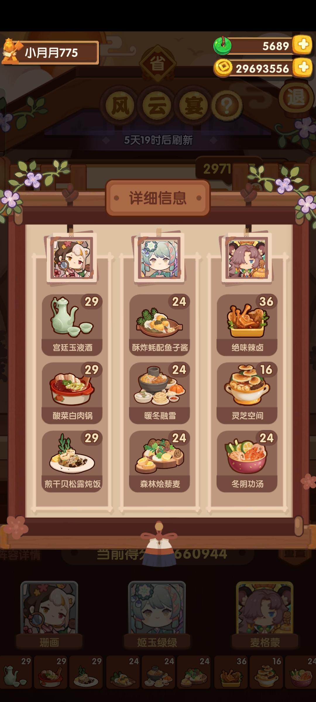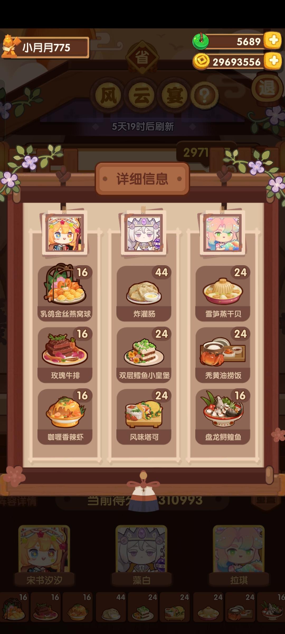 这周难度满低的,满档作业应该挺多,比我低配的应该有不少,因此仅供参考。修炼偏高,具体数值在评论区,全员无厨具,句茫、珊画有修炼。全菜无熟练的情况下总分2931214。