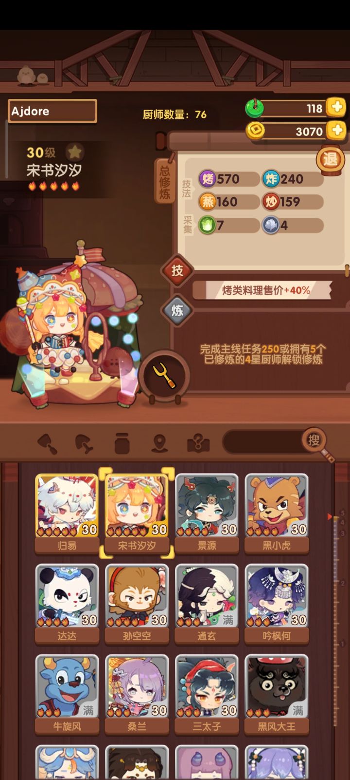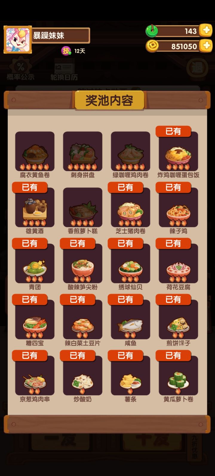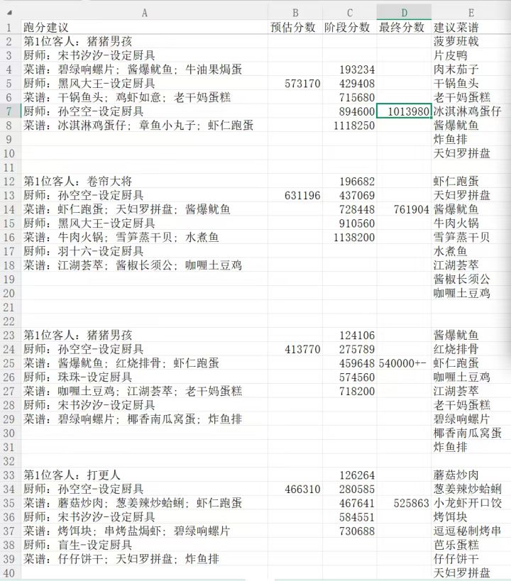 73天萌新,充了3个6块,今天补了个月卡,跟七侠一起出那个池、新手池、中级池(菜+厨)搬空了,高级池只抽了一次百发只拿了个2火菜(1/35就离谱!)……风云宴之前是一直点晋级的,直到郡级(前一个应该是县,后来的萌新到这儿就先别晋级了),亏了一个档位的奖励四次,今天终于跟县级的满档奖励持平了(大概是吧)。用跑分直接设定成下一级的满分,记录一下方案,多跑几遍挑选几种思路进行修改,因为新厨子和新菜没