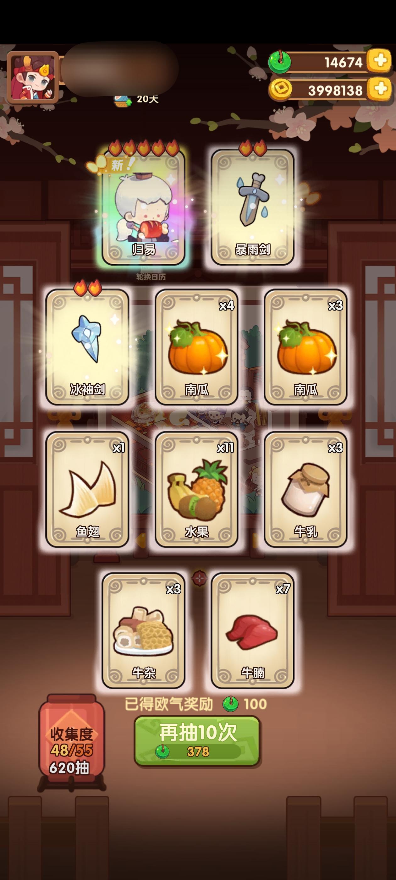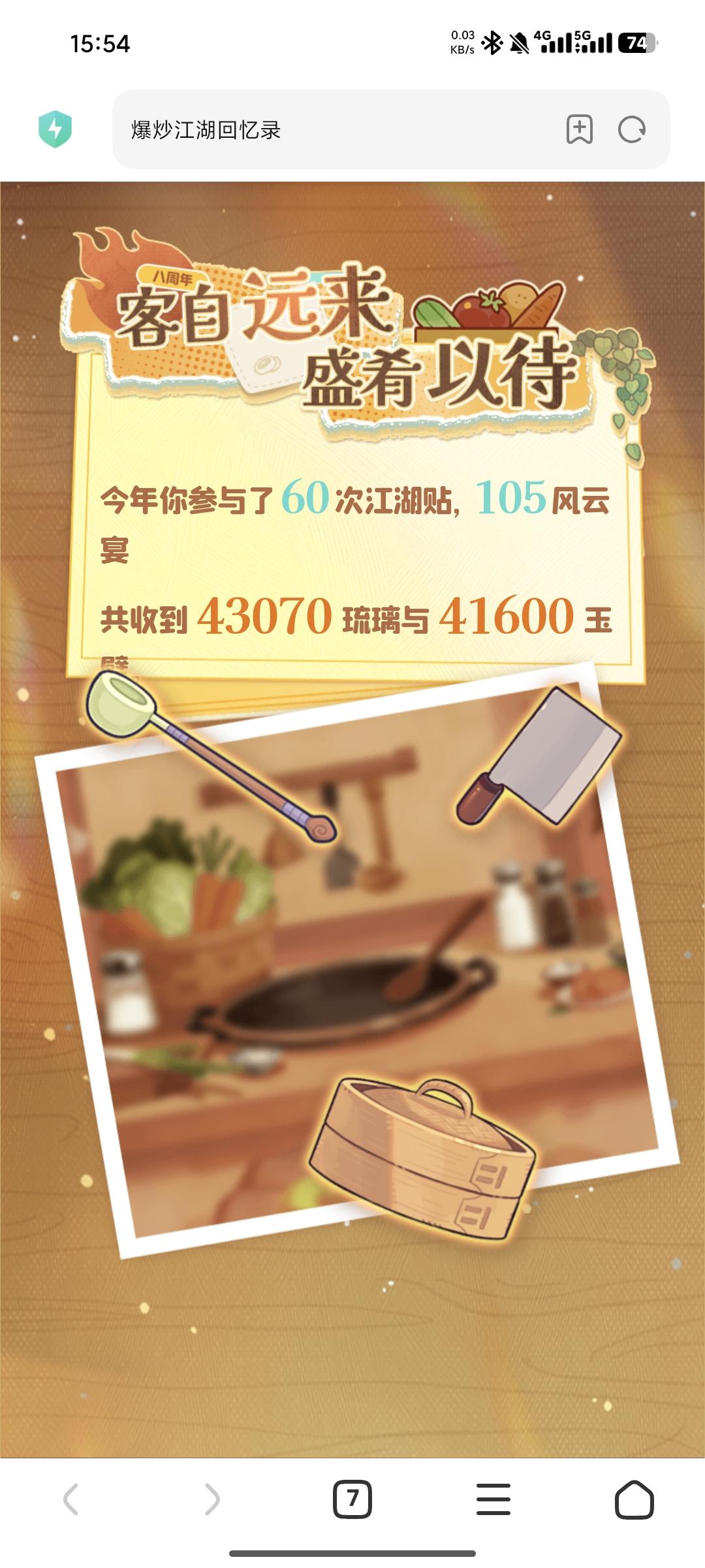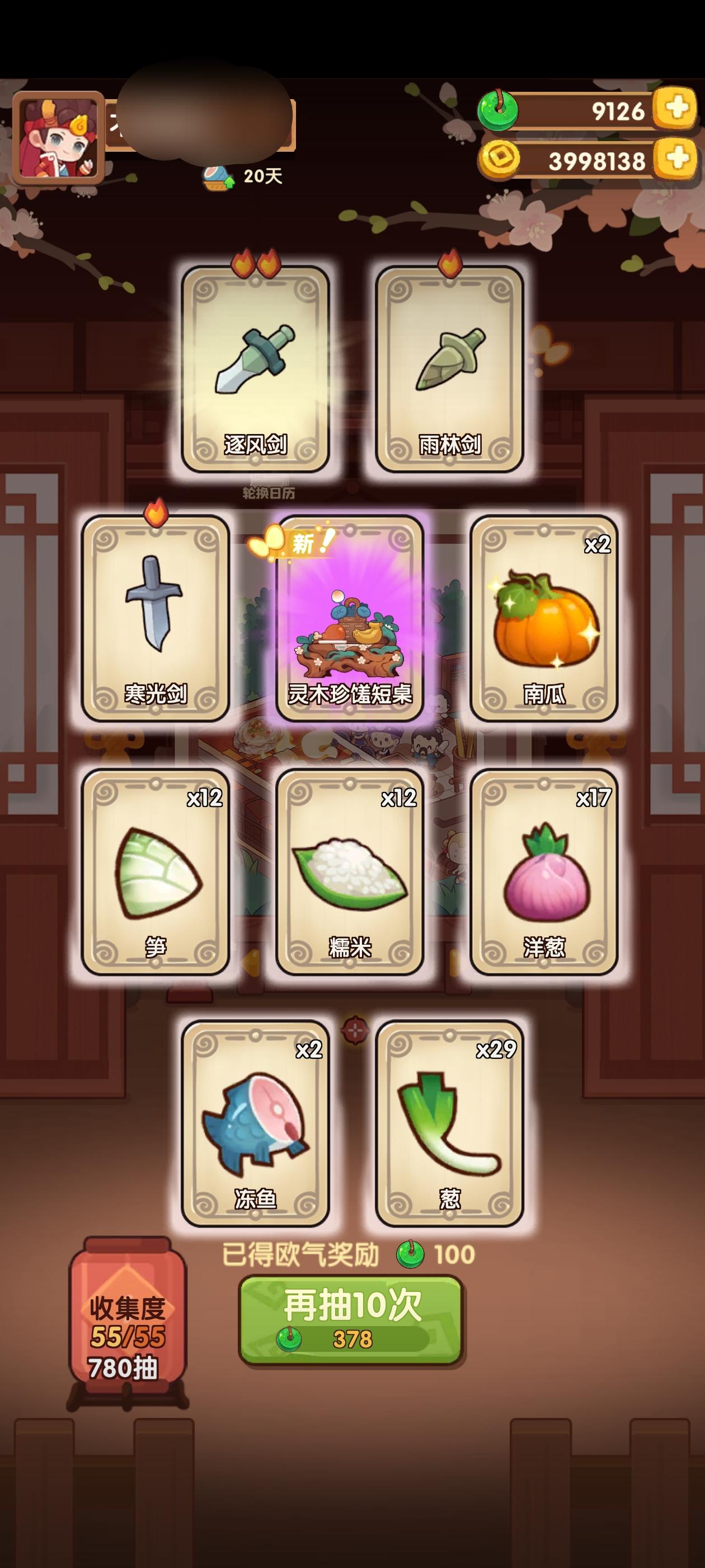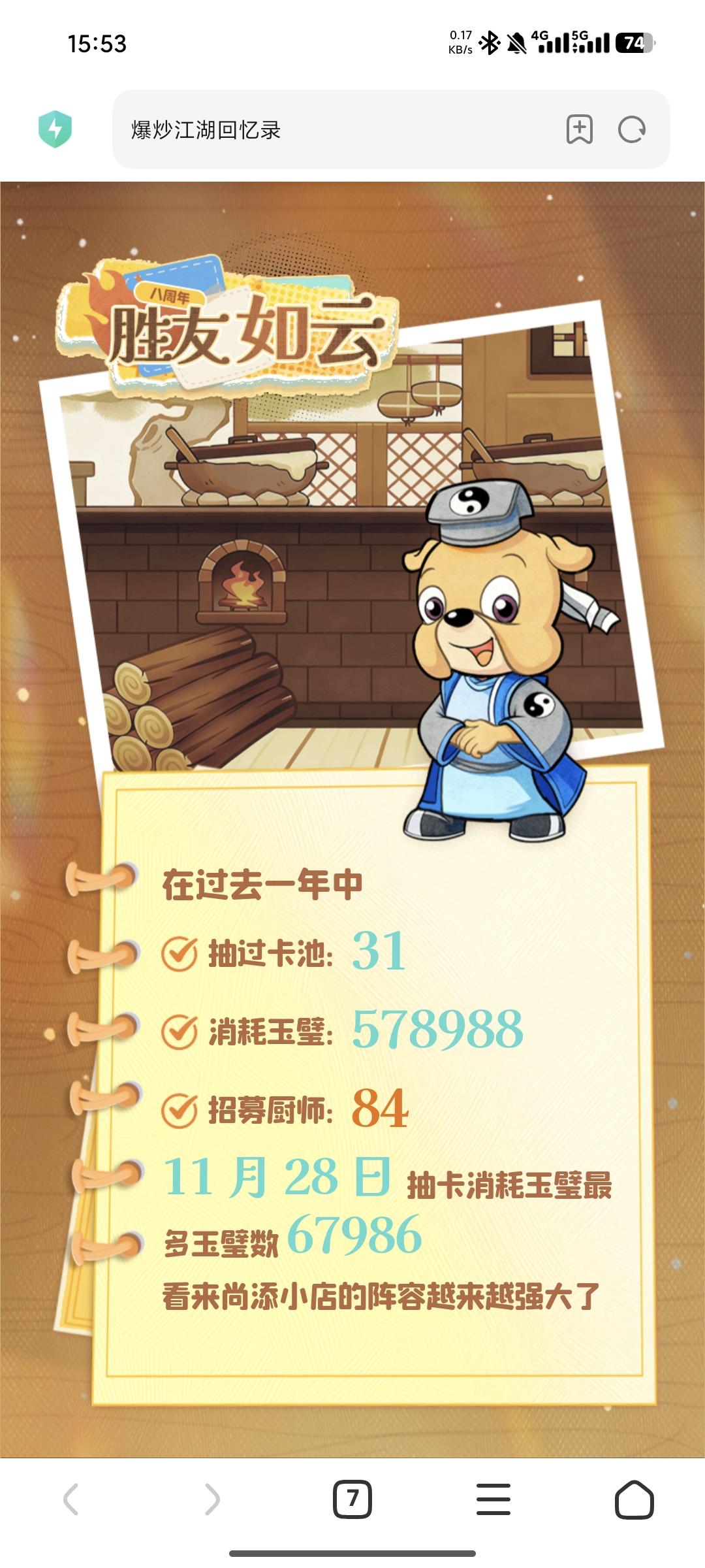 抽的时候好几次出两个家具还心疼每次亏100玉,结果看了论坛发现自己抽完算是比较提前的了。53出菜,62出厨师,当时只剩一菜一厨和家具了,68抽完所有菜和厨师剩3家具,78毕业。爆炒江湖八周年快乐!