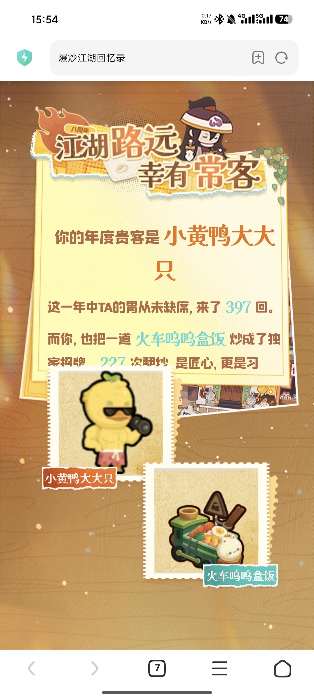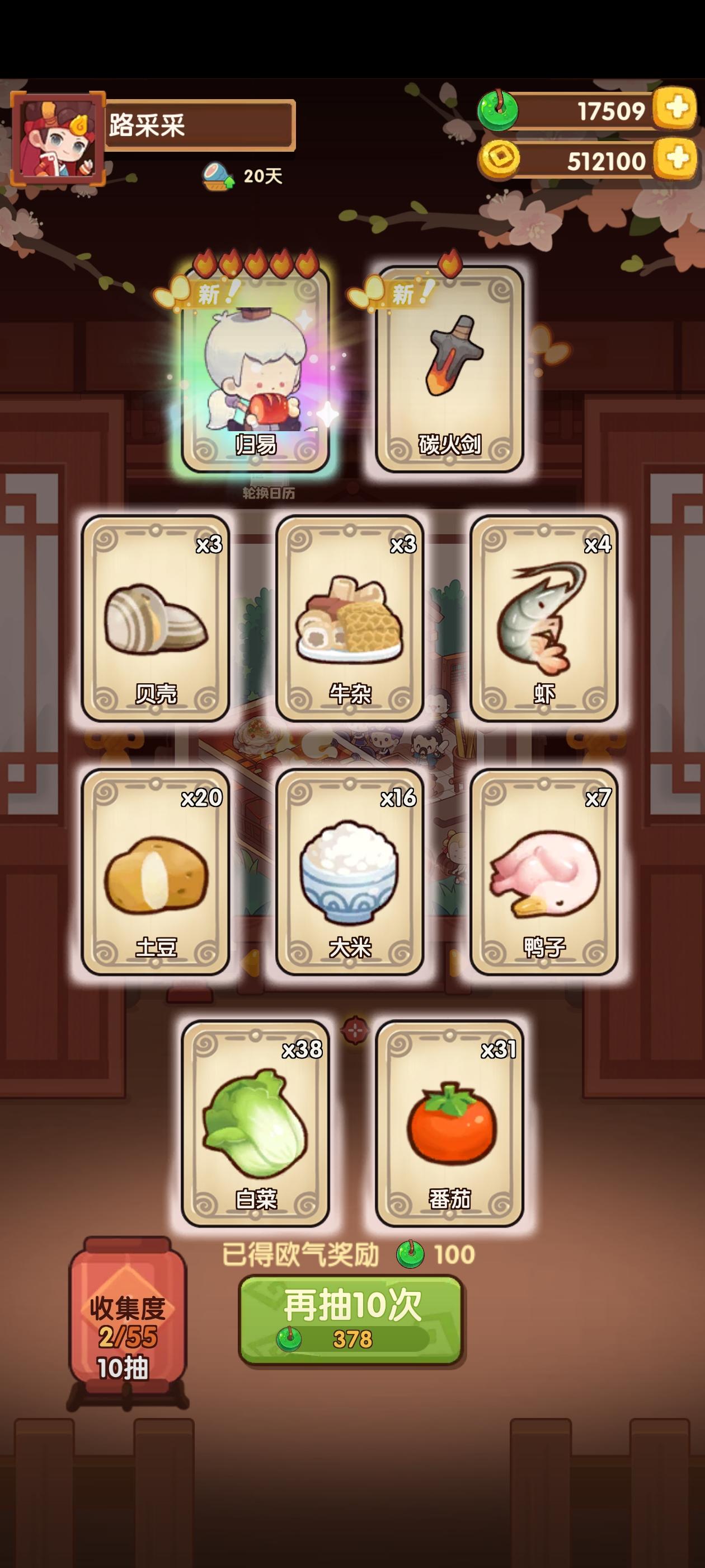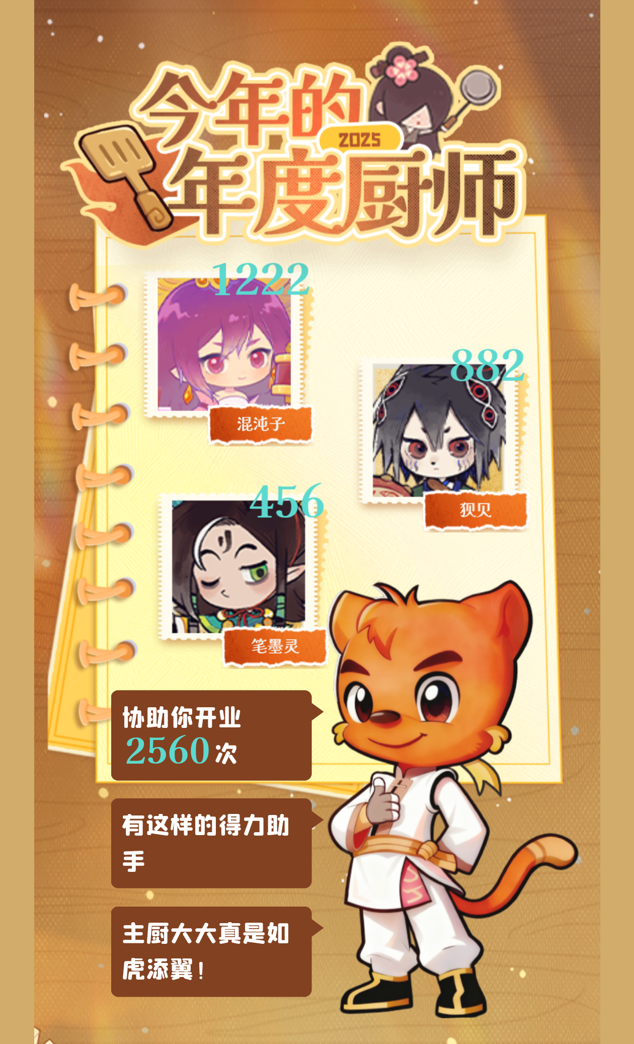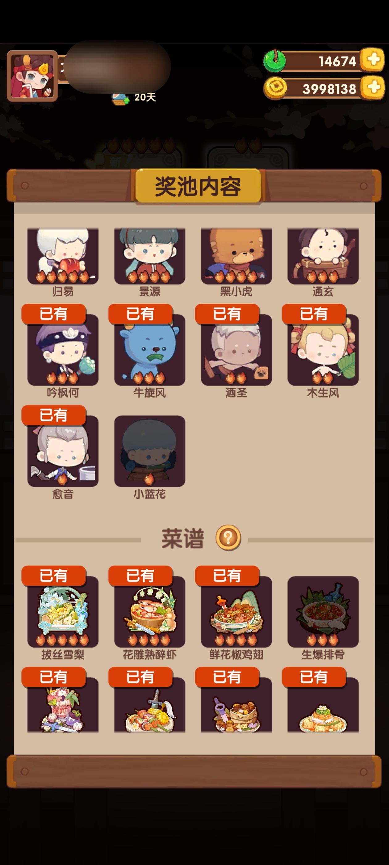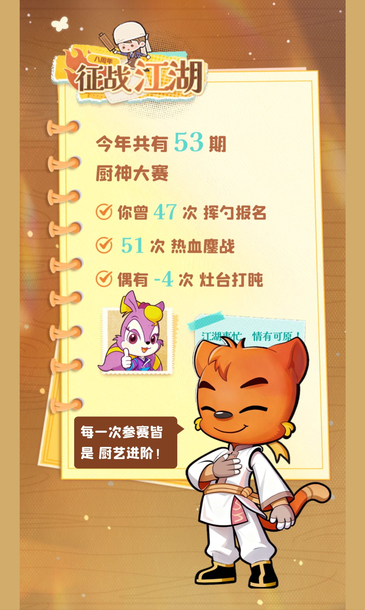 抽的时候好几次出两个家具还心疼每次亏100玉,结果看了论坛发现自己抽完算是比较提前的了。53出菜,62出厨师,当时只剩一菜一厨和家具了,68抽完所有菜和厨师剩3家具,78毕业。爆炒江湖八周年快乐!