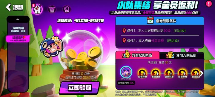 组小队,50级后领300点券活动还有一个位置,氪了超级通行证(30)的,和我说拉你进来